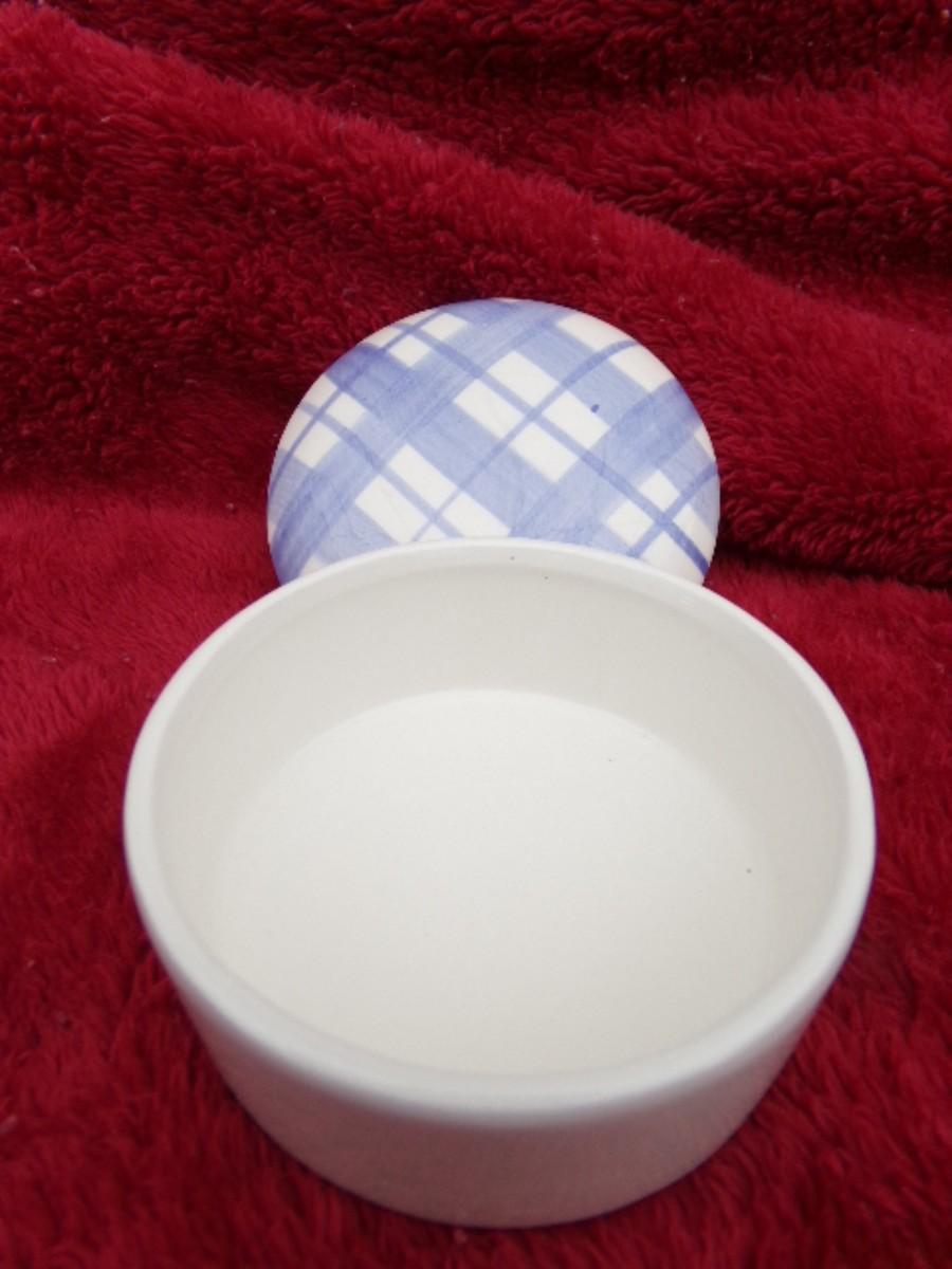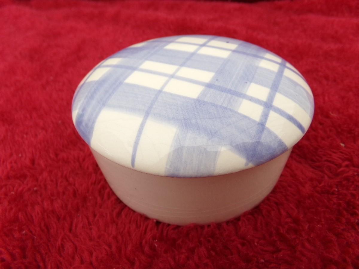Cercamic covered keepsake container. About 3-1/2" diameter
