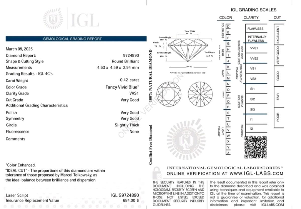 Cert 0.42 Carat Vivid Blue VVS1 Round Brilliant Natural Enhanced Diamond 4.63mm