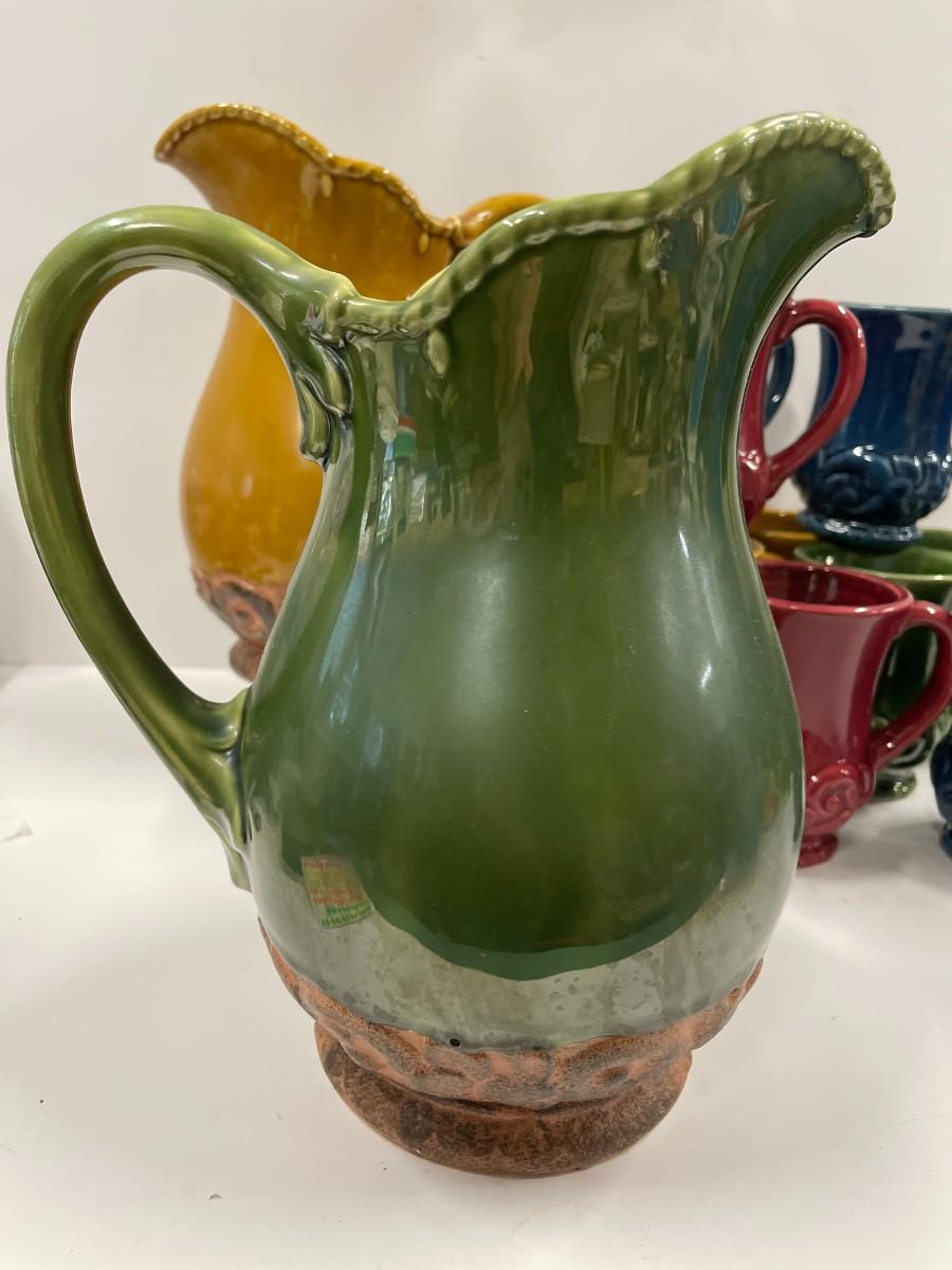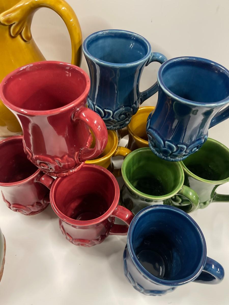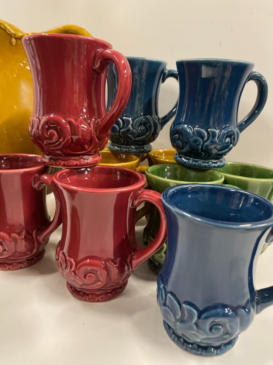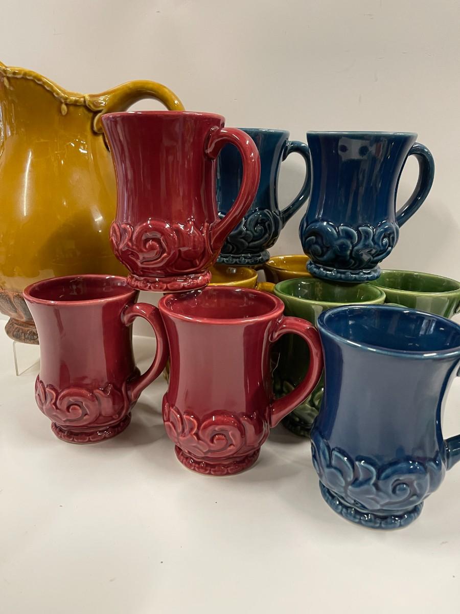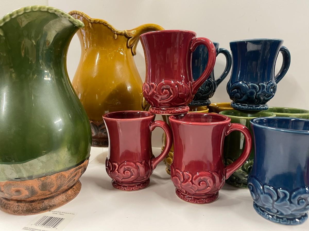 Certified International Florentine pattern ceramic pitchers with 11 mugs. Excellent condition.