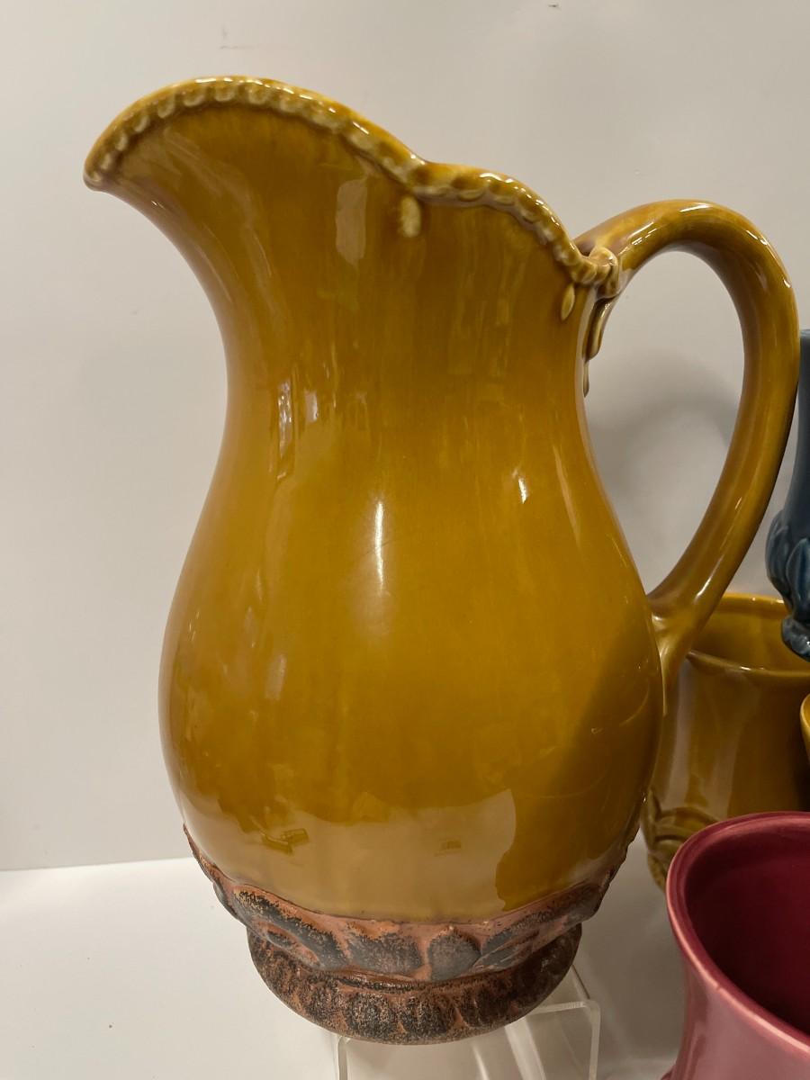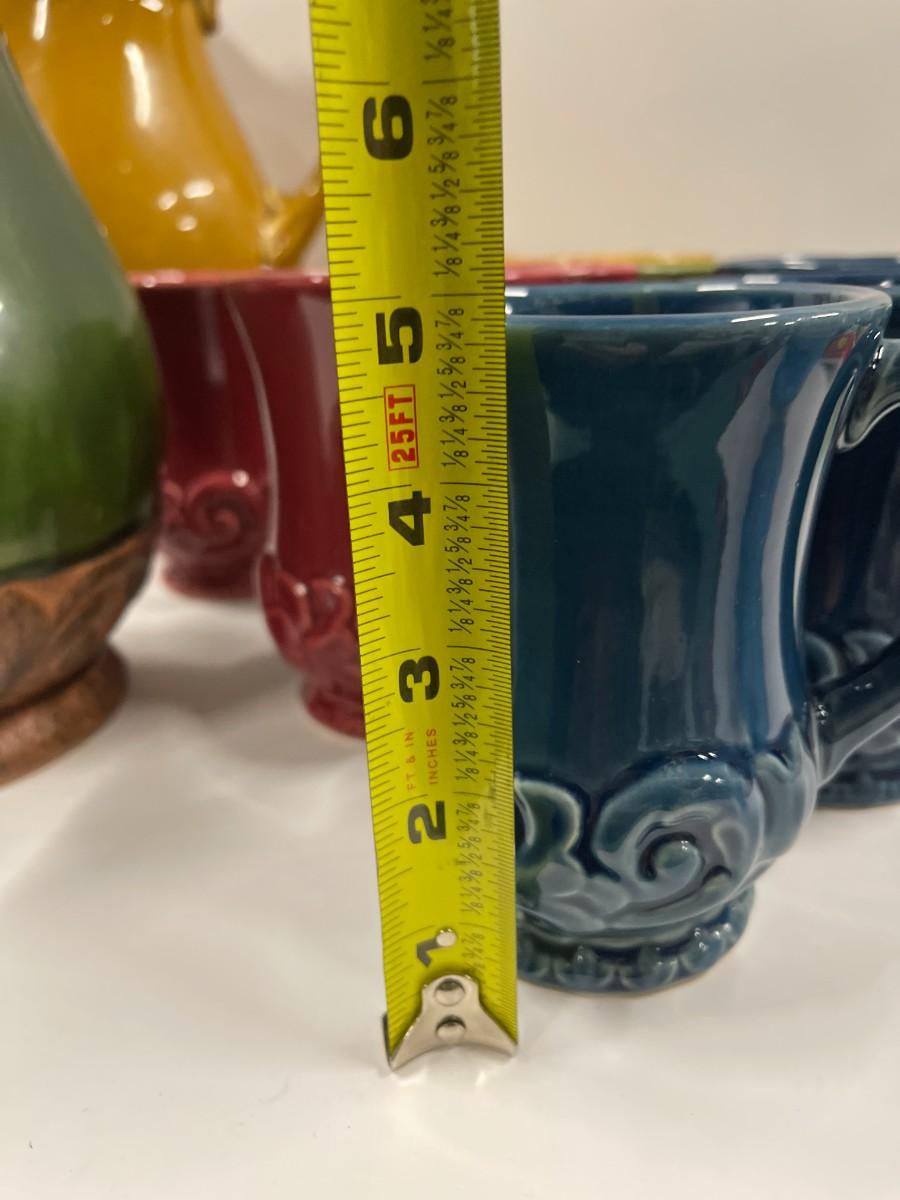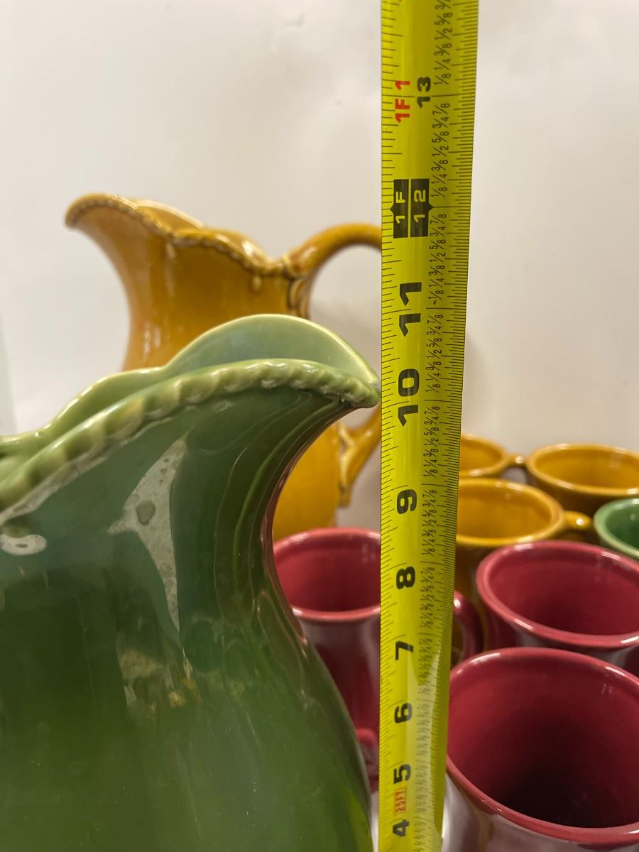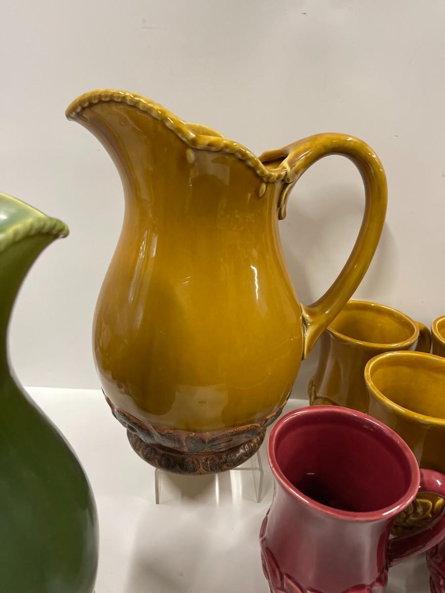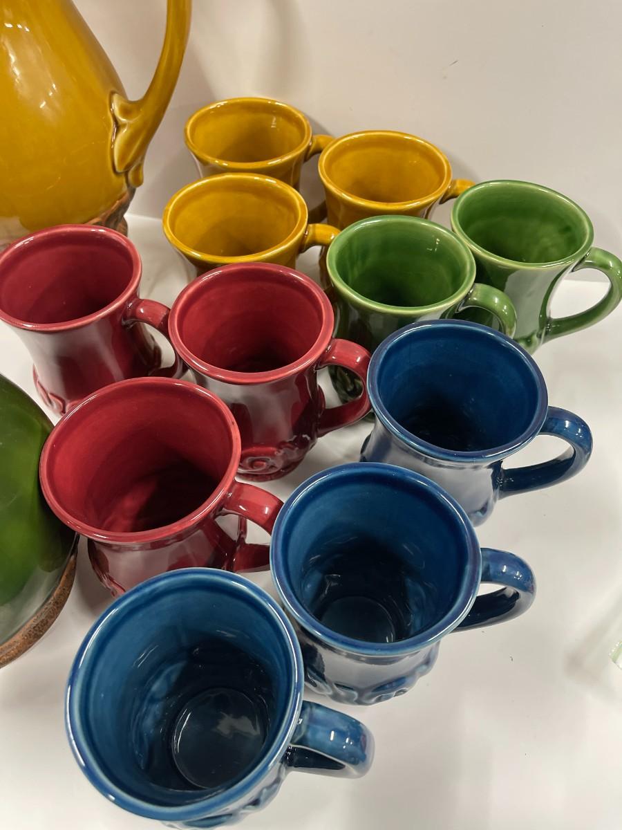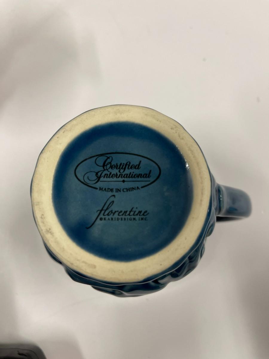 Certified International Florentine pattern ceramic pitchers with 11 mugs. Excellent condition.