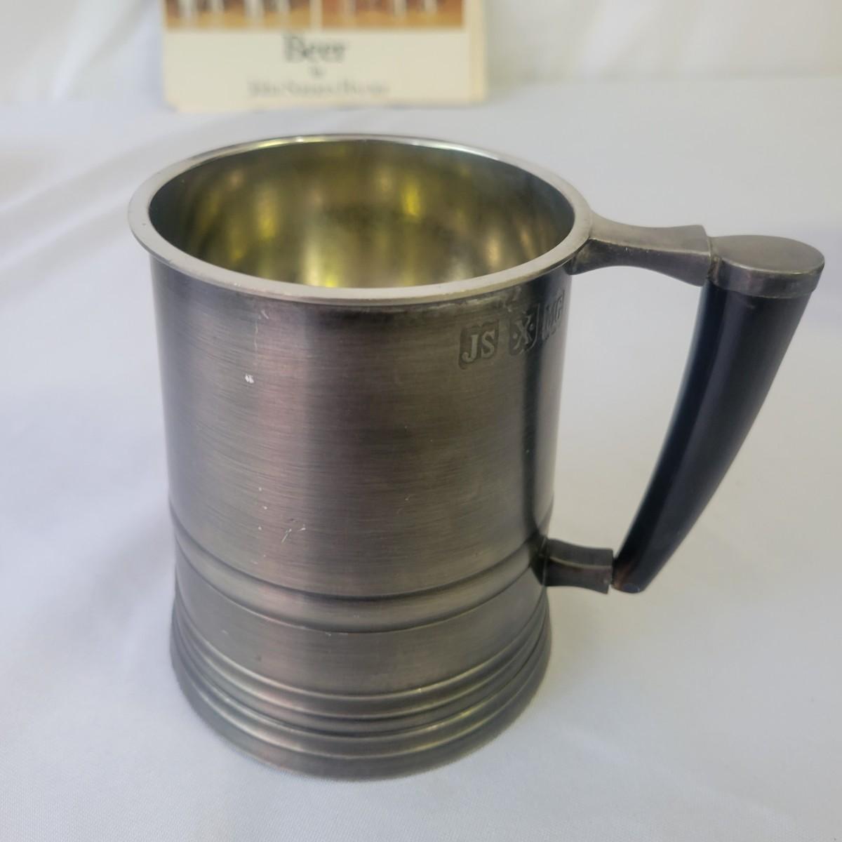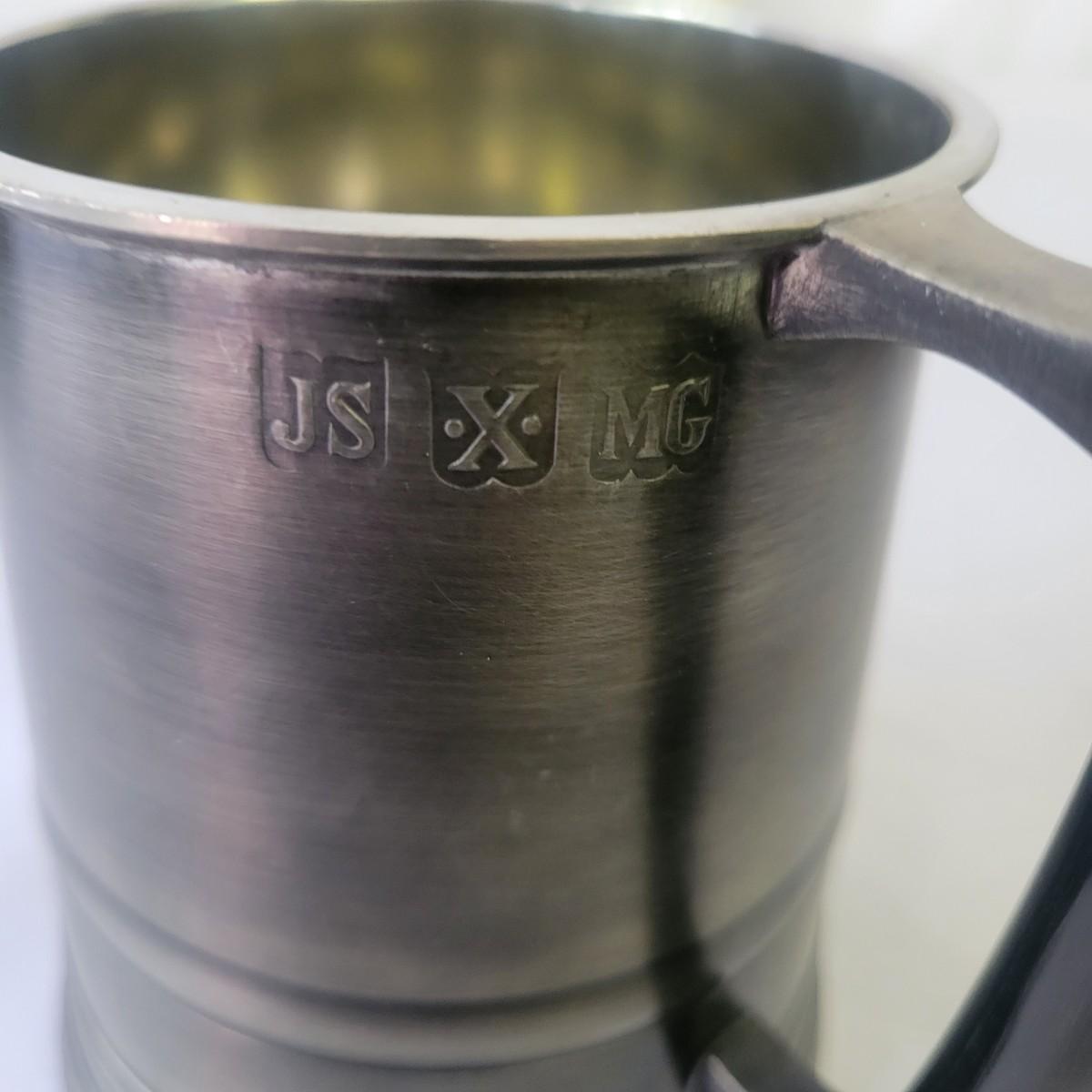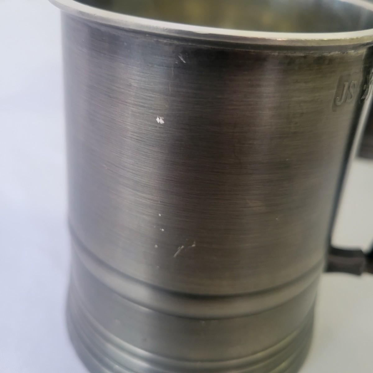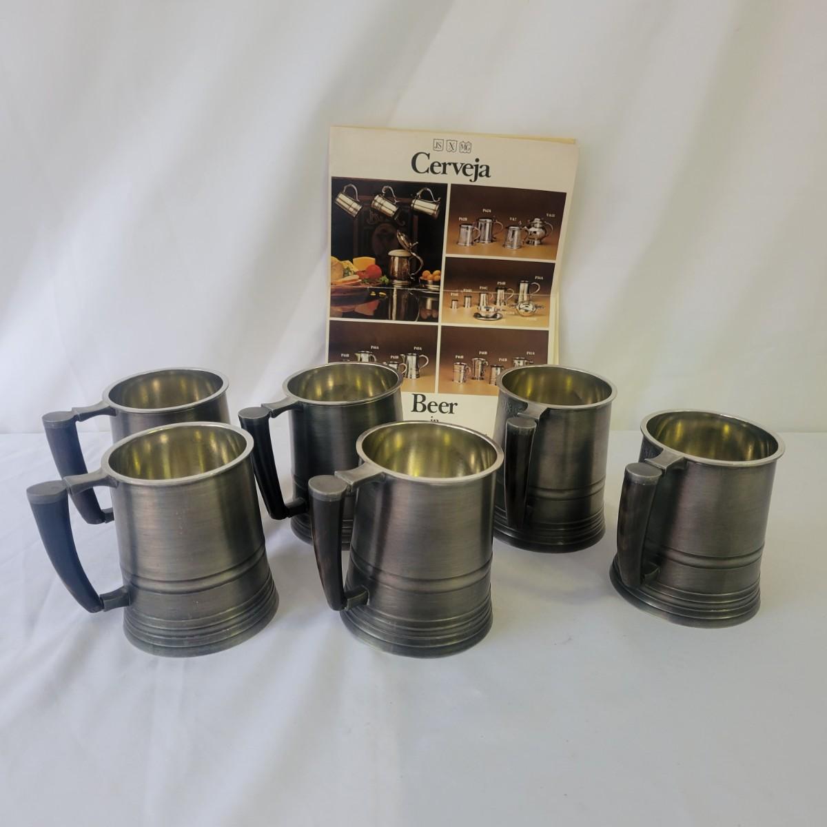 A collection of six matching pewter mugs by John Somers. These mugs are lead free and feature a shiny interior with a flat exterior. They also have what appears to be either bone or wooden handles and measure approximately 4"D x 4.5"H. One piece has some minor scratches on the exterior. Shipping available
