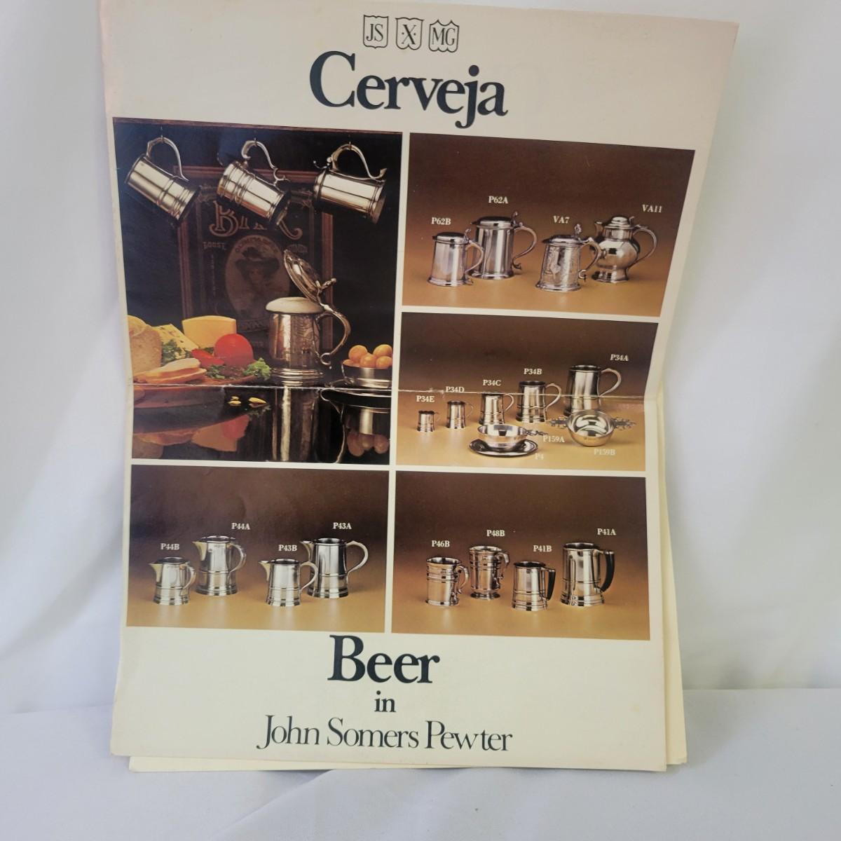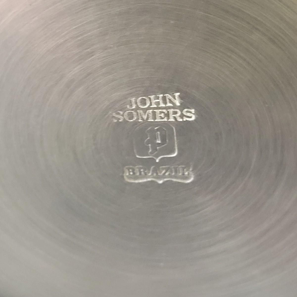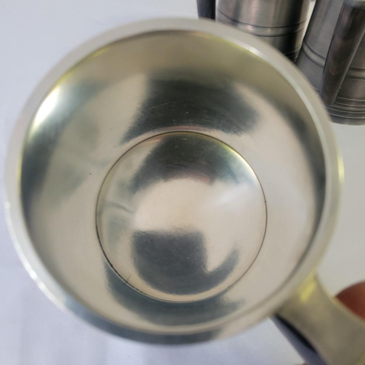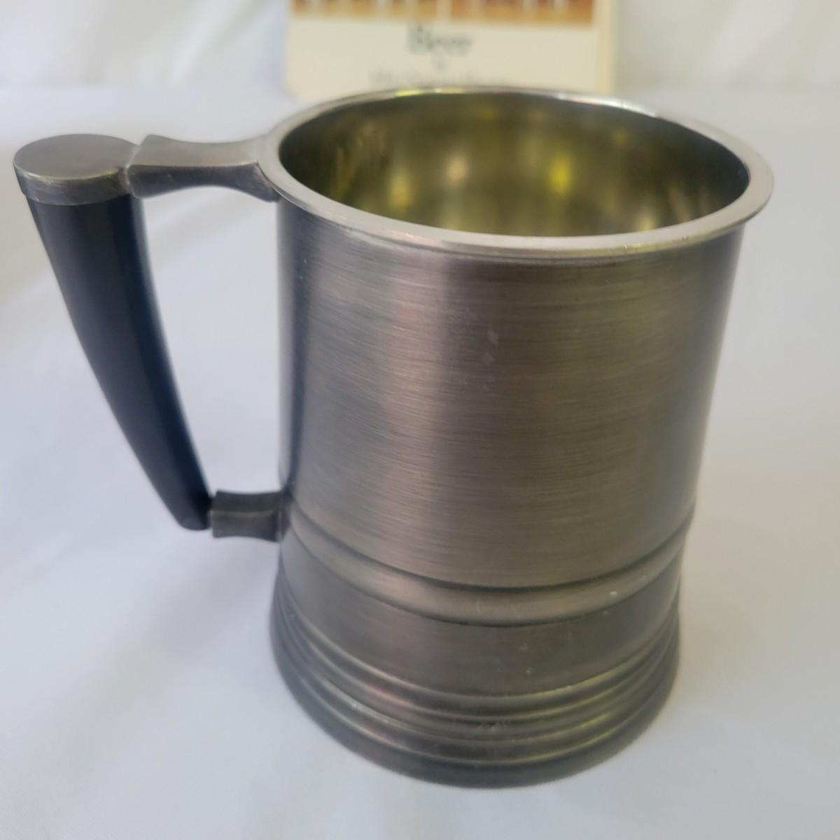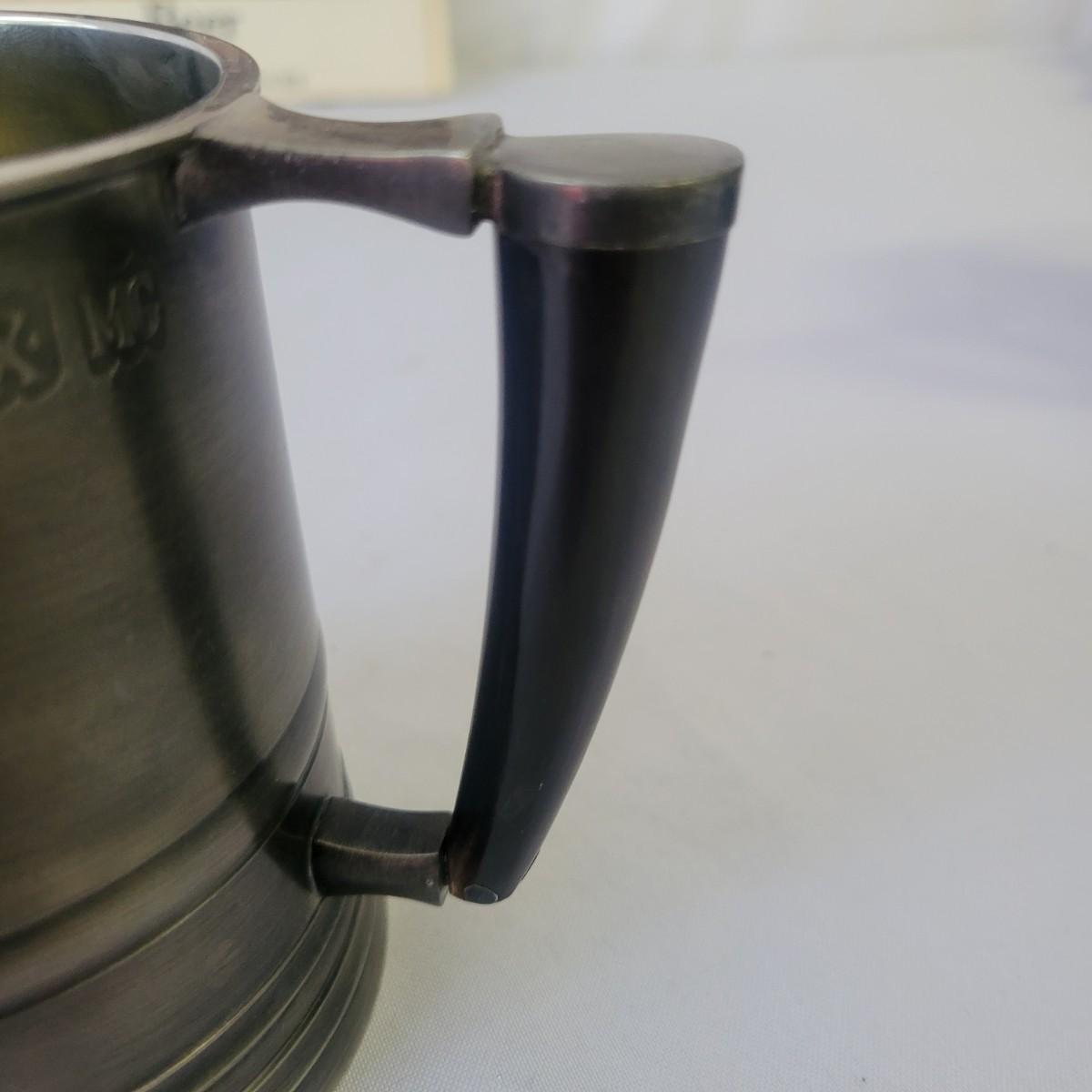 A collection of six matching pewter mugs by John Somers. These mugs are lead free and feature a shiny interior with a flat exterior. They also have what appears to be either bone or wooden handles and measure approximately 4"D x 4.5"H. One piece has some minor scratches on the exterior. Shipping available