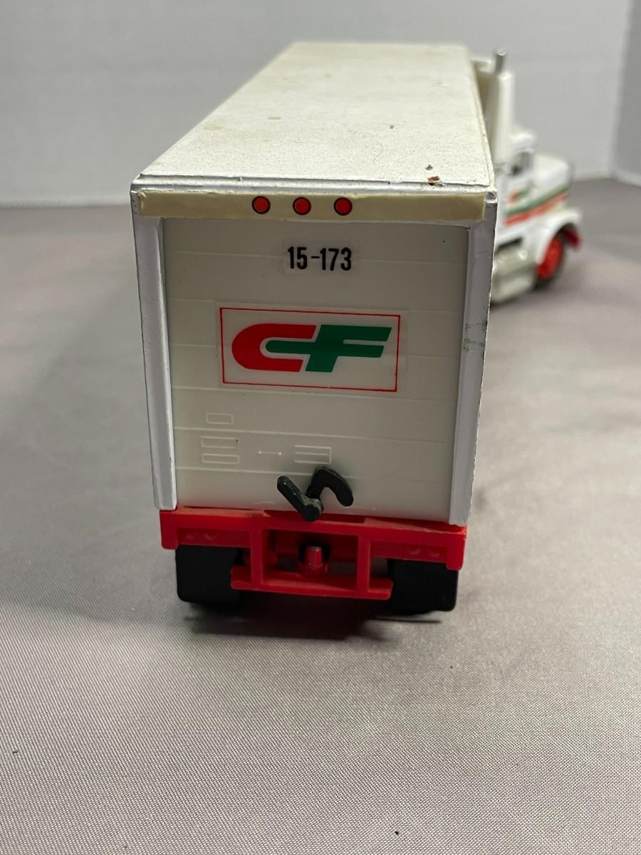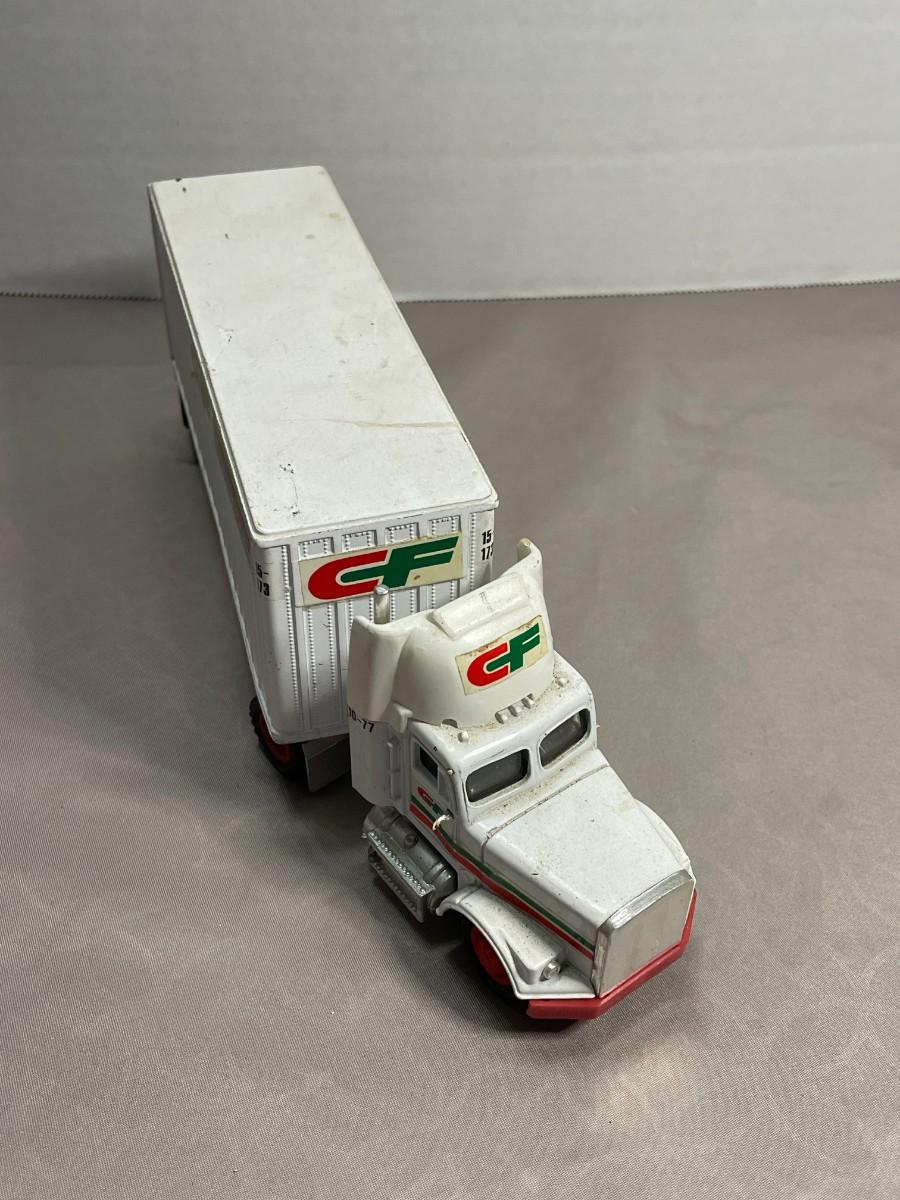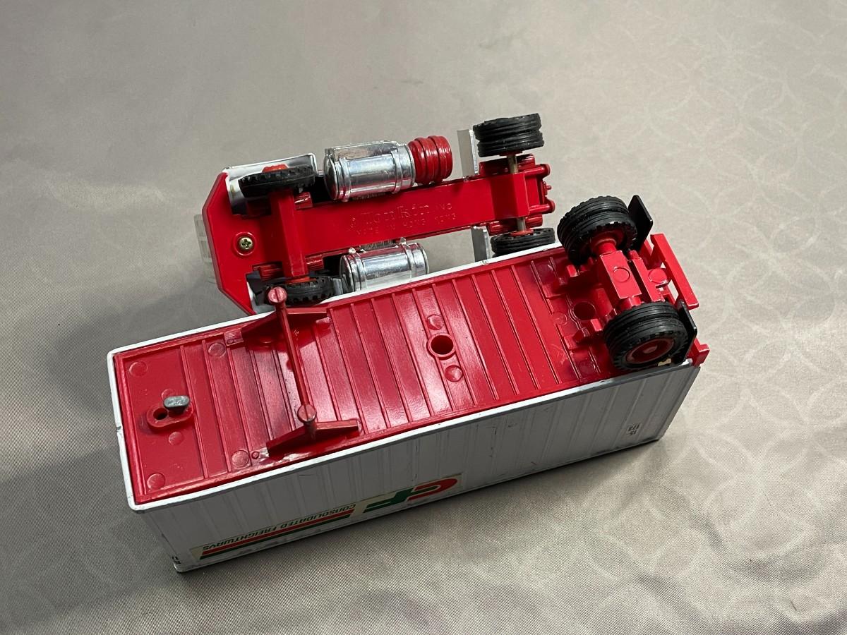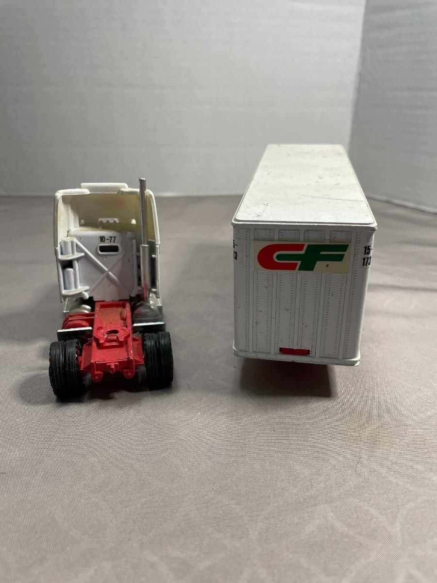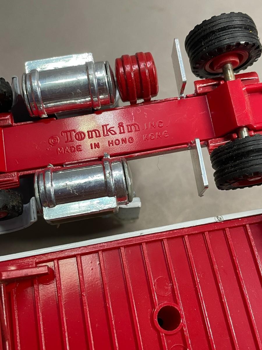 This tractor trailer set is in very good condition. The trailer is marked Tonkin Made in Hong Kong. It is about 9.5 inches in total length.
