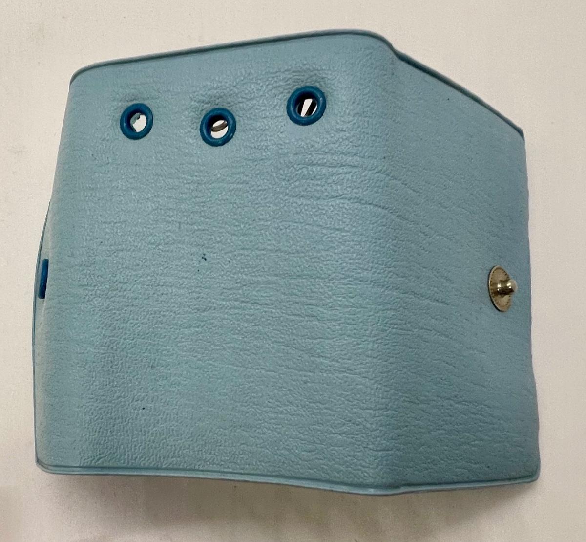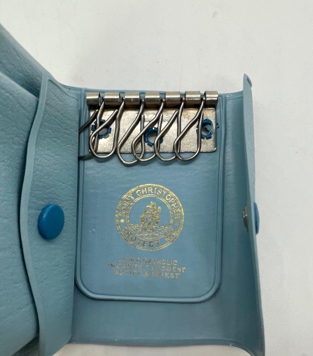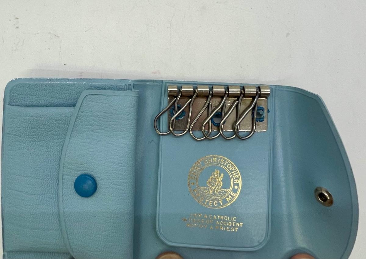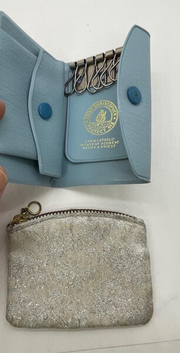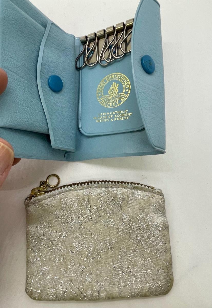 Zippered small bag for rosarie and light blue leather wallet for keeping track of keys with instructions