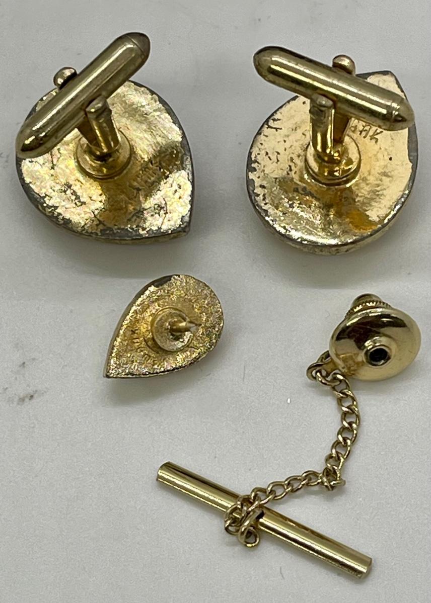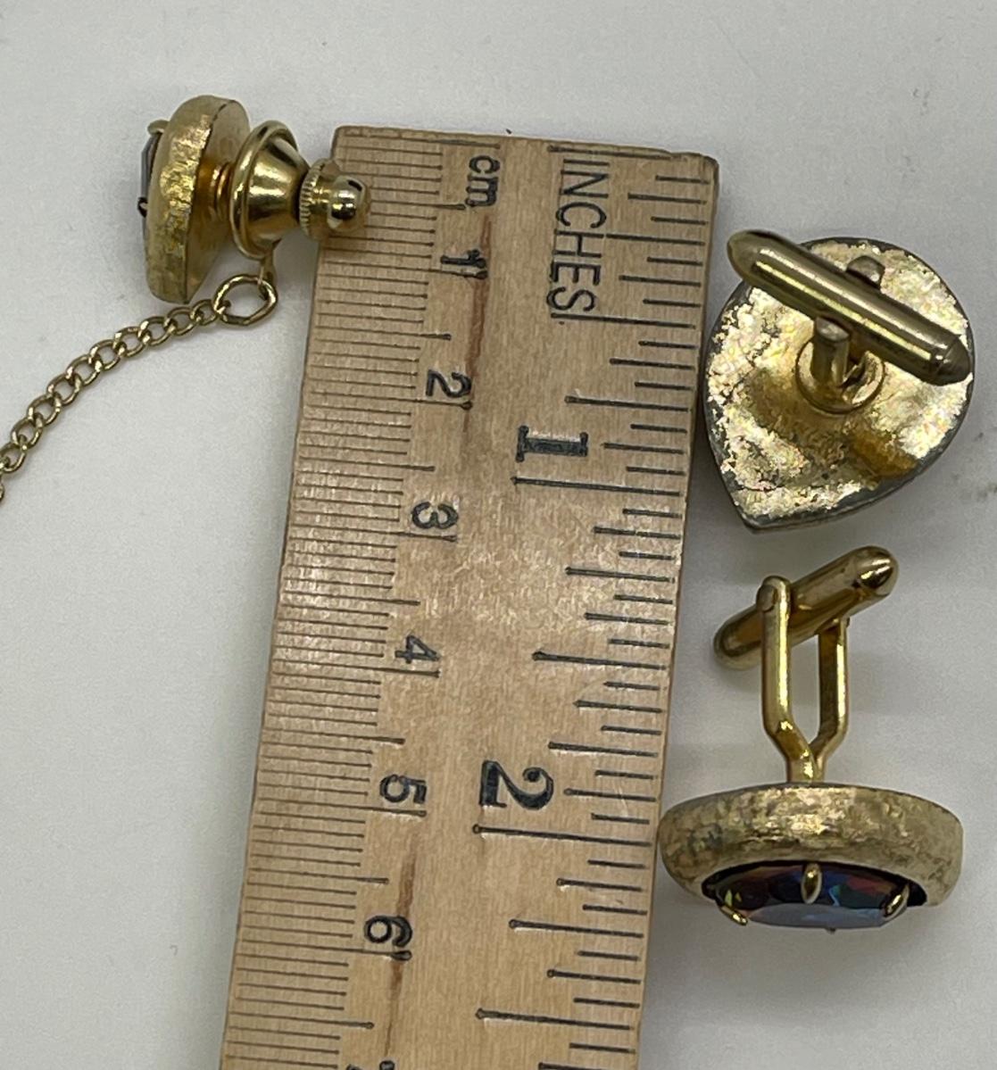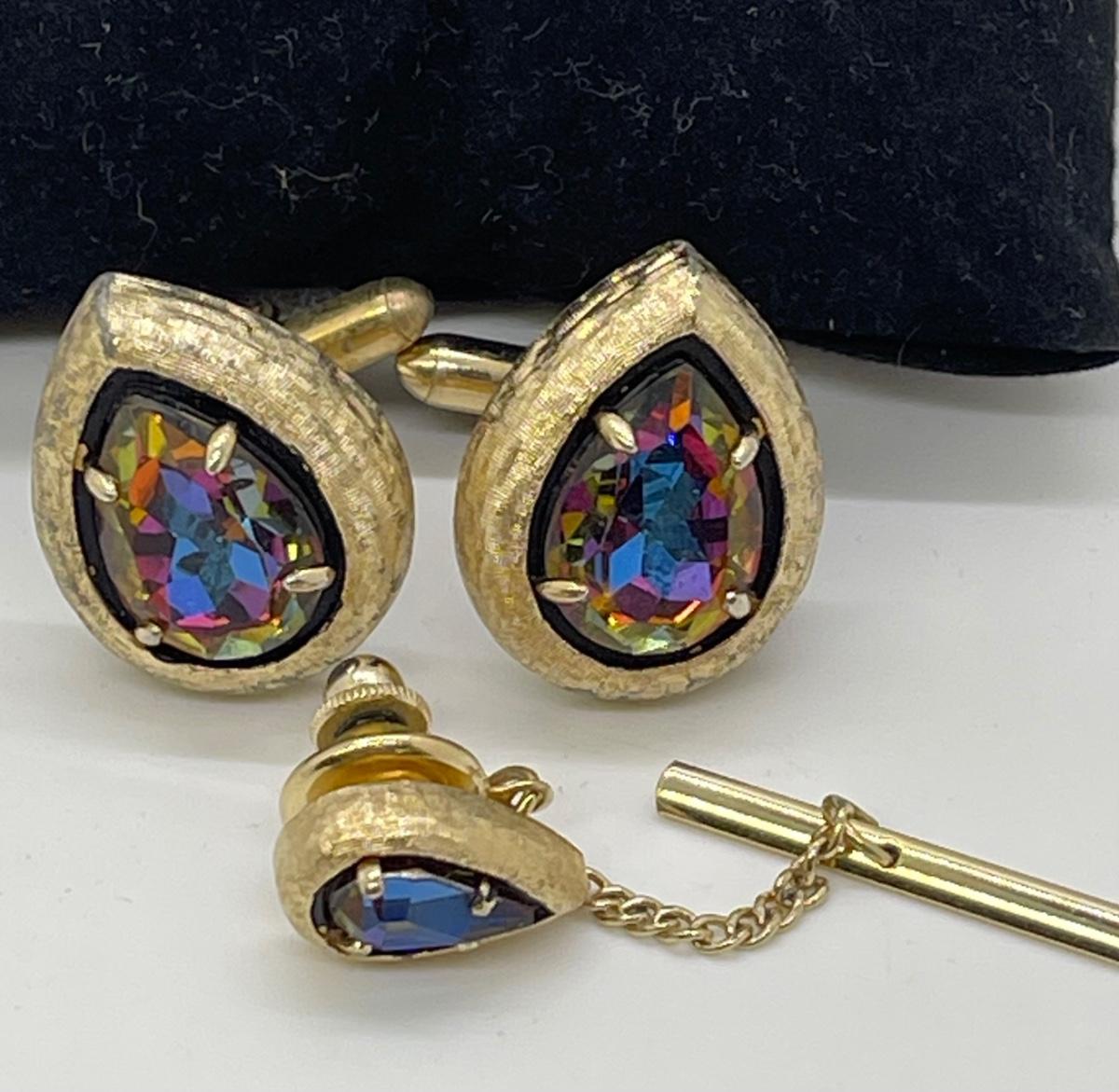 Vintage Swank Men's Jewelry Set Cuff Links Tie Tack Gold Tone Fruit Salad Teardrop Rhinestone. In good condition. Great color within the rhinestones.