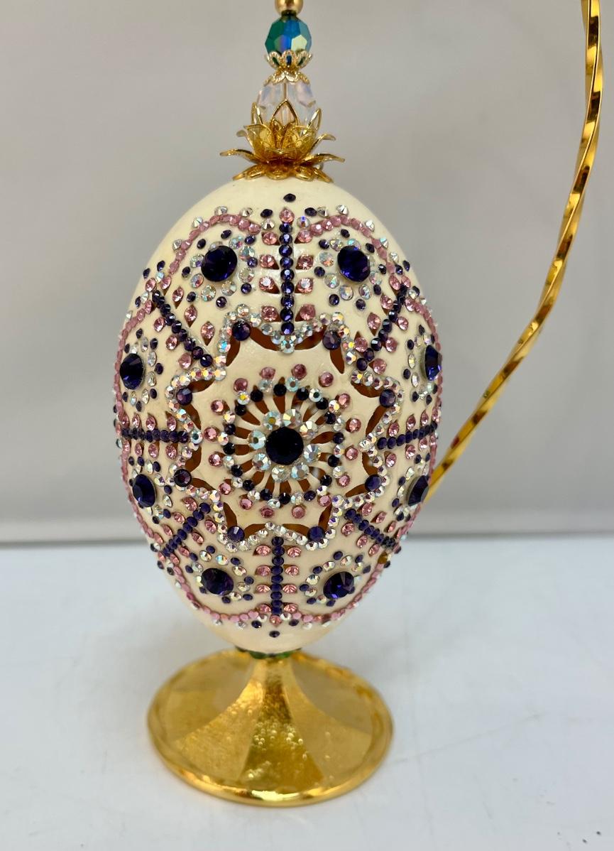 Bedazzled Rhinestone Covered Hanging Egg Ornament. In good condition. Two different images on egg. Comes with stand.