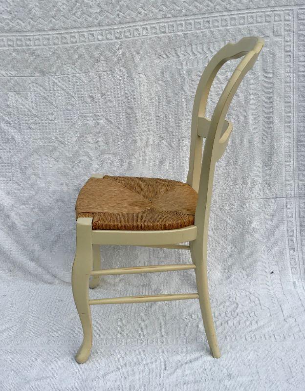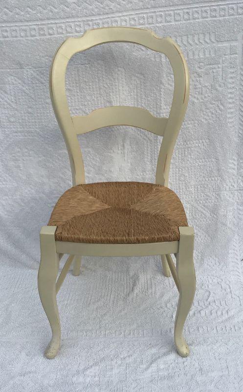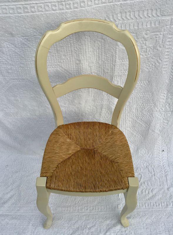 Wooden chair, measures approx. 36” tall, 17” wide and 22” deep. Glossy painted finish in off-white color, has painted streaks simulating wear on edges. Sold through Pottery Barn, made in Italy.