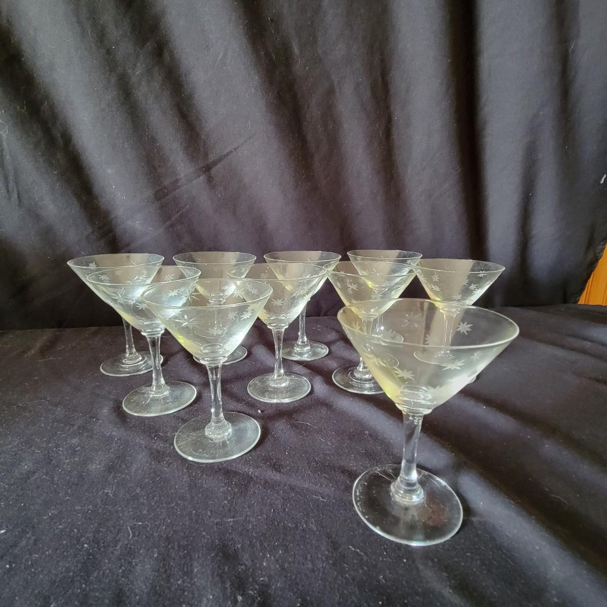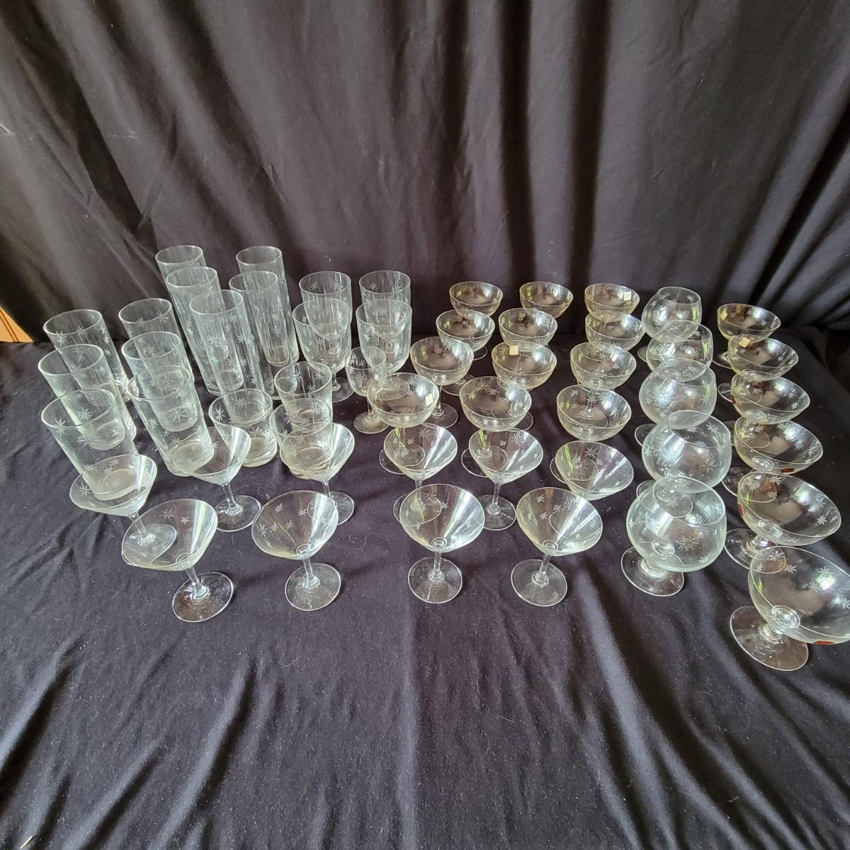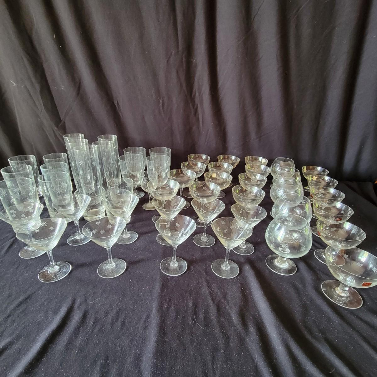Assortment of 52 Quartex crystal glasses made by CG in a stardust pattern that date from pre 1950. 9 different patterns in the assortment with varying quantities of each. See photos for amount in each pattern. Tallest glass is 7" tall.