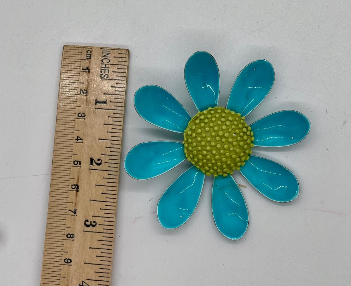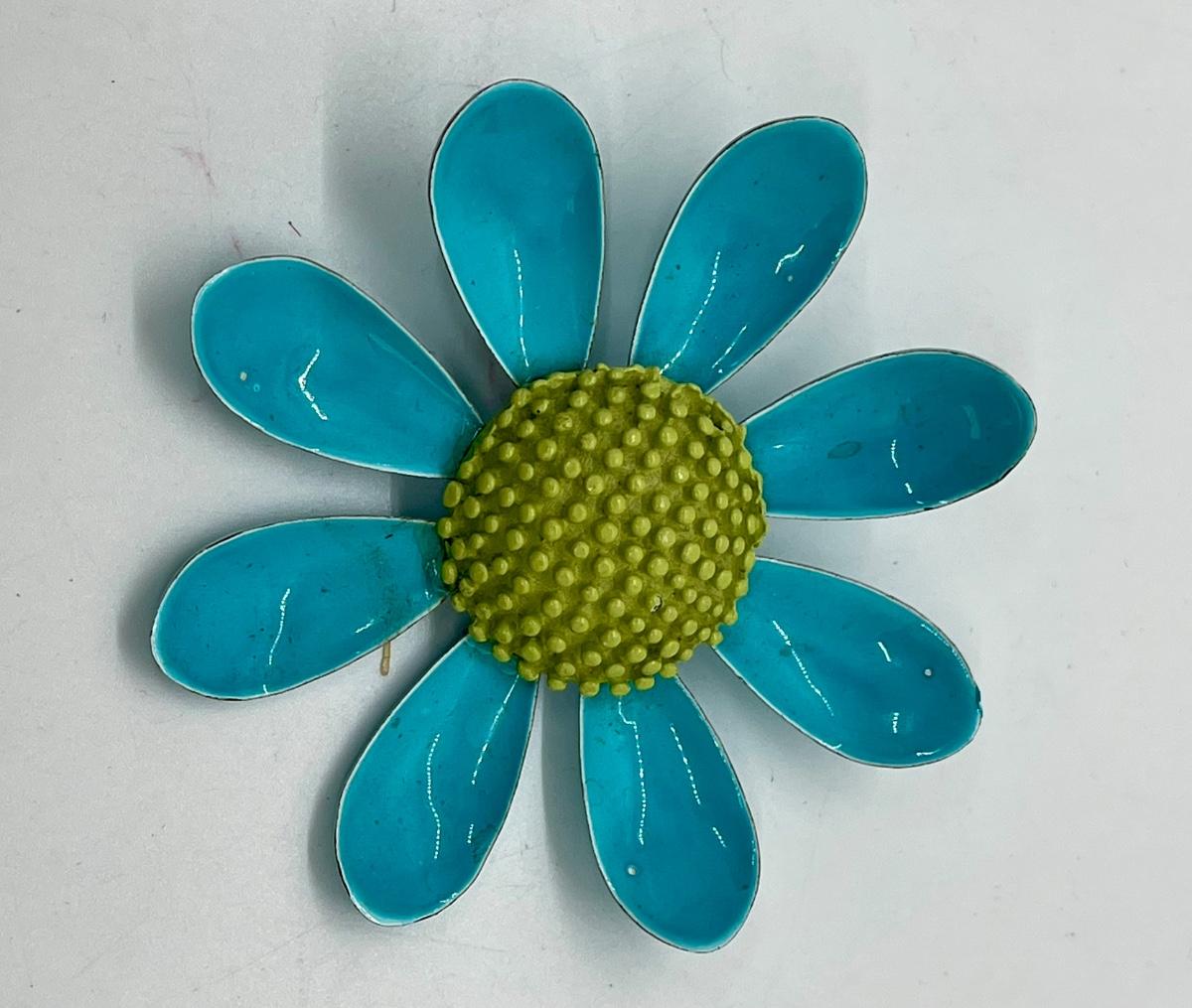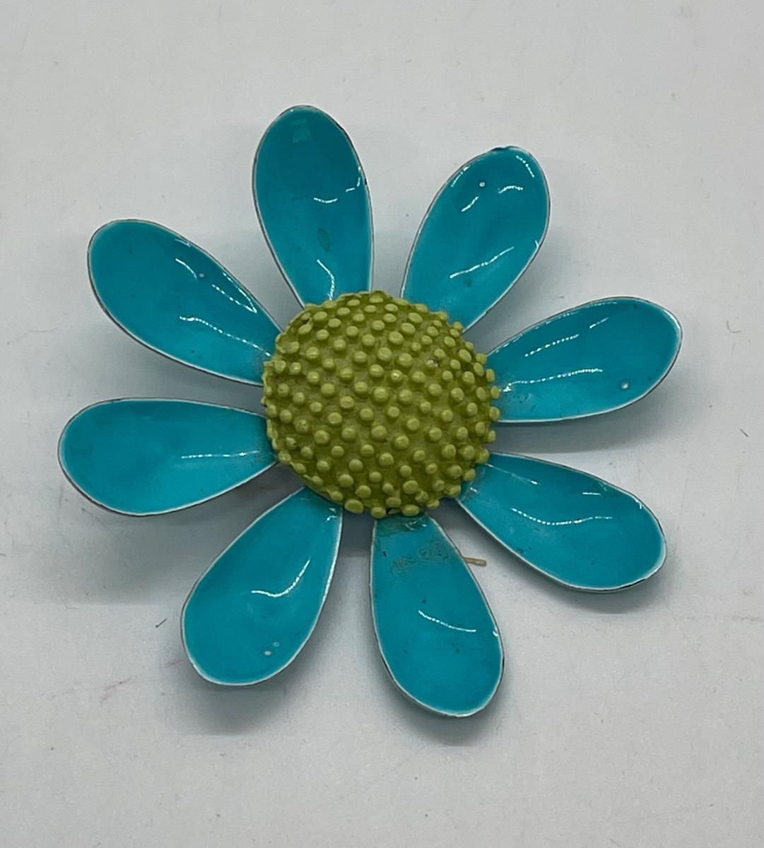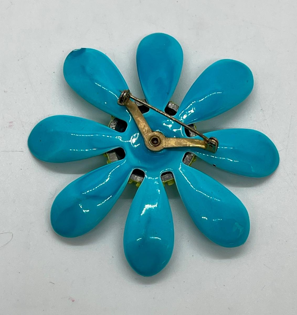 Large vintage enamel Flower Brooch or Pin Turquoise petals with green center