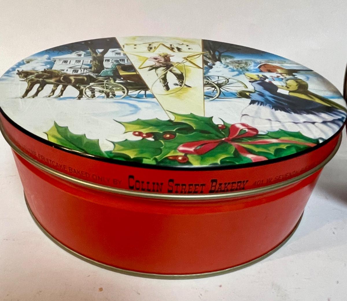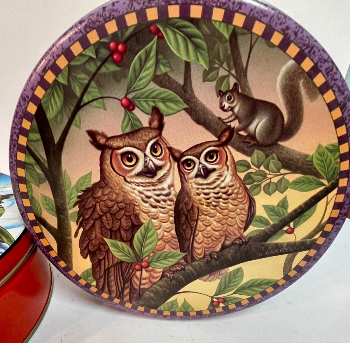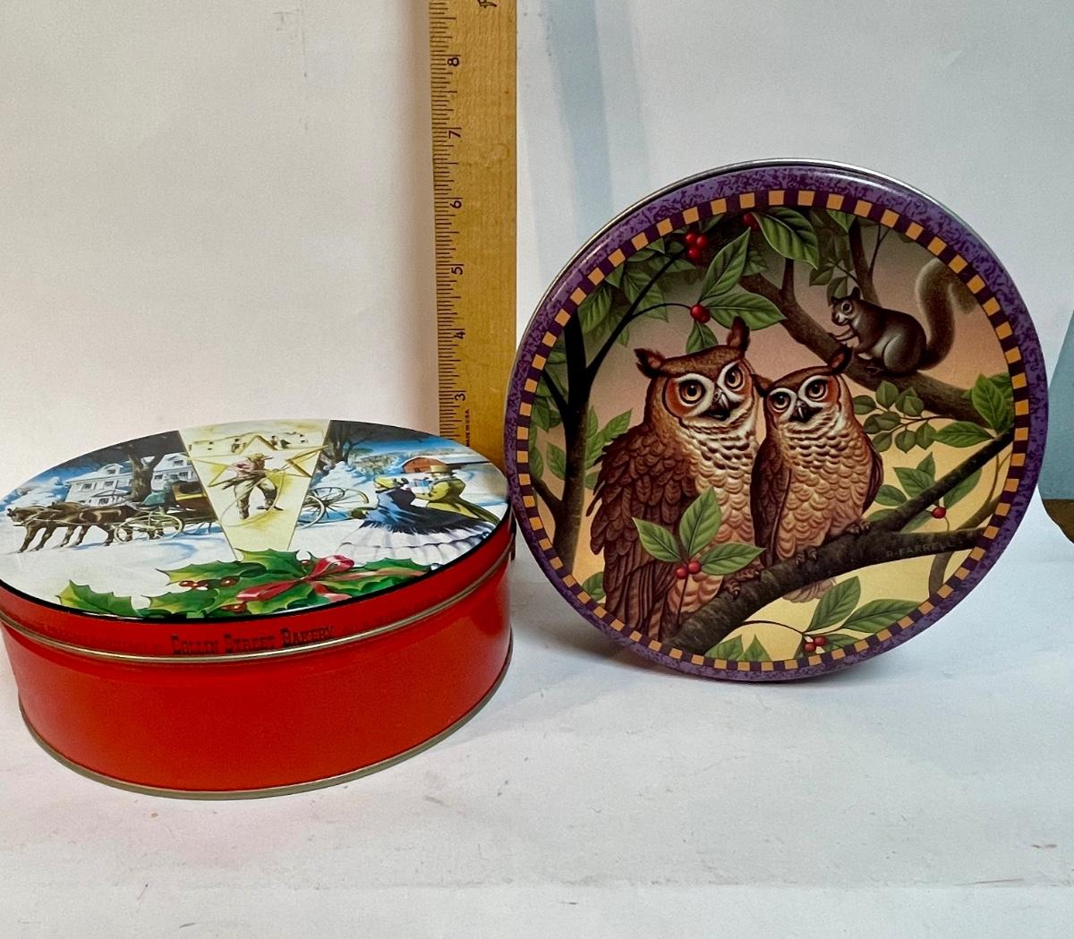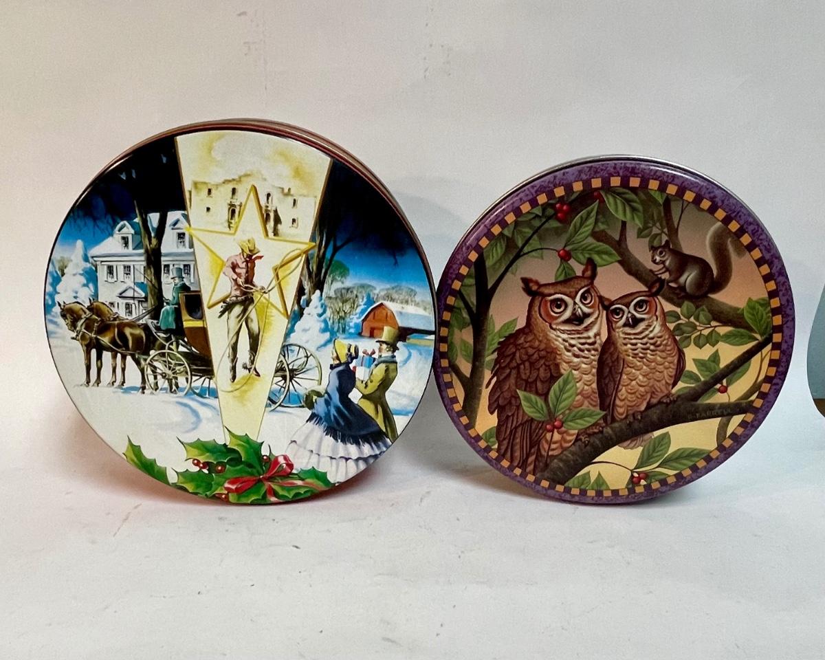 One has an image of owls on the lid, the other has a split image of a Currier and Ives-type winter scene and a Western image of the Alamo.