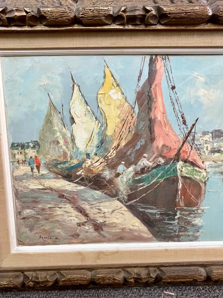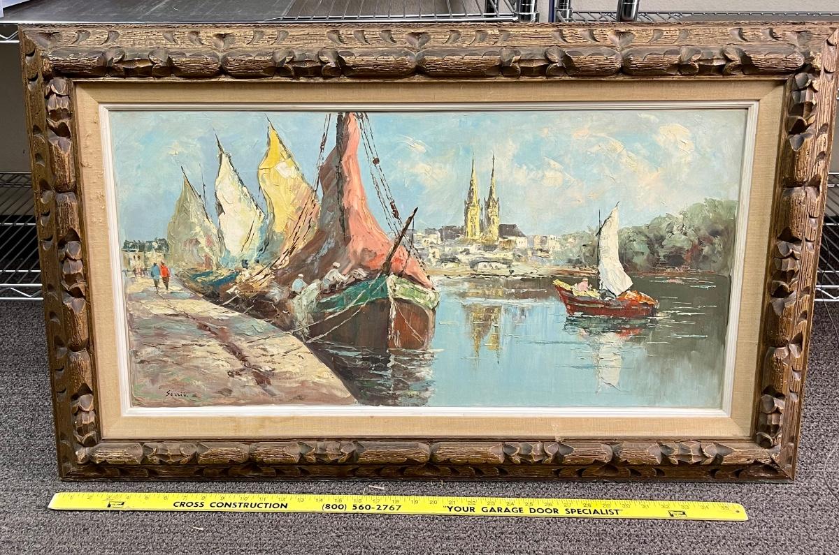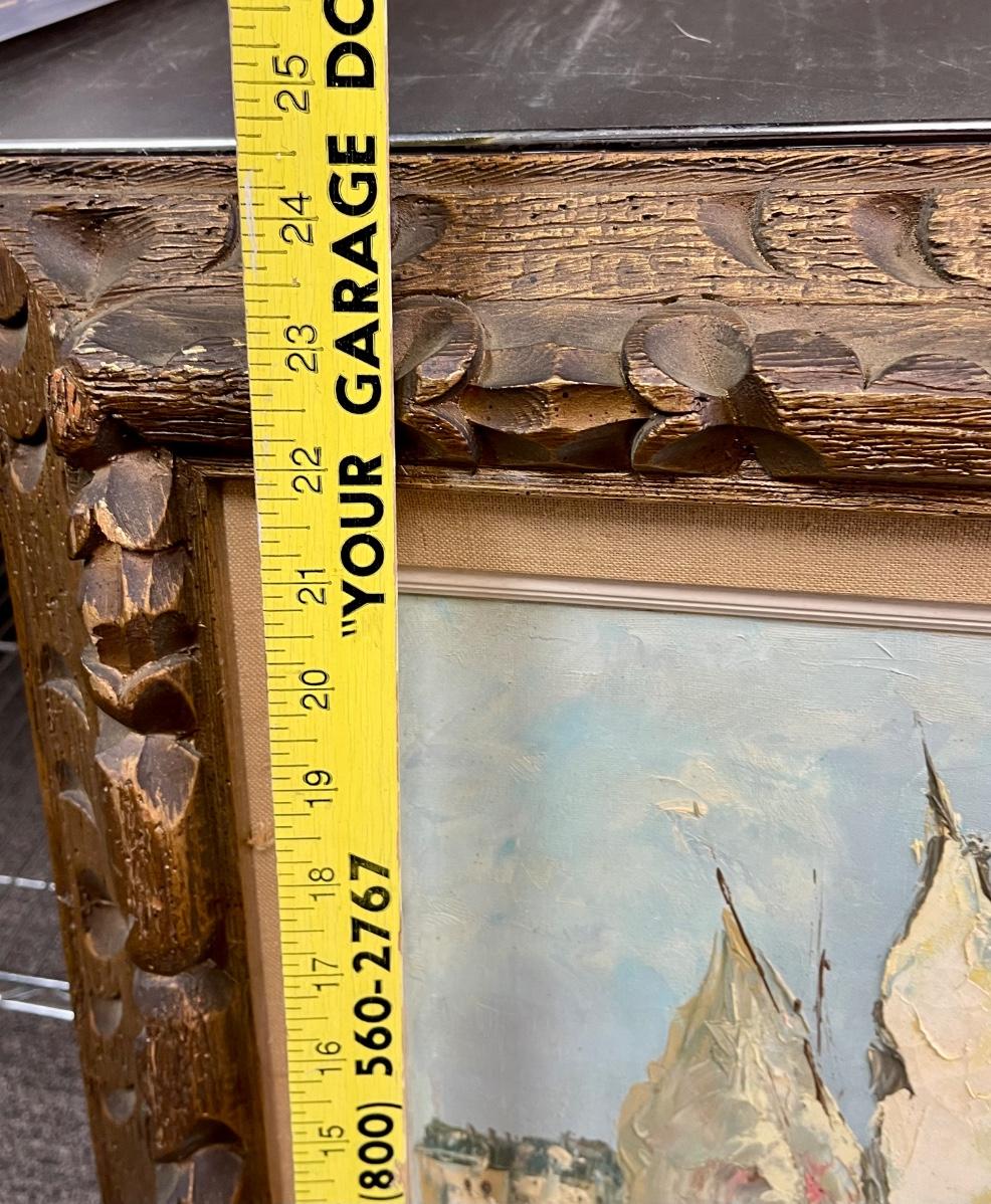 Large Oil Painting Sail Boats Carved Wood Frame signed Sezzio