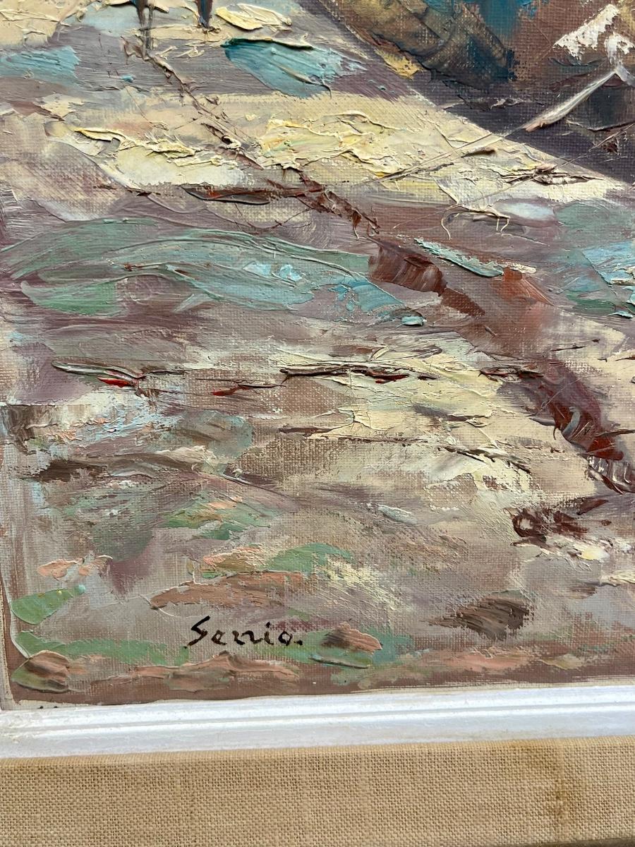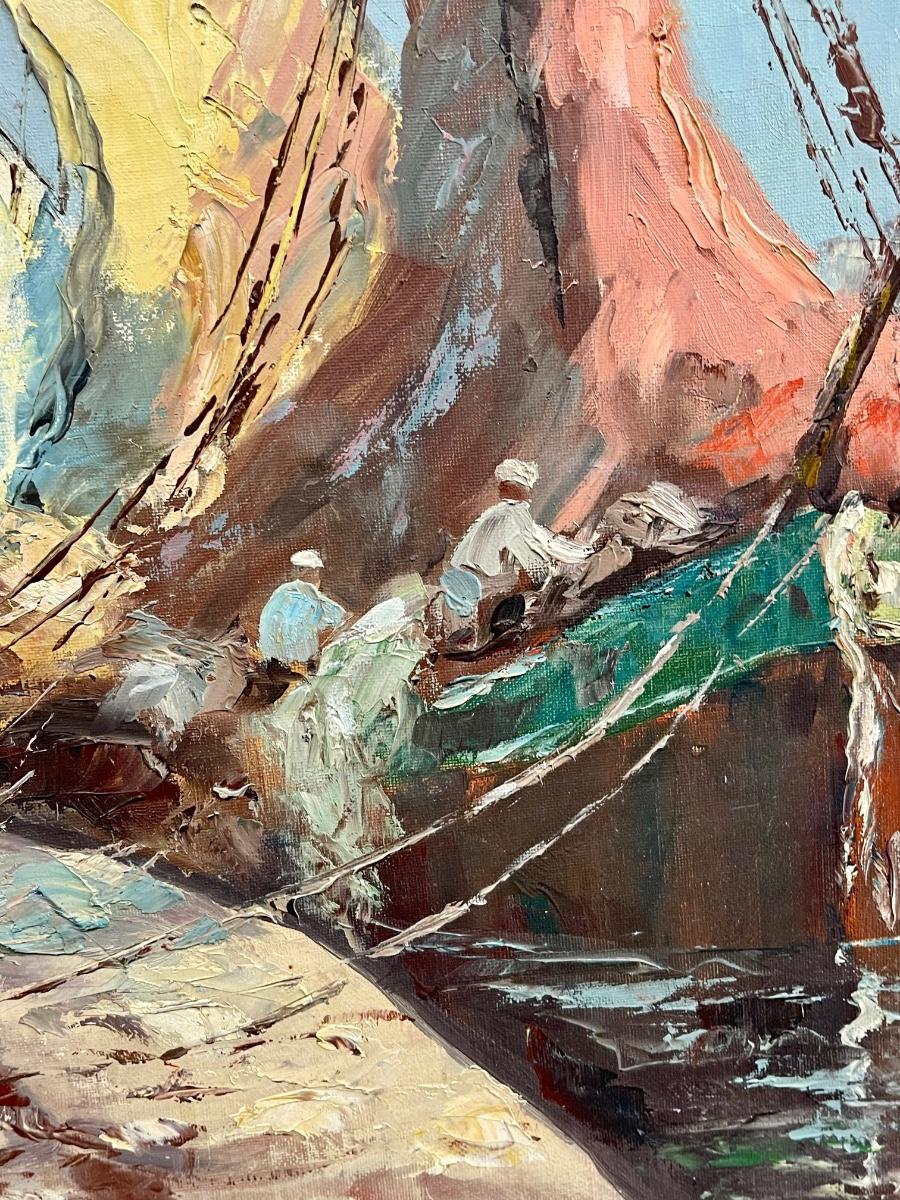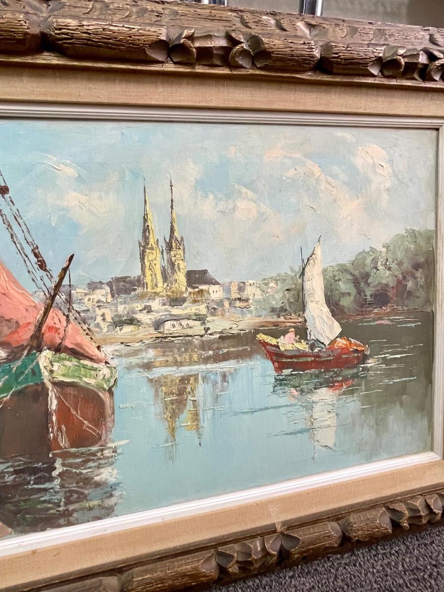 Large Oil Painting Sail Boats Carved Wood Frame signed Sezzio