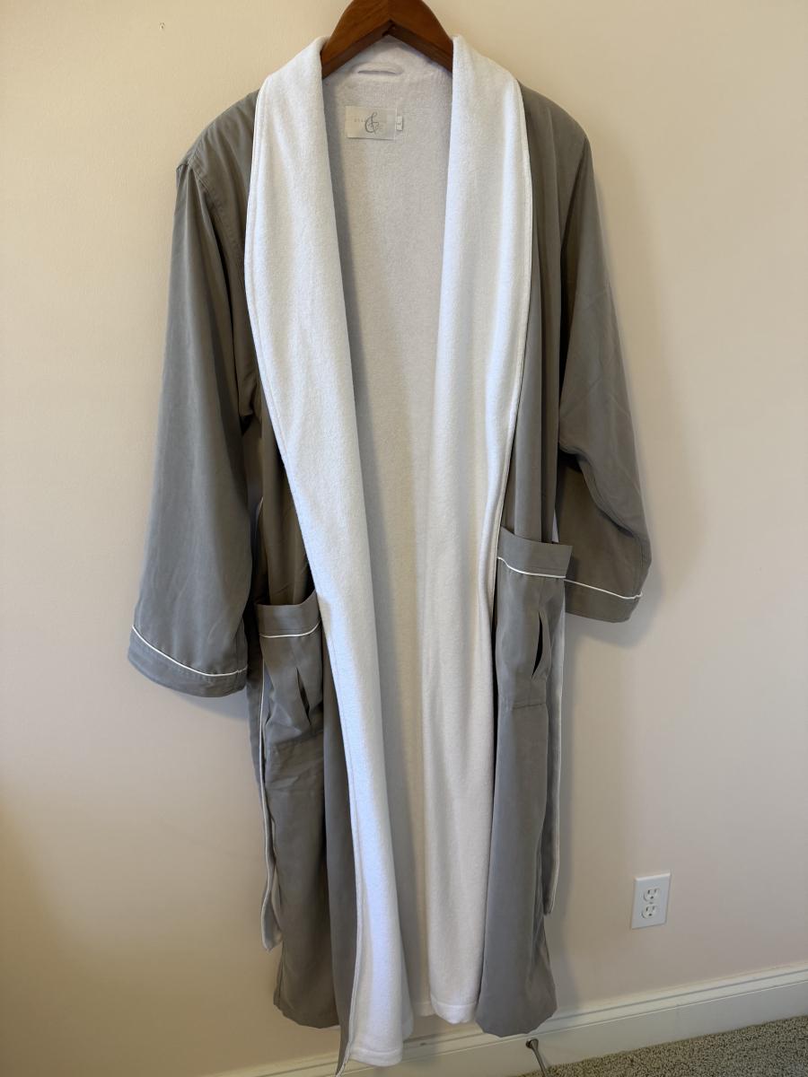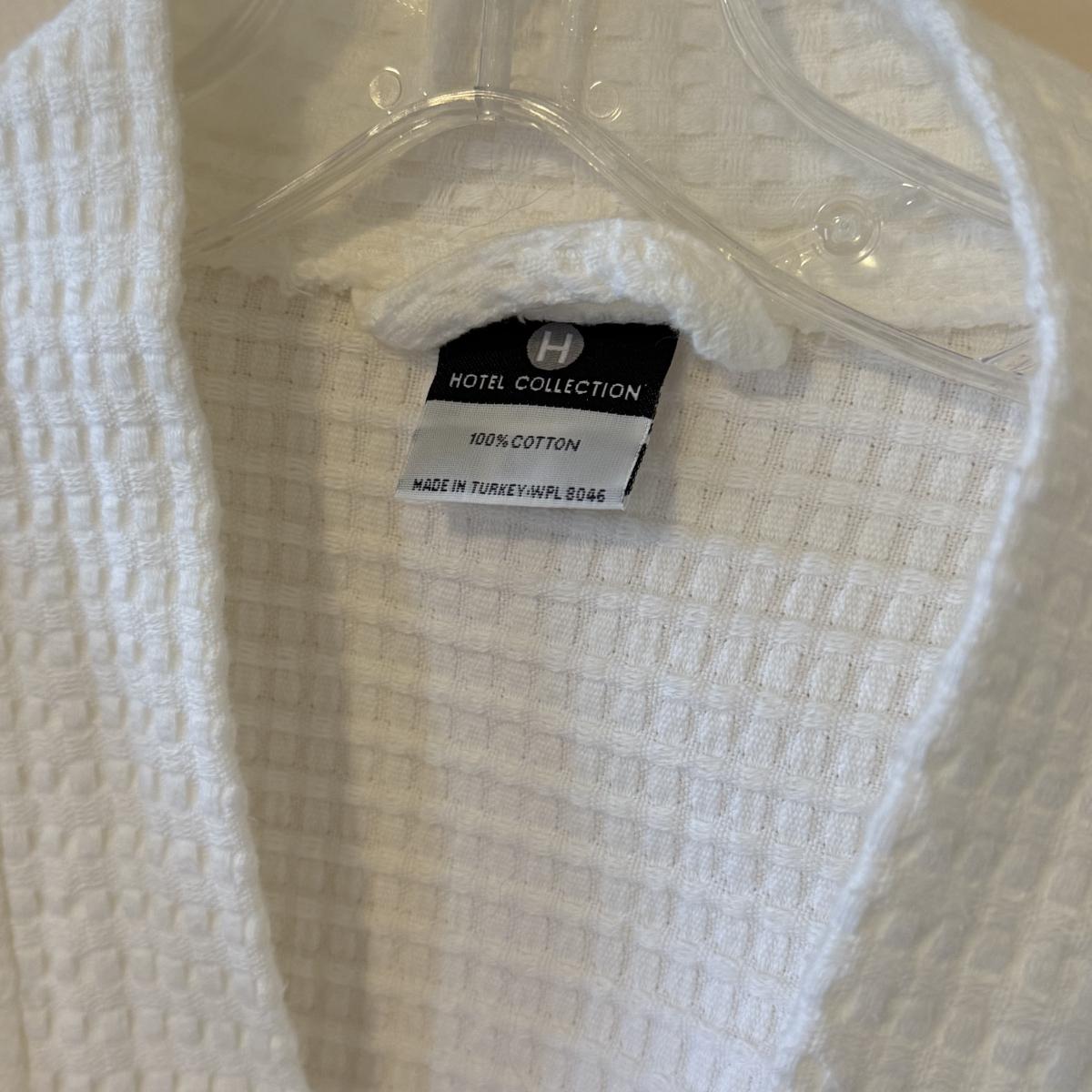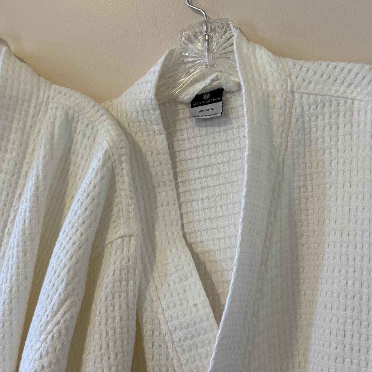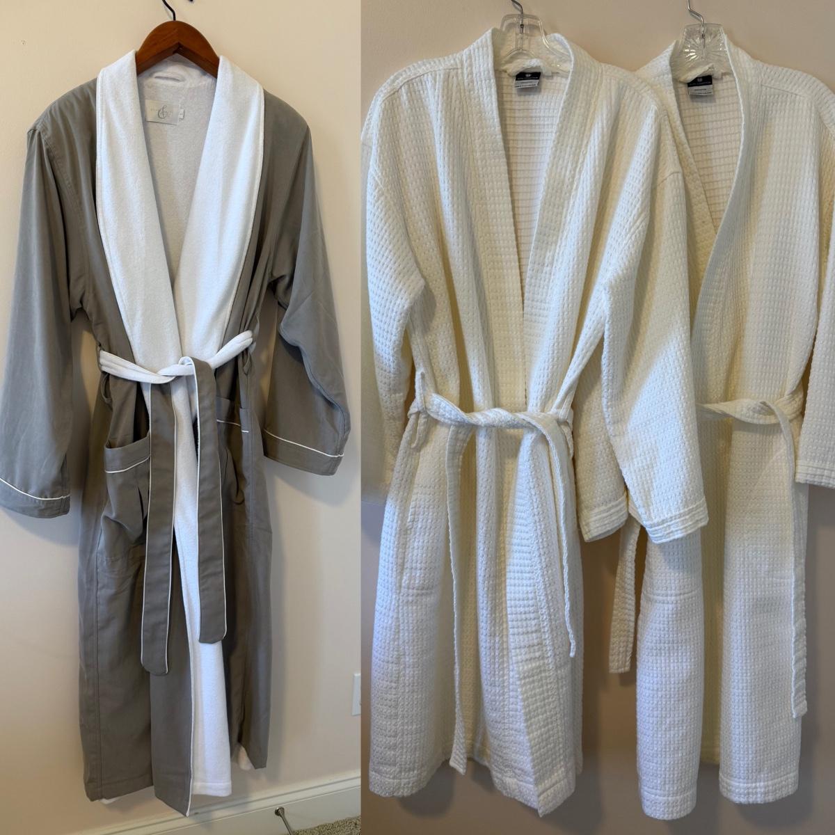 Three robes. One is a men’s size large by Chadsworth & Haig and the other two are by The Hotel Collection and don’t have sizes listed on their tags. They appear to be identical. All three have belts included.