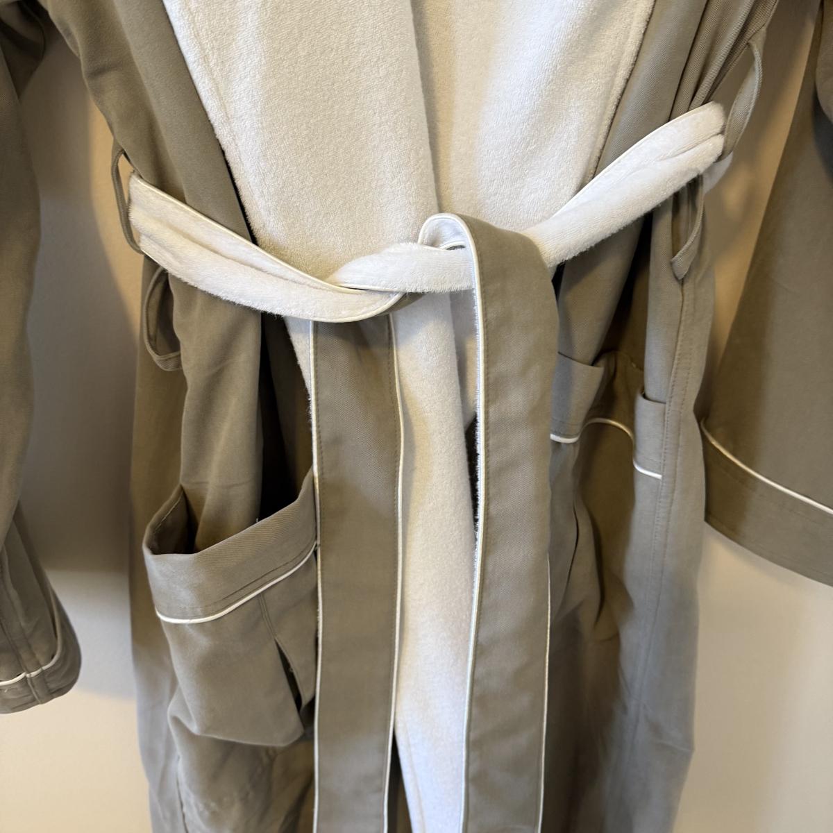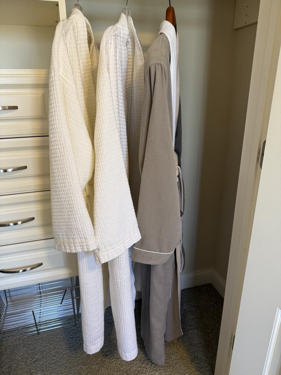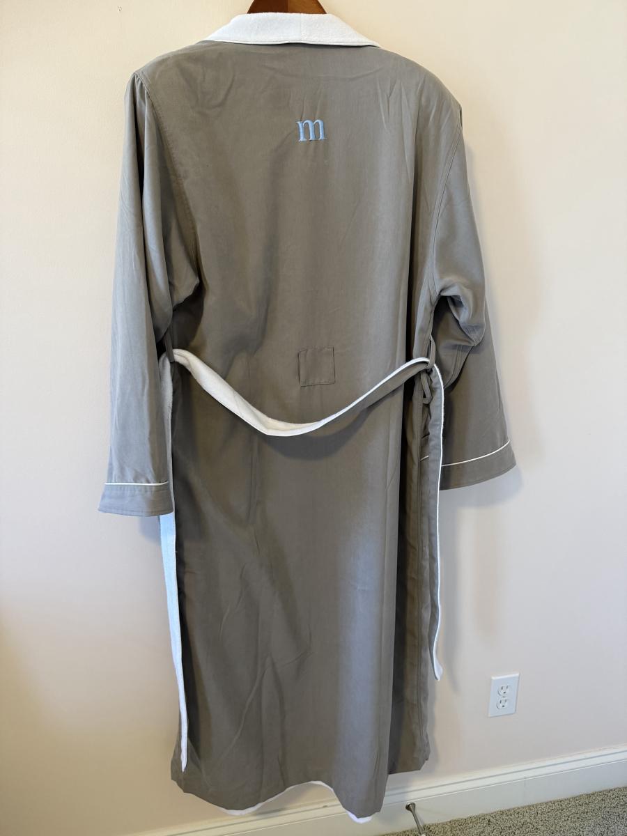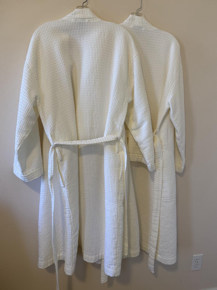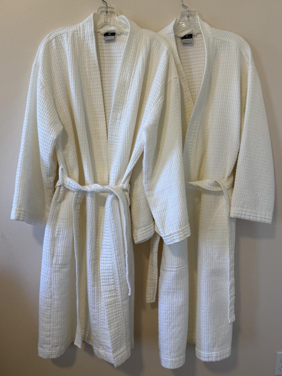 Three robes. One is a men’s size large by Chadsworth & Haig and the other two are by The Hotel Collection and don’t have sizes listed on their tags. They appear to be identical. All three have belts included.
