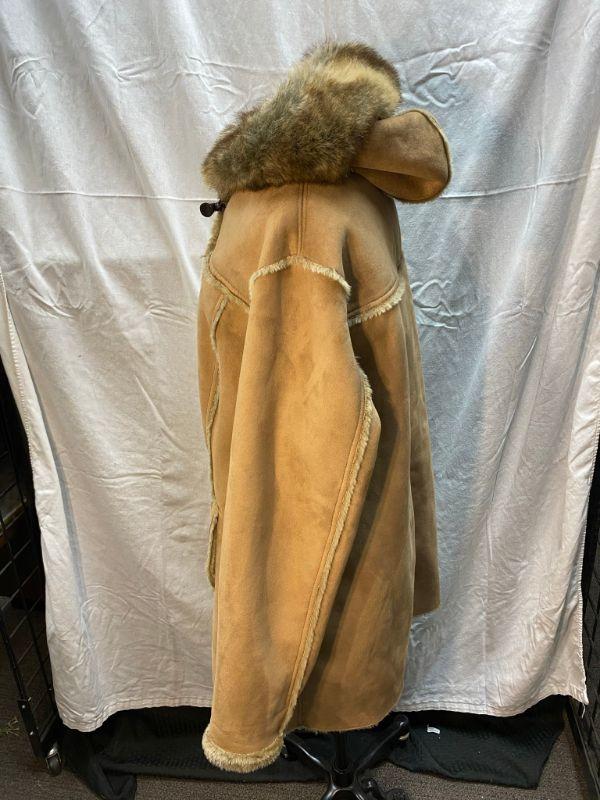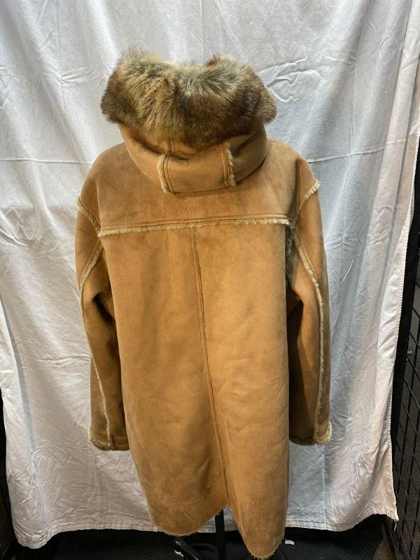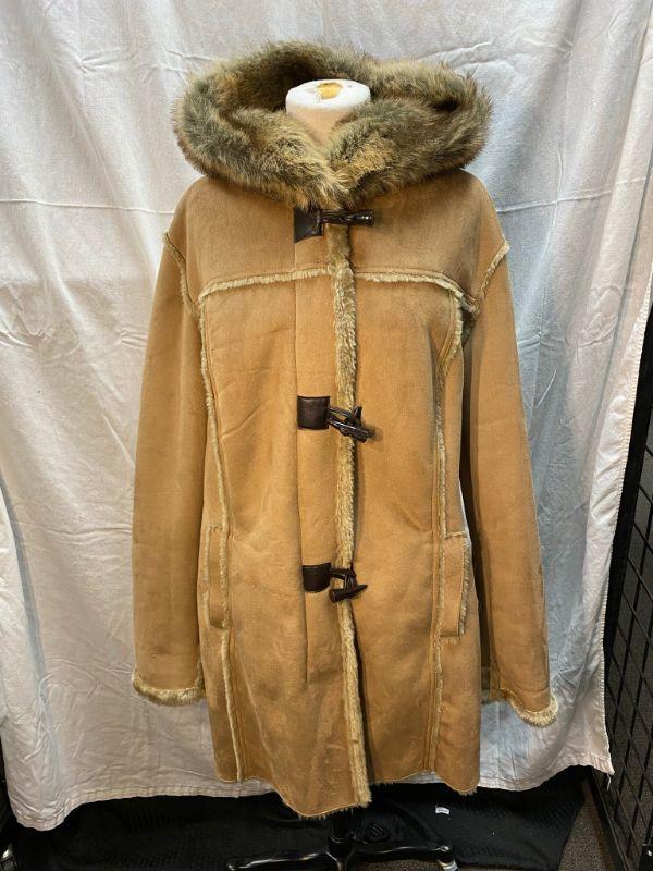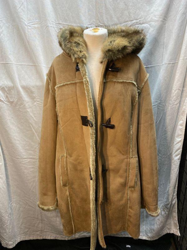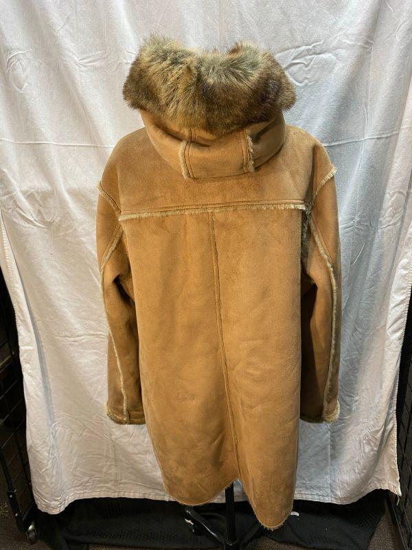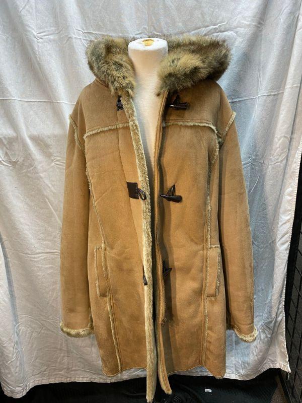 Chadwick's beige trench coat jacket. Mid thigh to top of knee length. Zipper and button front closure, Hood is faux fur. Has a suede look but is polyester. Size 1XL, Good condition.