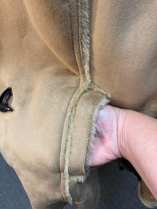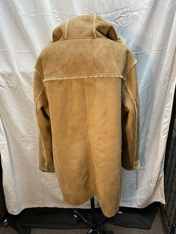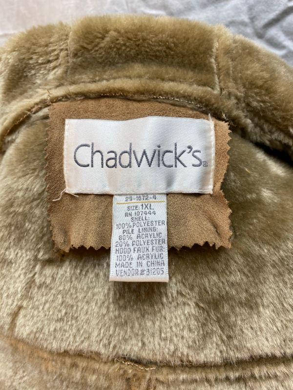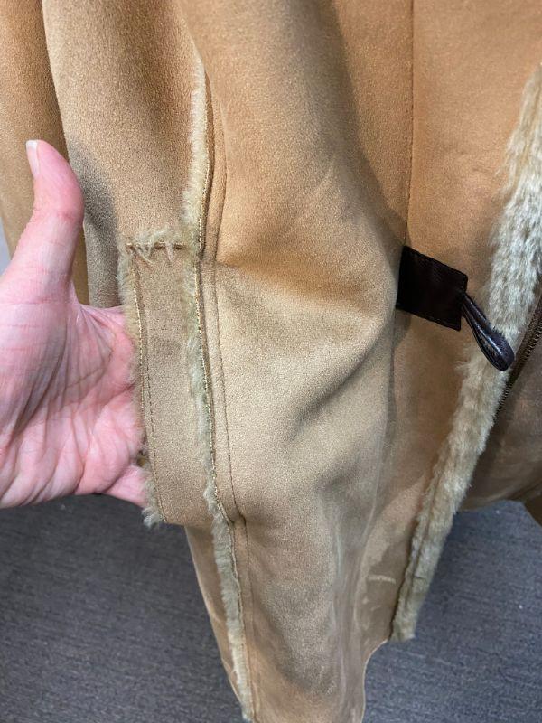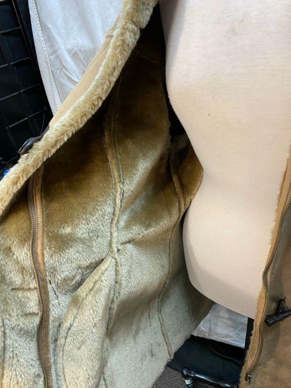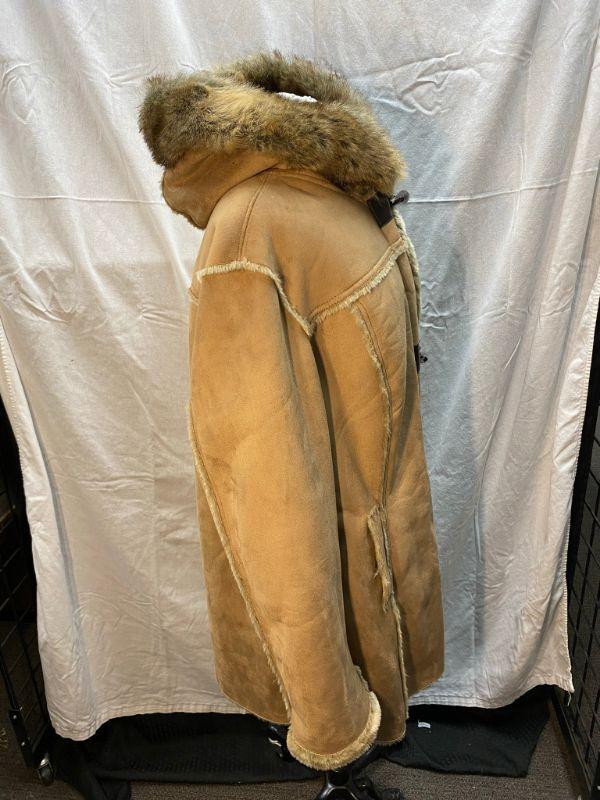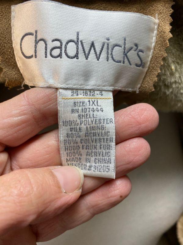 Chadwick's beige trench coat jacket. Mid thigh to top of knee length. Zipper and button front closure, Hood is faux fur. Has a suede look but is polyester. Size 1XL, Good condition.