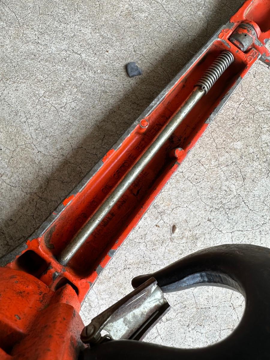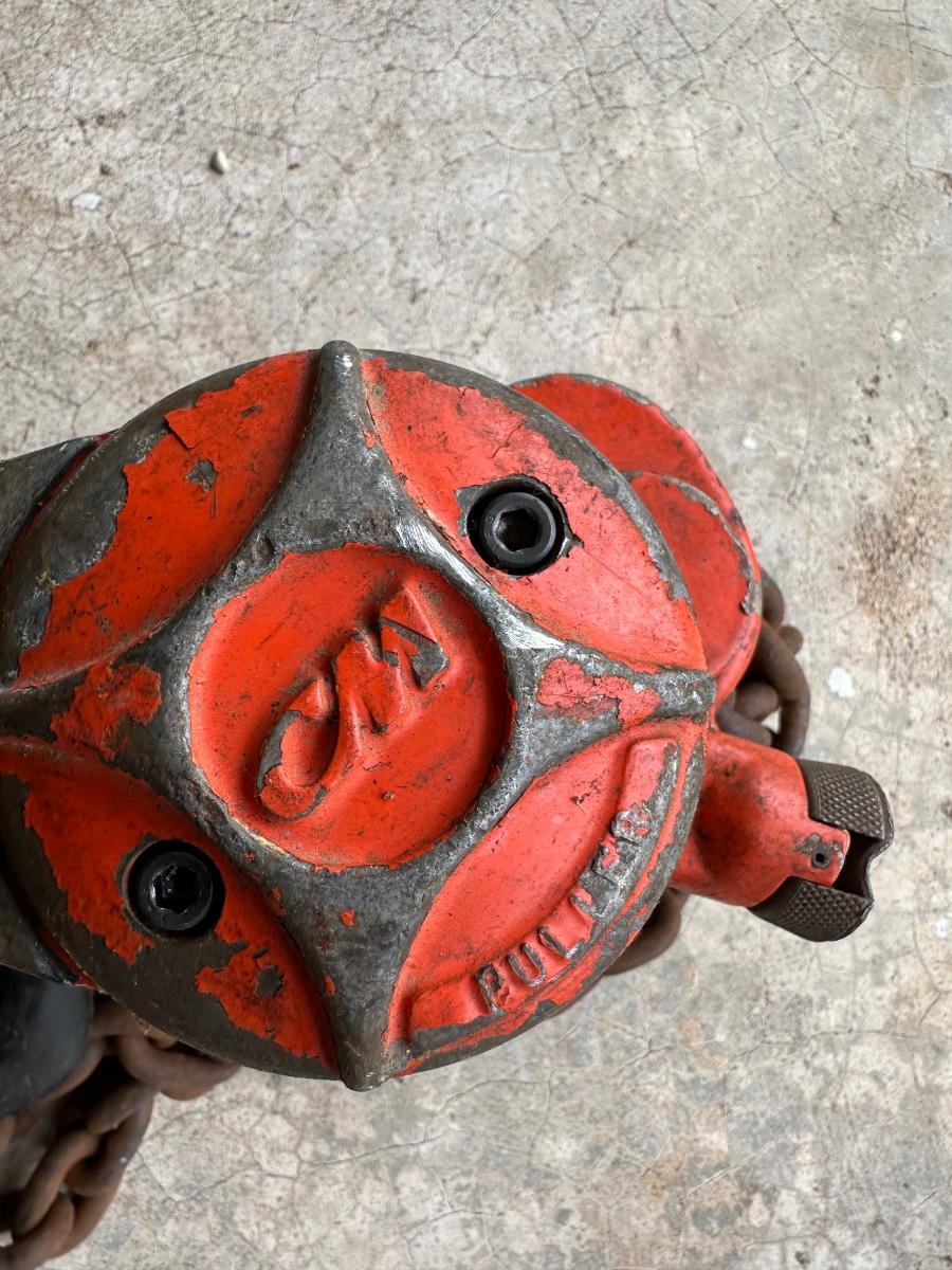 Heavy-duty chain hoist made by Columbus McKinnon Corp., USA. Cast steel body with long handle, safety hook, and heavy chain. Industrial-grade puller for lifting, tensioning, or dragging. Classic jobsite tool with original paint and solid construction.