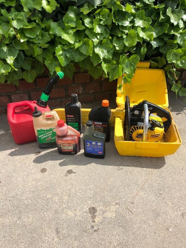 Gas powered chain saw, includes case, gas can, and assorted oil and lubricants.