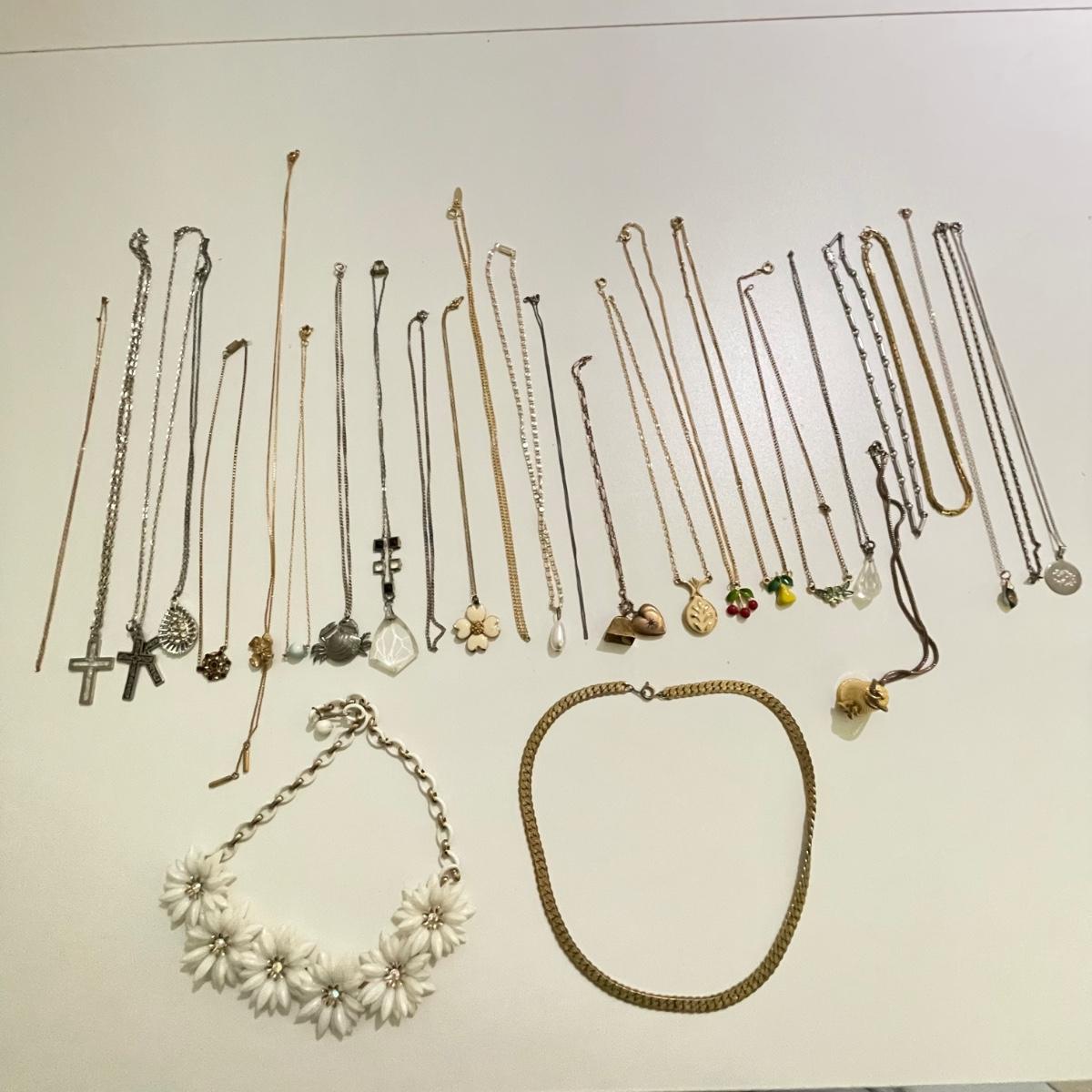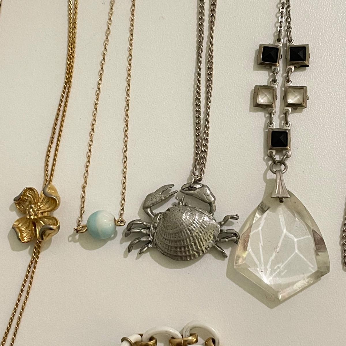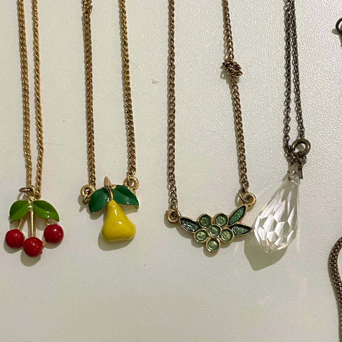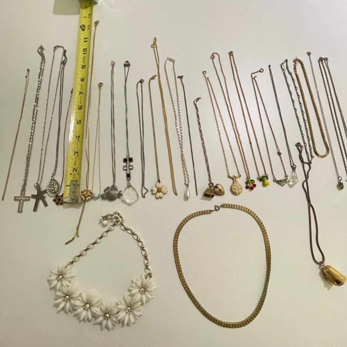 Twenty eight necklaces, many with pendants. Four appear to be enamel- the fruit and ivory flower. The bee thimble is the only marked pendant, see photos. The white floral choker is a mix of metal and rhinestones and has plastic petals. See images. Shipping available.
