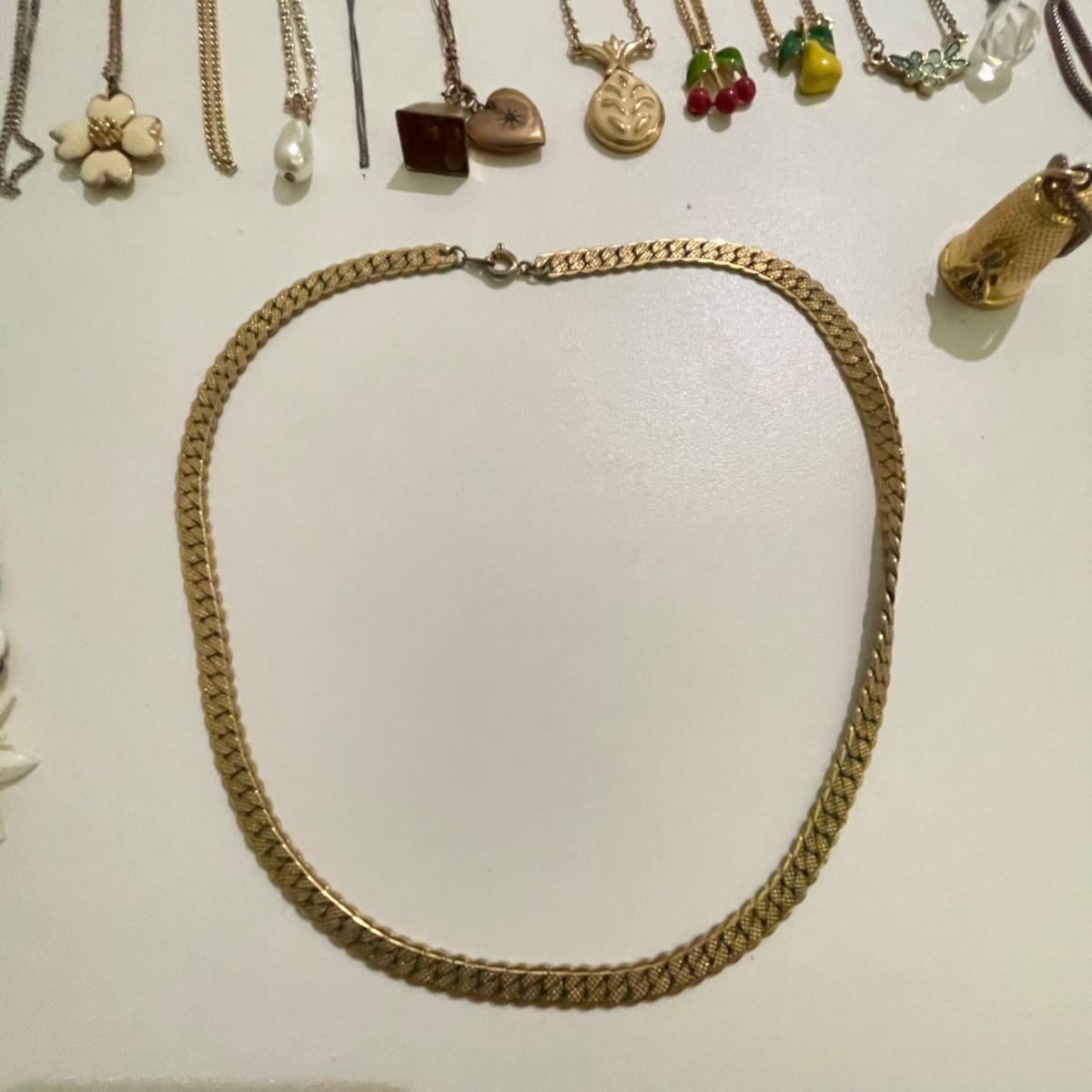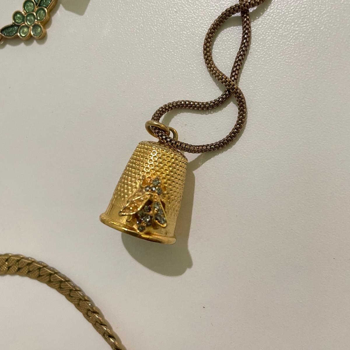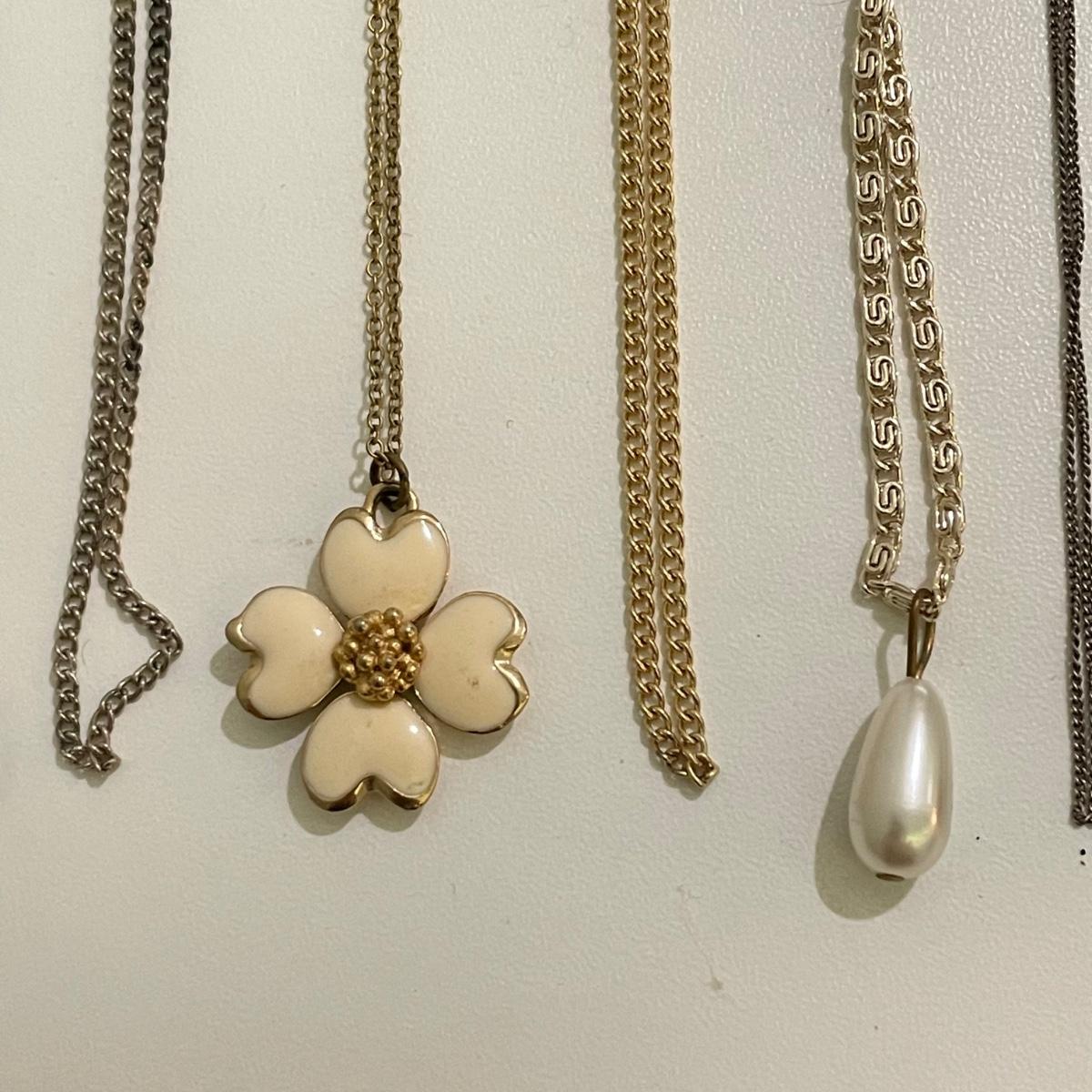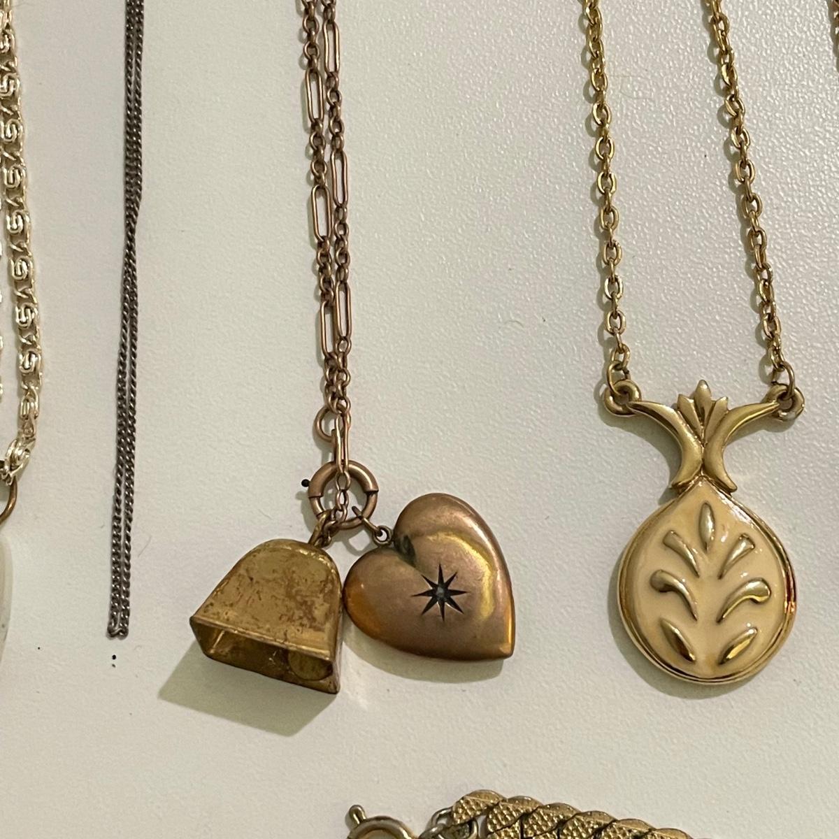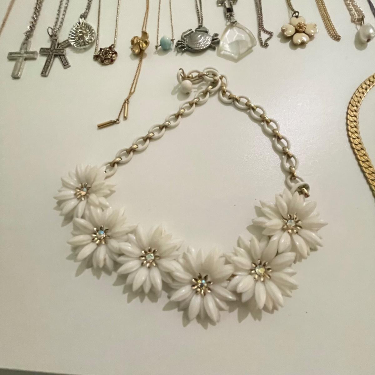 Twenty eight necklaces, many with pendants. Four appear to be enamel- the fruit and ivory flower. The bee thimble is the only marked pendant, see photos. The white floral choker is a mix of metal and rhinestones and has plastic petals. See images. Shipping available.