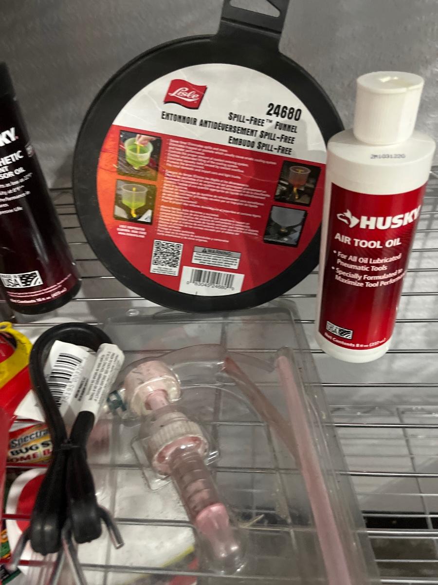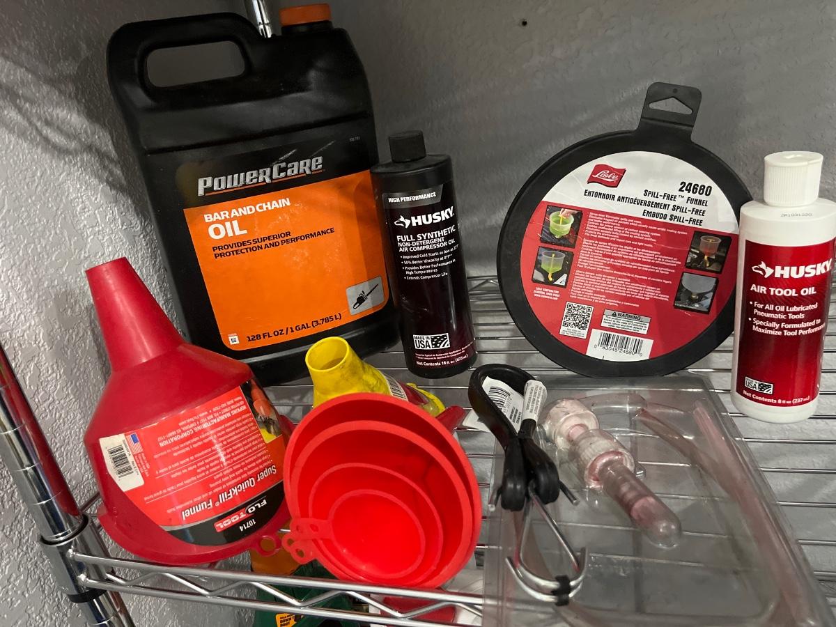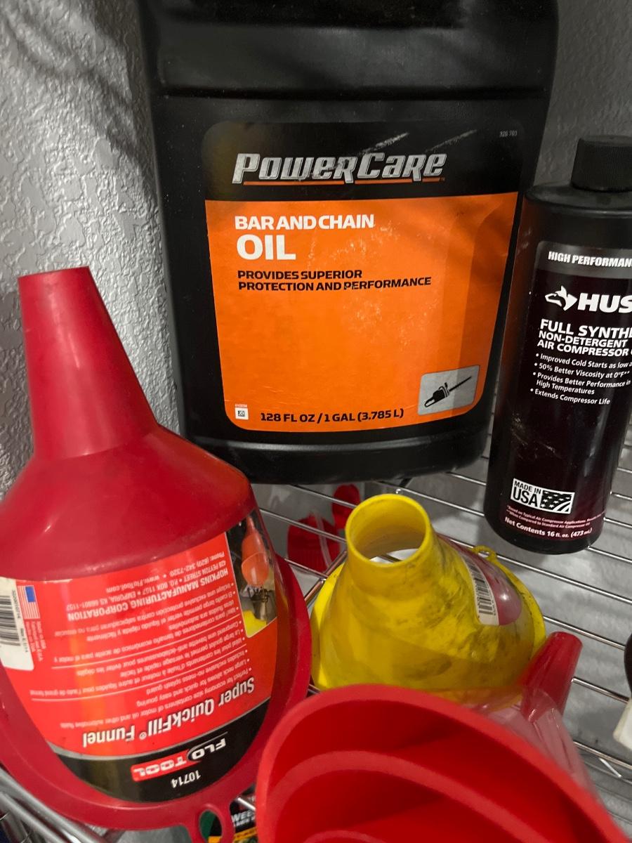 Chainsaw and air, compressor oil, funnels, miscellaneous