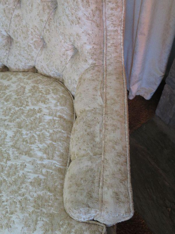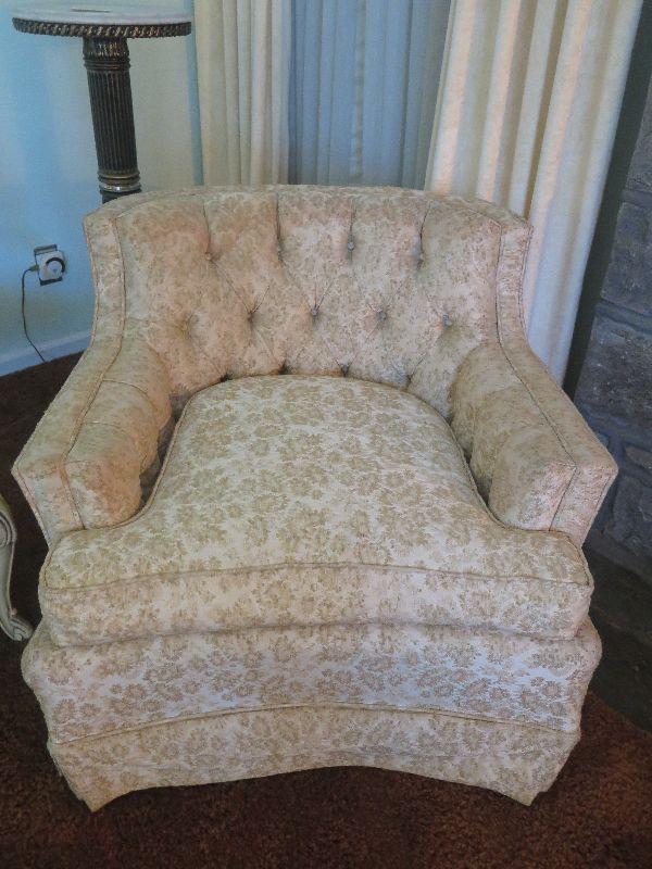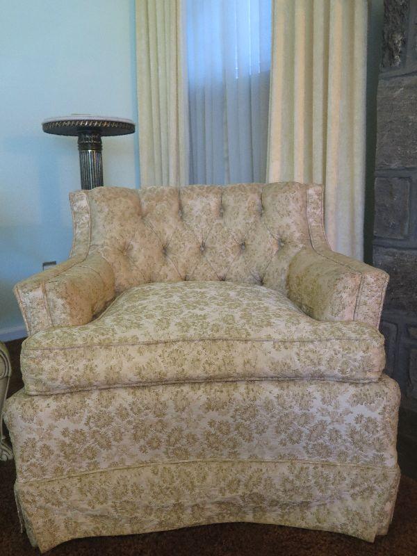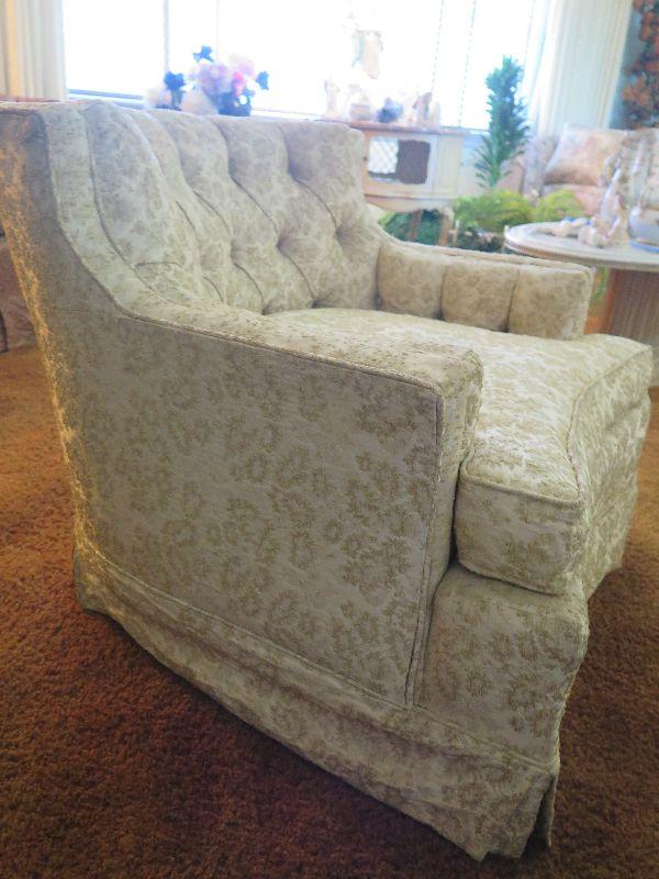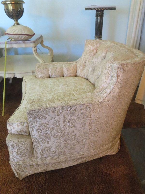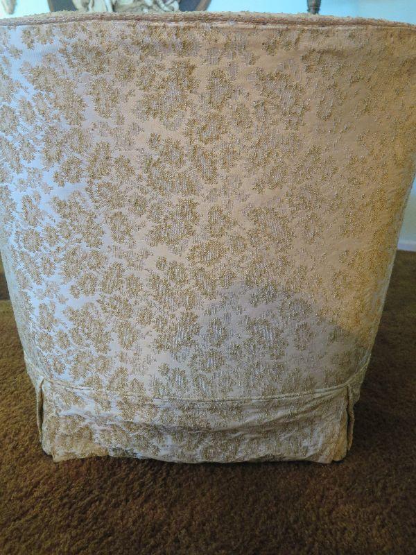Mid century chair with gold brocade upholstery. Please review all photos and read Terms and Conditions before placing a bid. Pick up is Wednesday, November 20 from 4-7pm and Saturday, November 23 from 9am-2pm in Mantua, New Jersey. All sales are final. All sales are as is, where is. Please bring all boxes, tools, and muscle needed to remove your items. Any photo props are not included. All measurements are approximate. Items come from dog-friendly home.