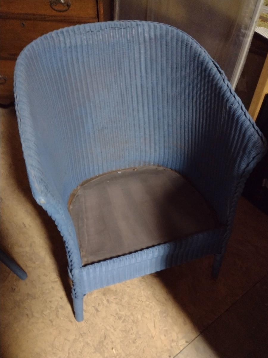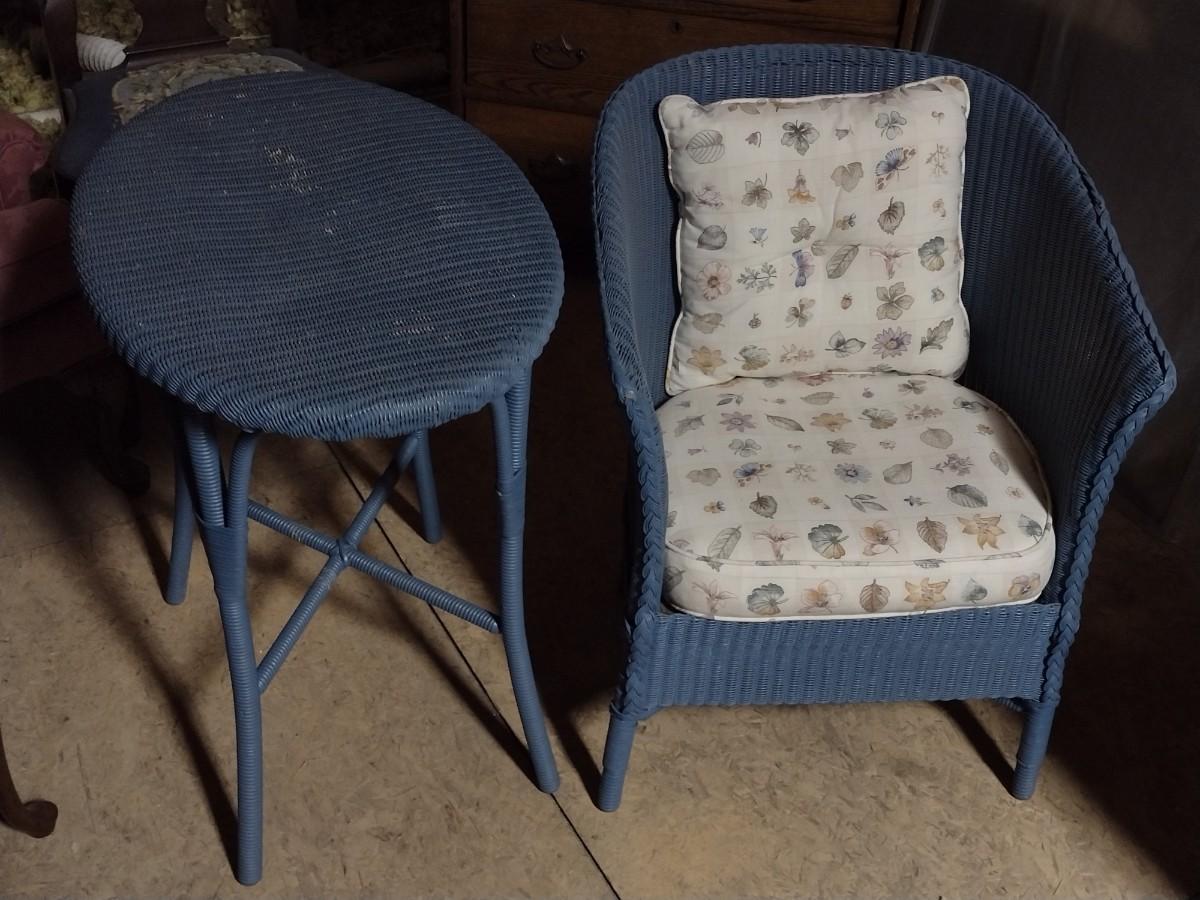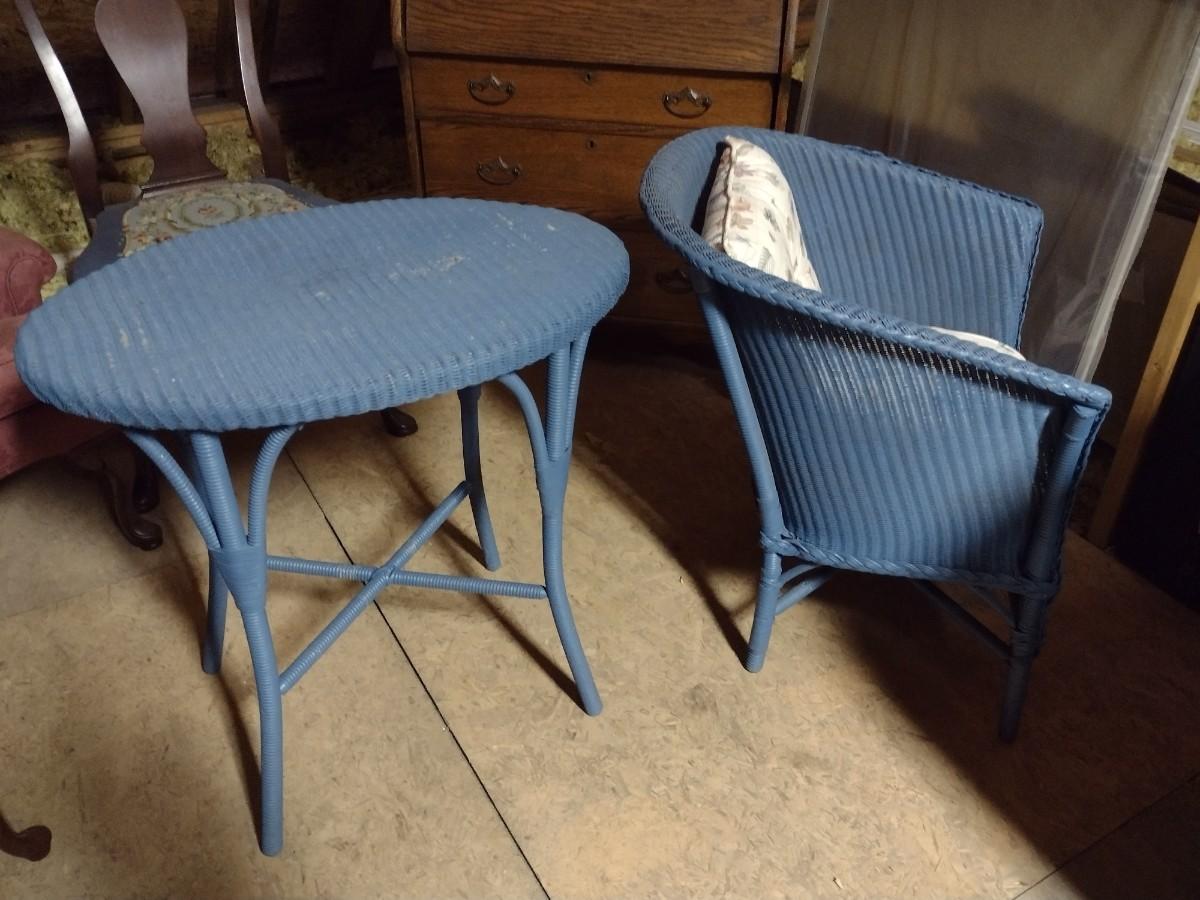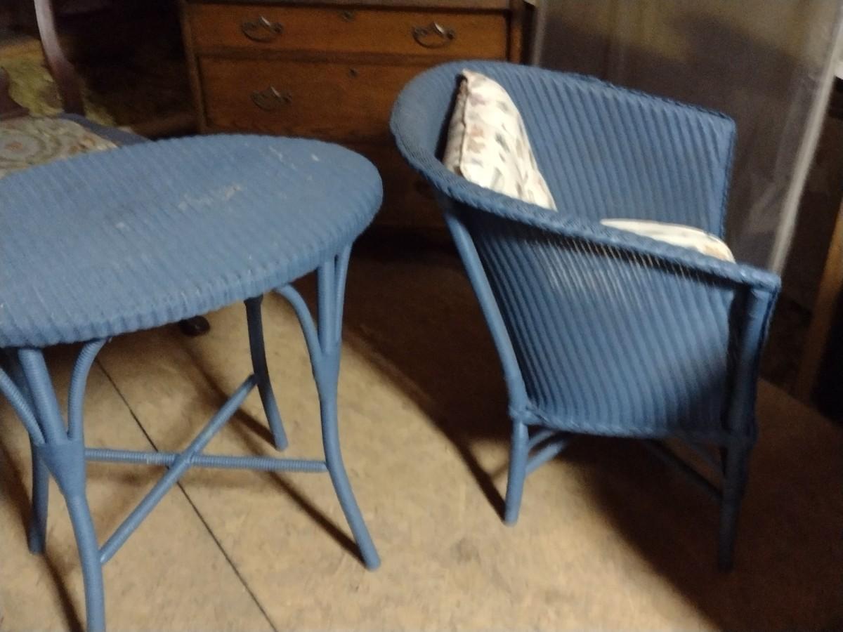 Antique Wicker Weave Chair and Table Set with Cushions upstairs item. Please bring assistance to remove from the home