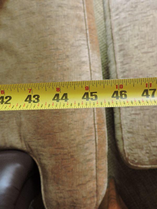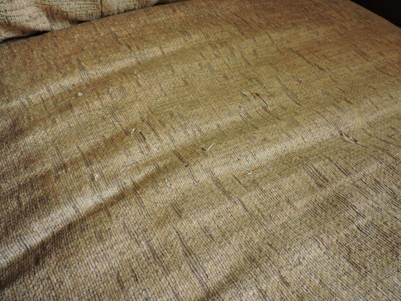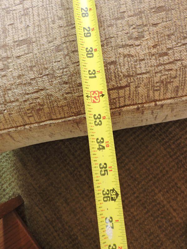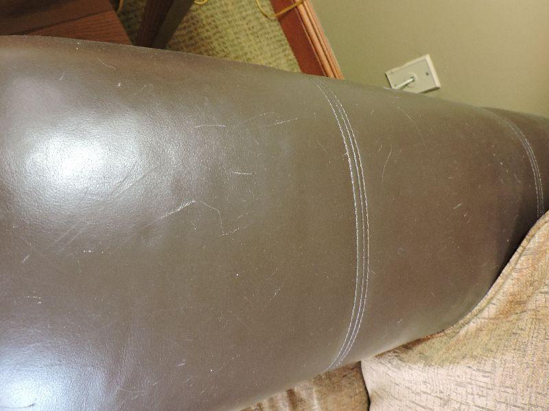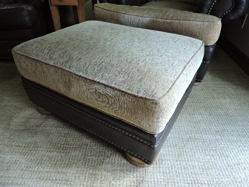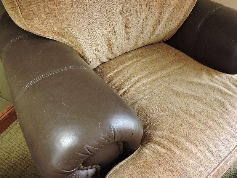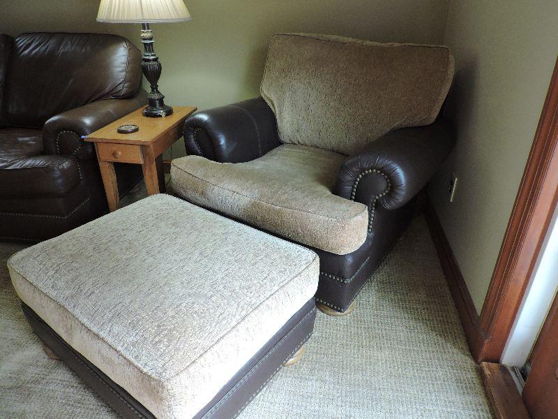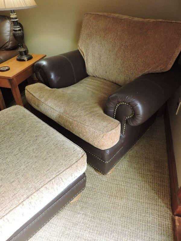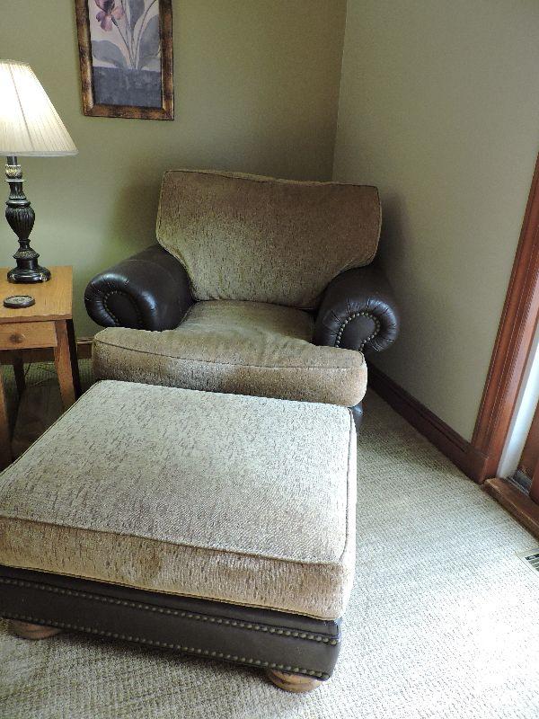 Upholstered chair and ottoman with nail head, leather trim. Some cat scratches and wear. Bring help to move. Please read Terms and Conditions before placing a bid. Pick up is Friday, October 25th between 4 and 7, and Saturday, October 26th between 9 and 1. Props included in photos are not included in listing. All measurements are approximate. Comes from home with cats.