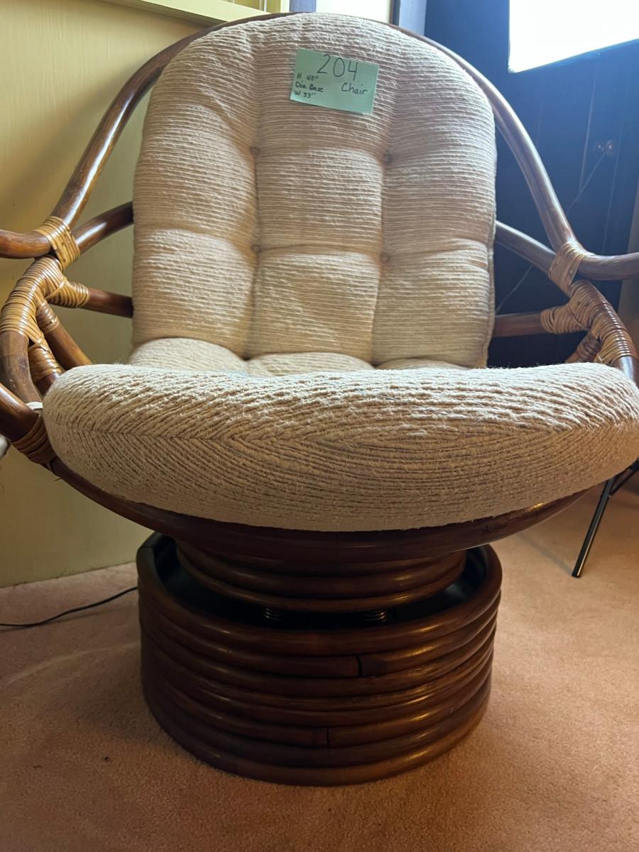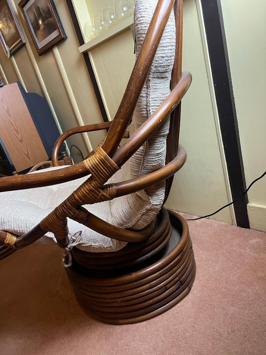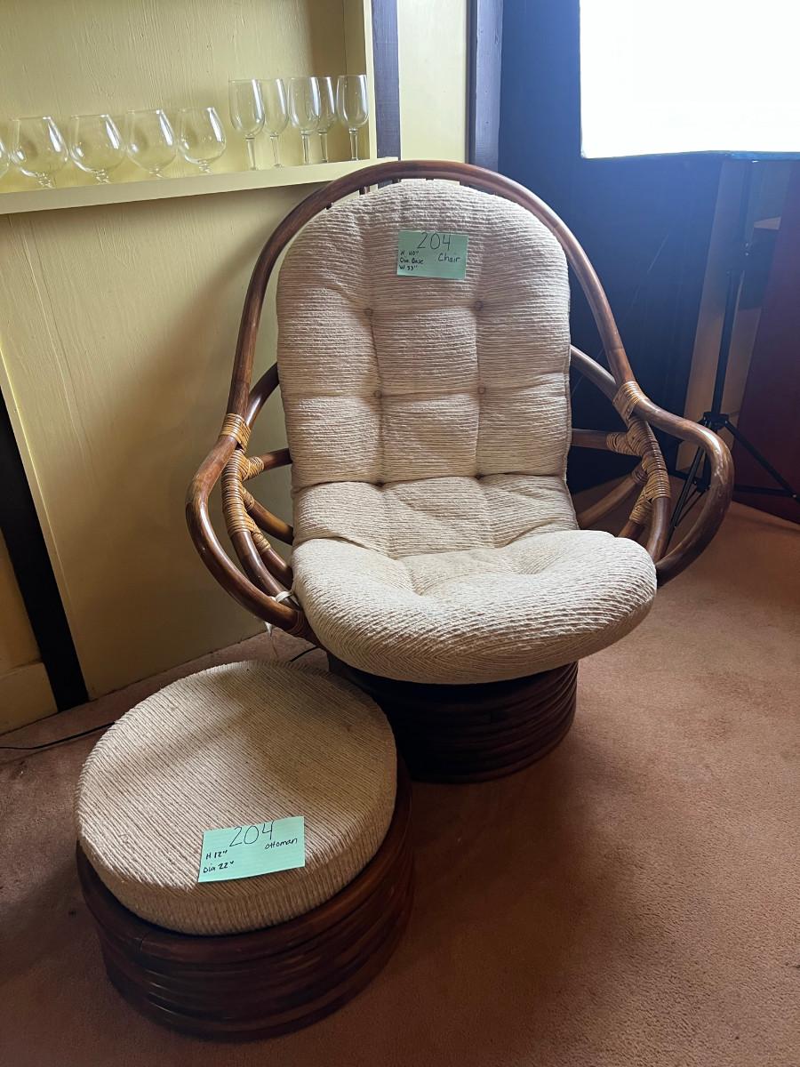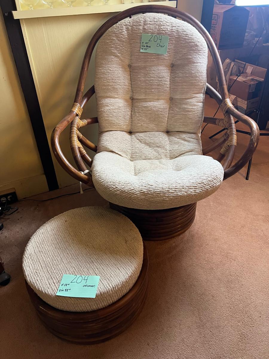 Rattan swivels chair 40" x 33" diam base, ottoman 12" x 22"