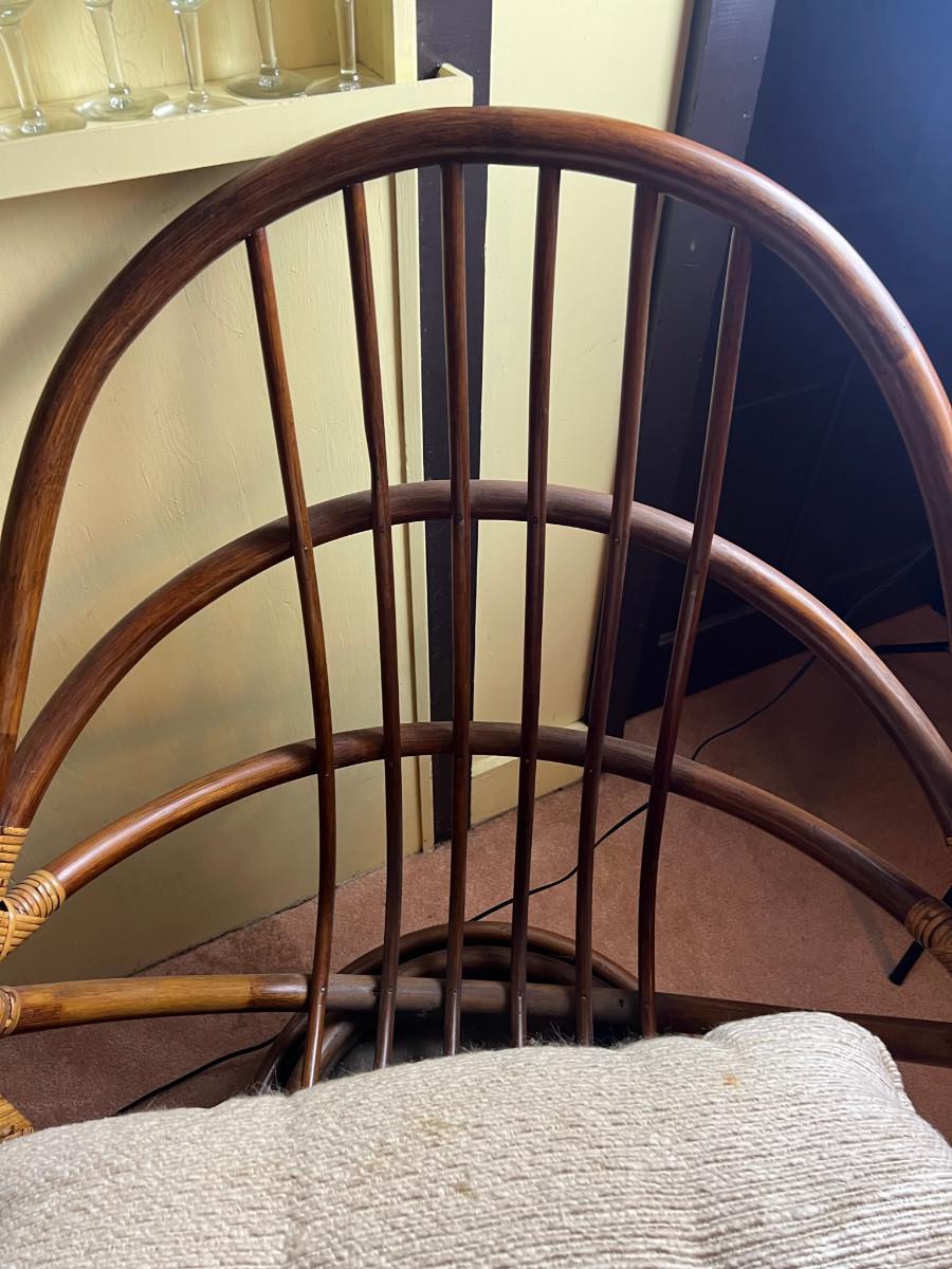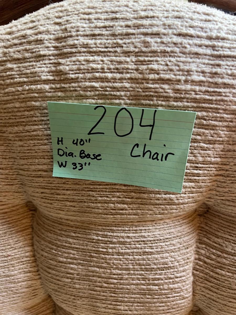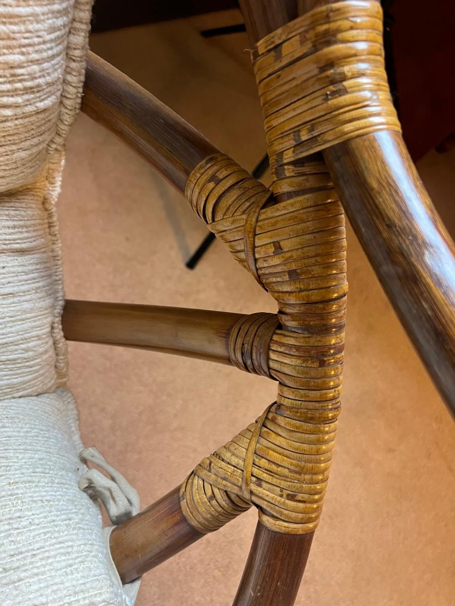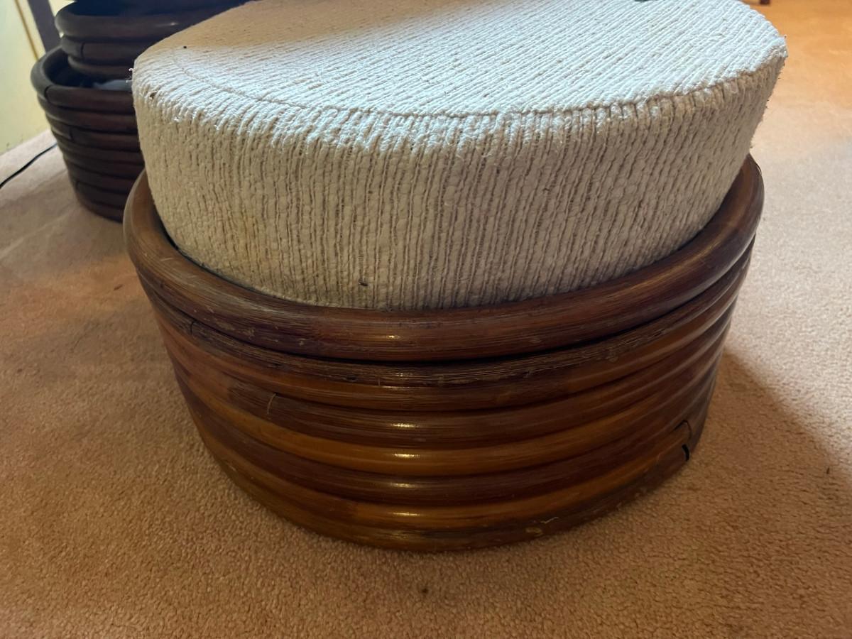 Rattan swivels chair 40" x 33" diam base, ottoman 12" x 22"