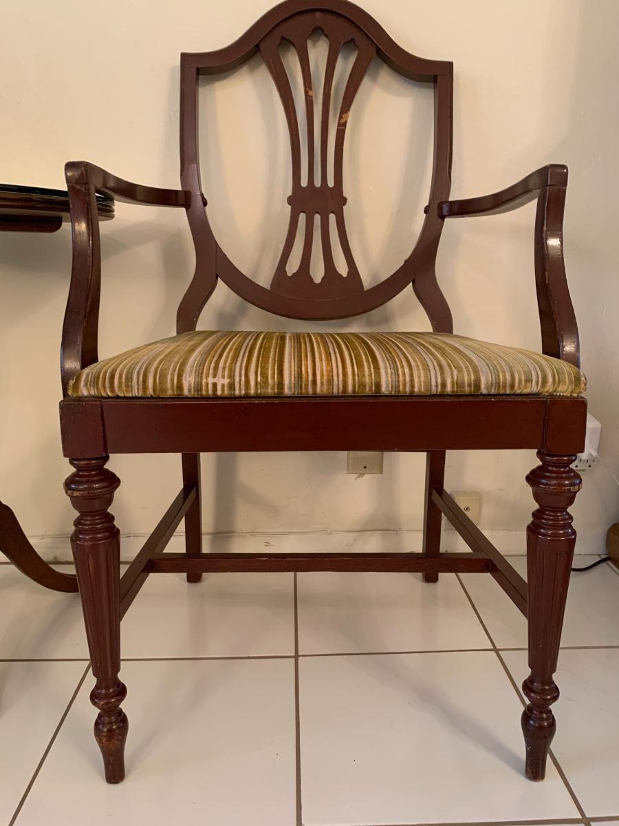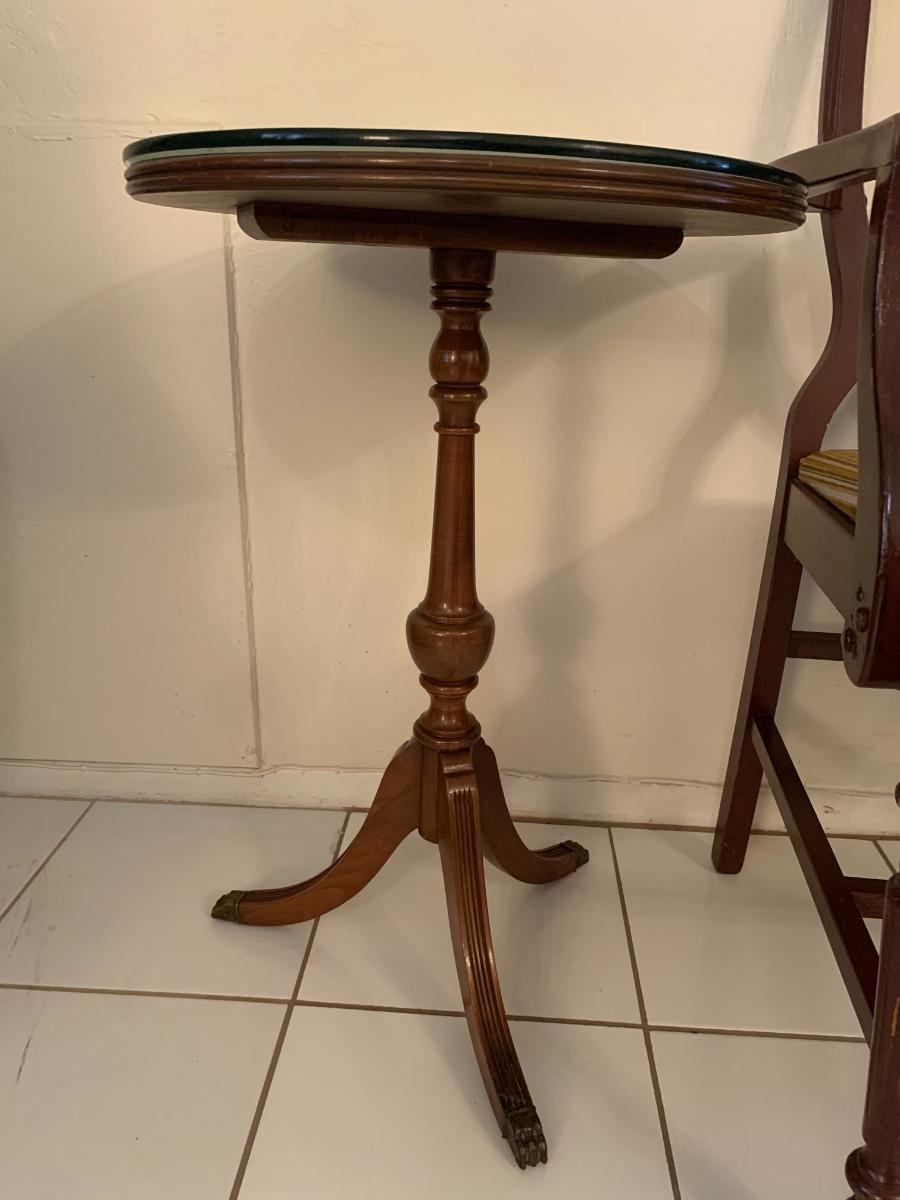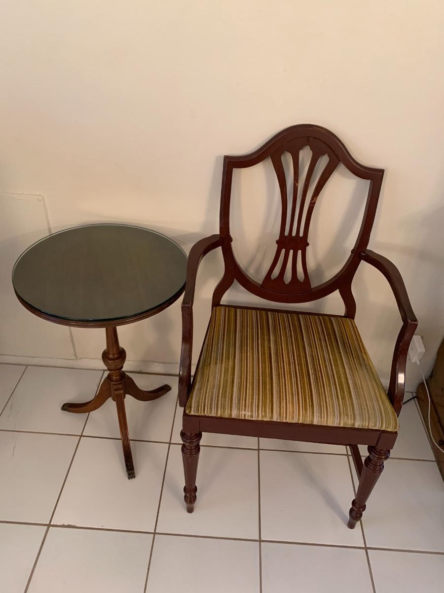 Lot includes a vintage wood chair with velvet upholstery and a wood side table with claw feet and glass top. Both pieces in good sturdy condition.