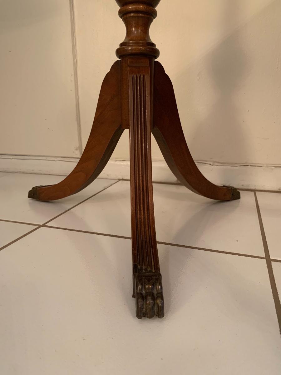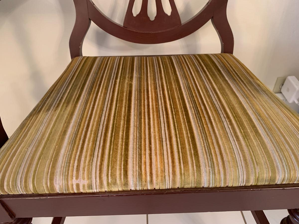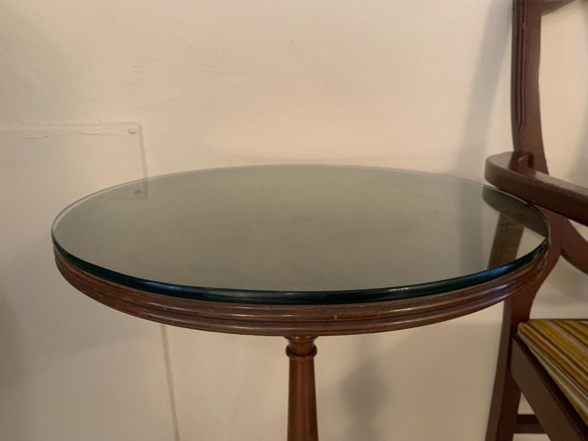 Lot includes a vintage wood chair with velvet upholstery and a wood side table with claw feet and glass top. Both pieces in good sturdy condition.
