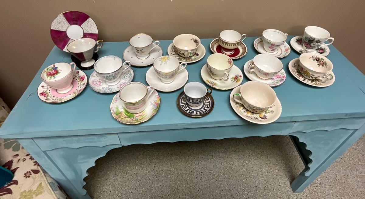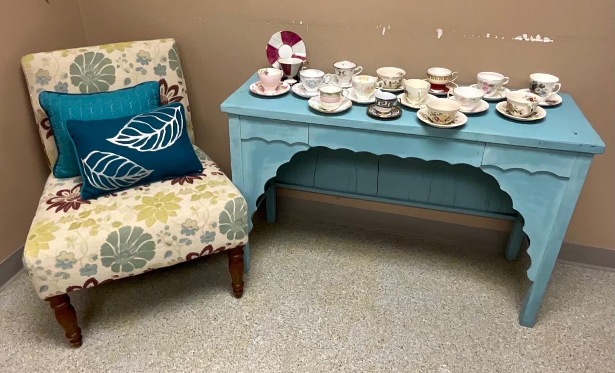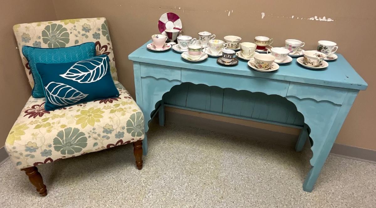 Blue table has a drawer and is 45’’ long. Comes with 2 pillows and 15 tea cups