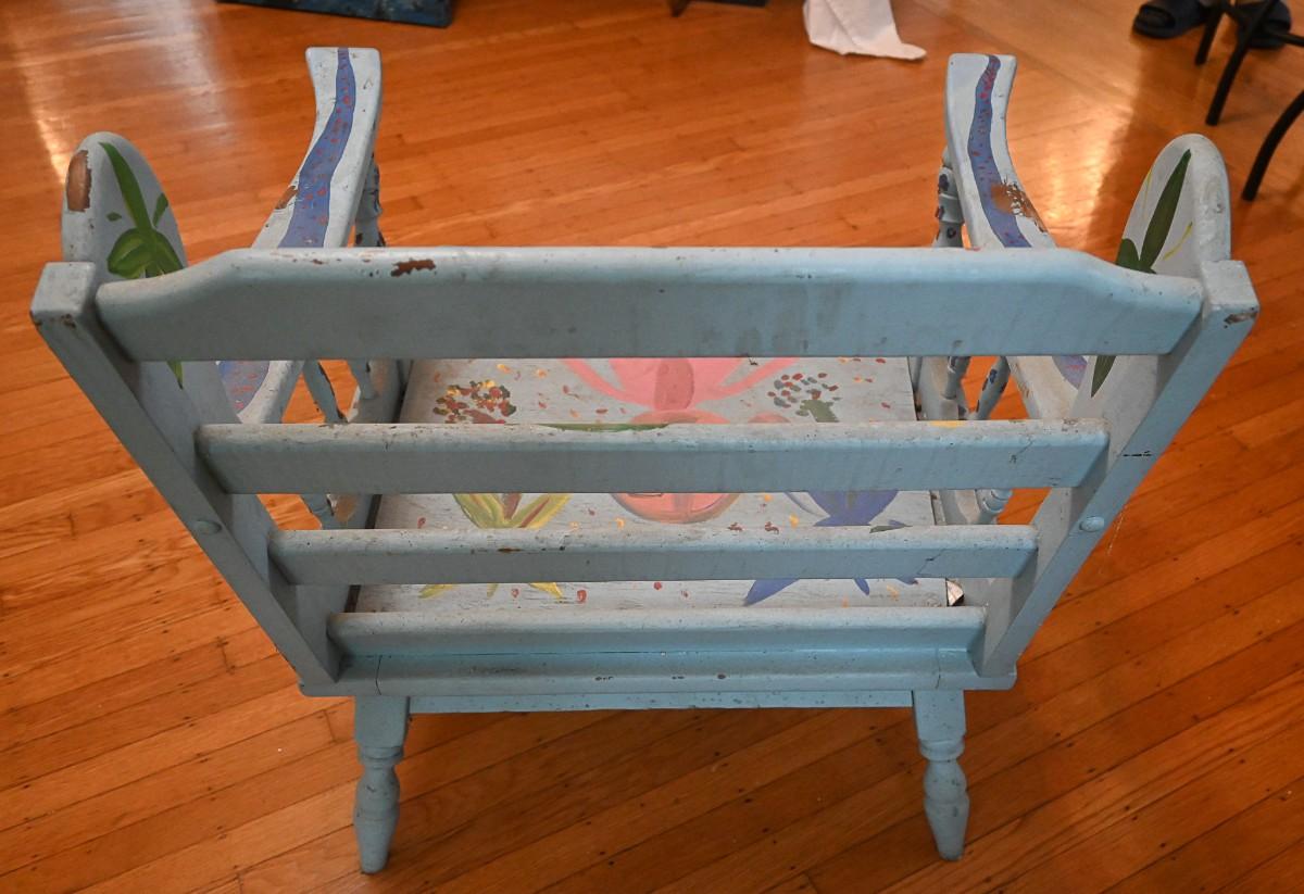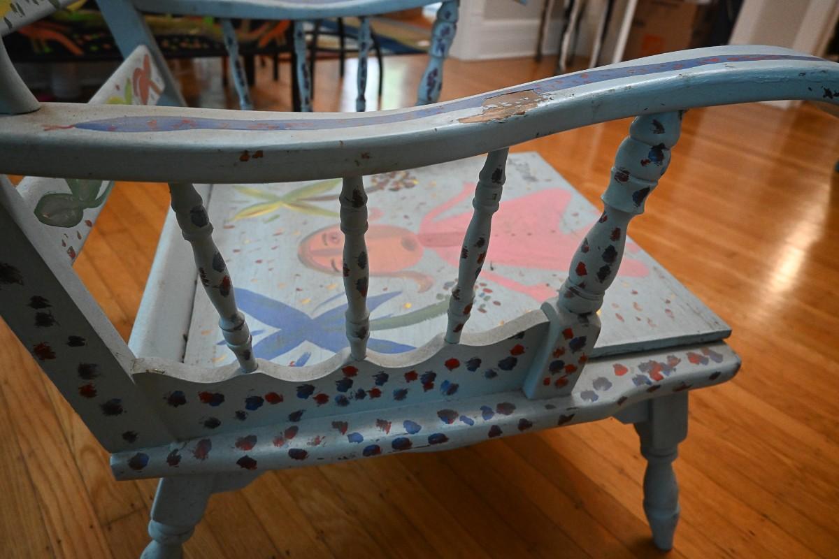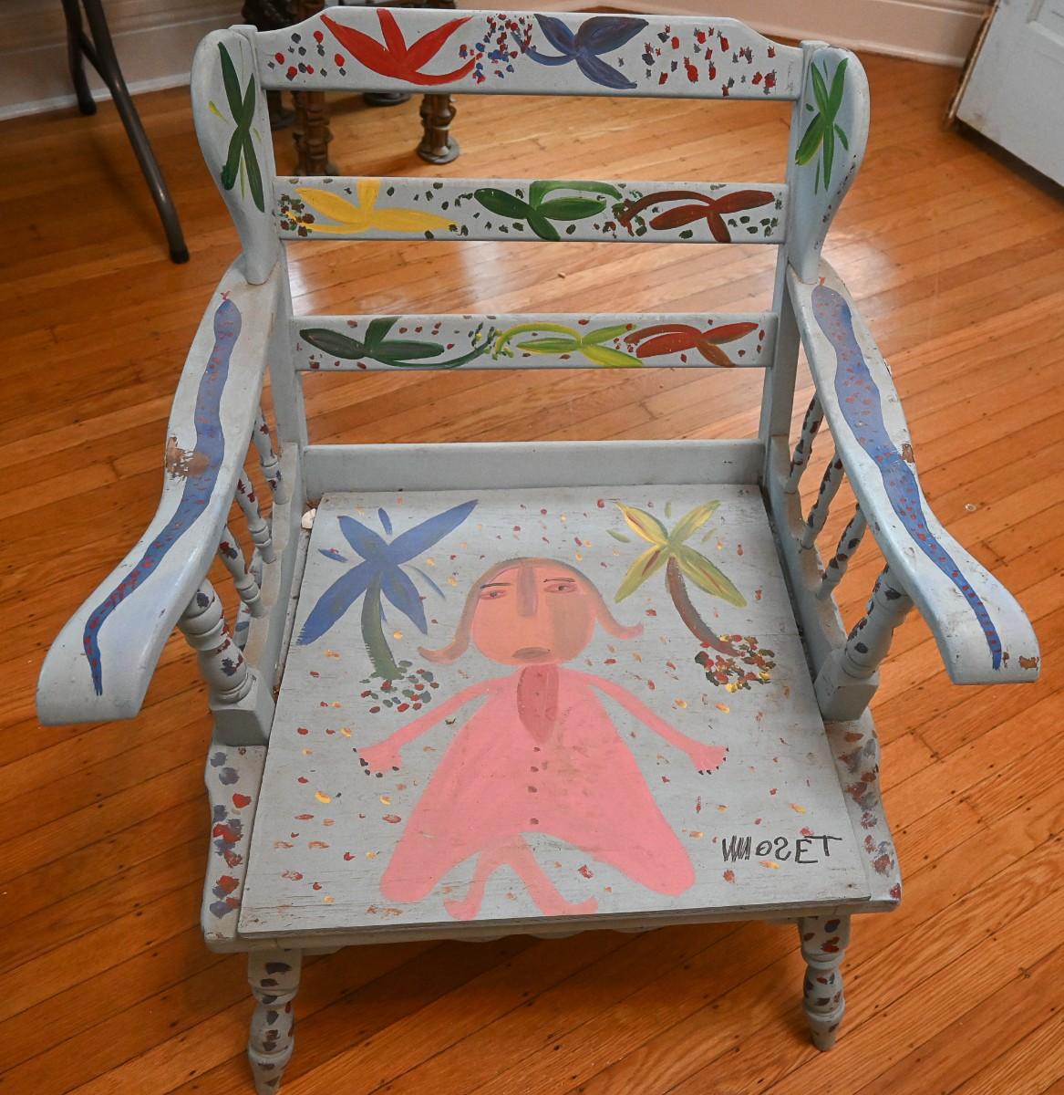 A chair painted by artist Mose Tolliver (American, 1925-2006). Mixed media. Approx. 30.5" x 28" x 29".