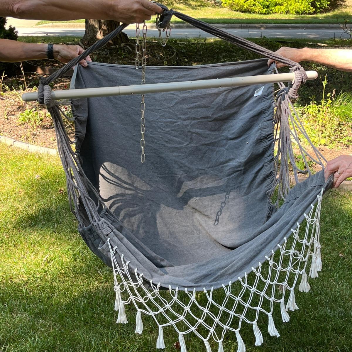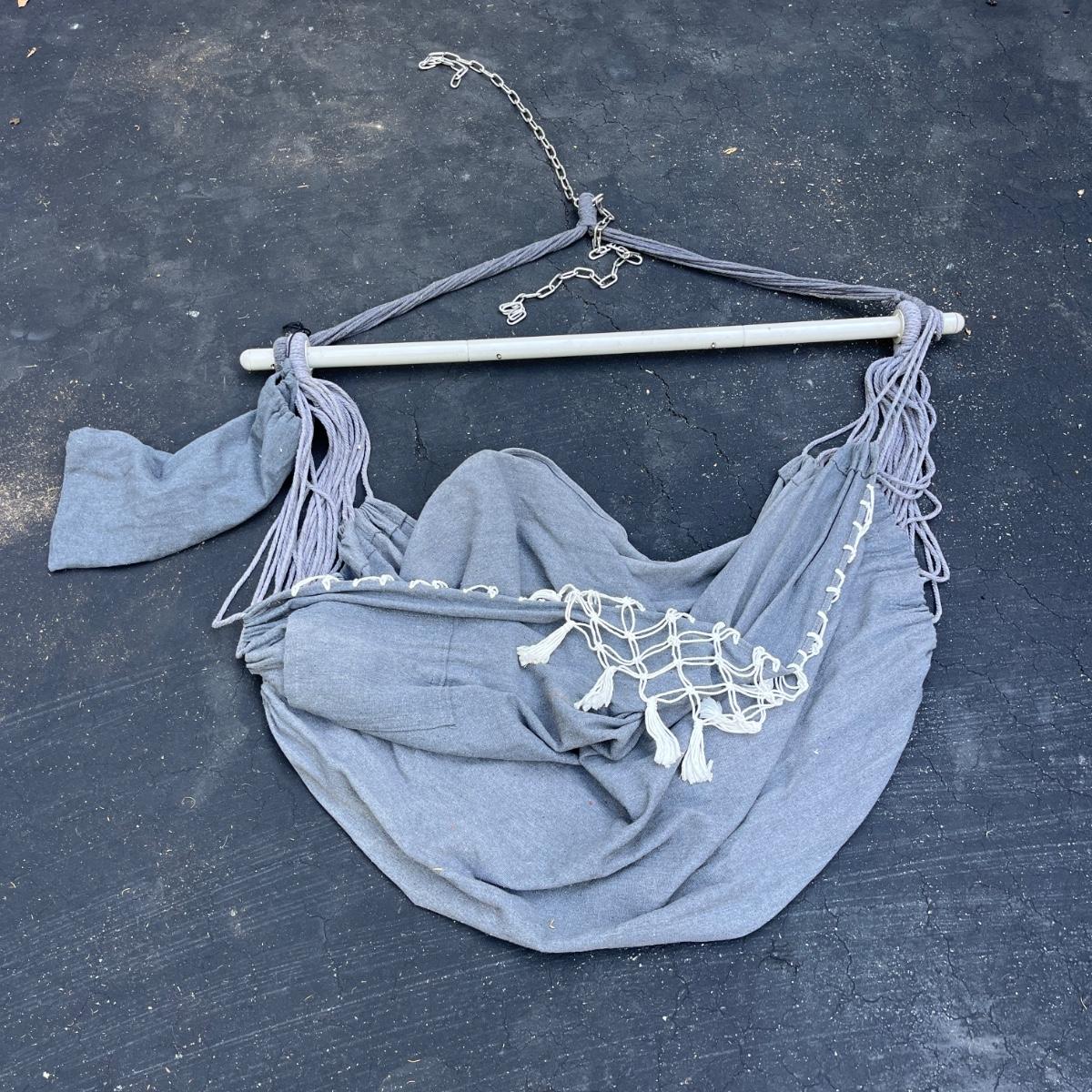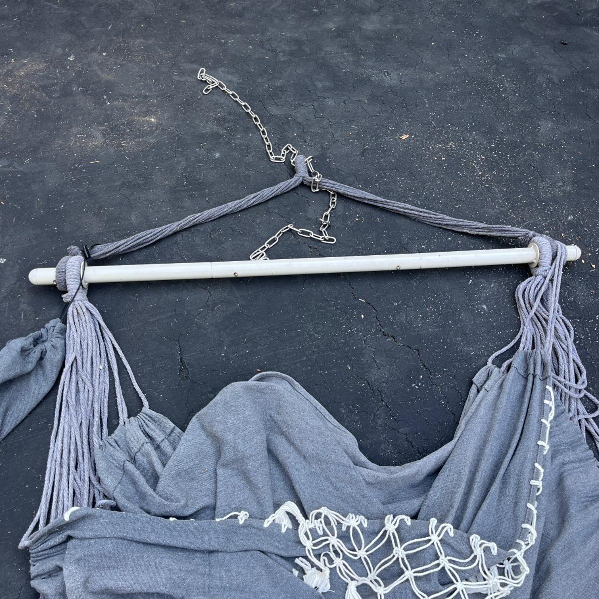 This grey fabric chair hammock has macrame rope accents. It appears to lightly used if at all and measures approximately 44” x 40” x 46”H. It includes mounting hardware.