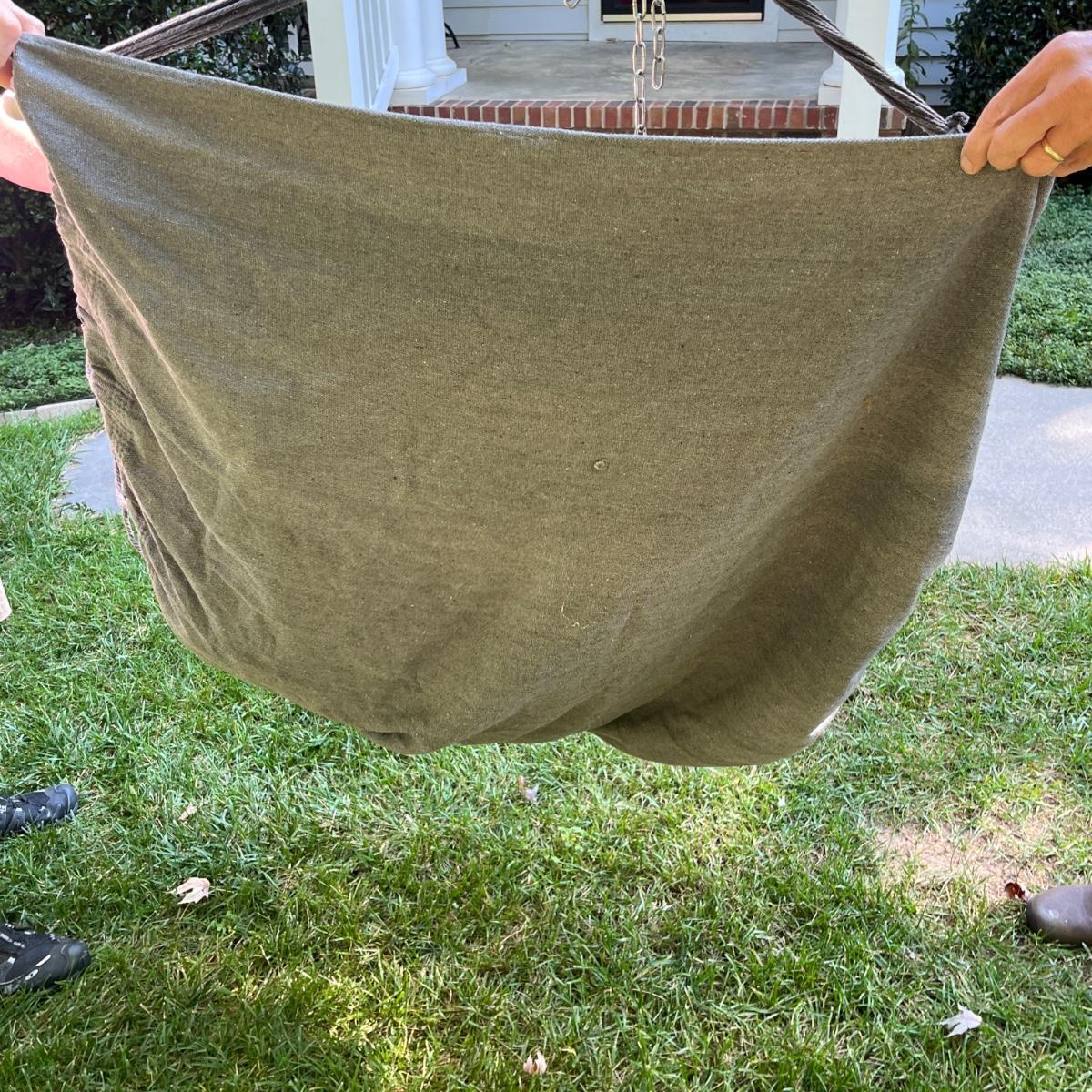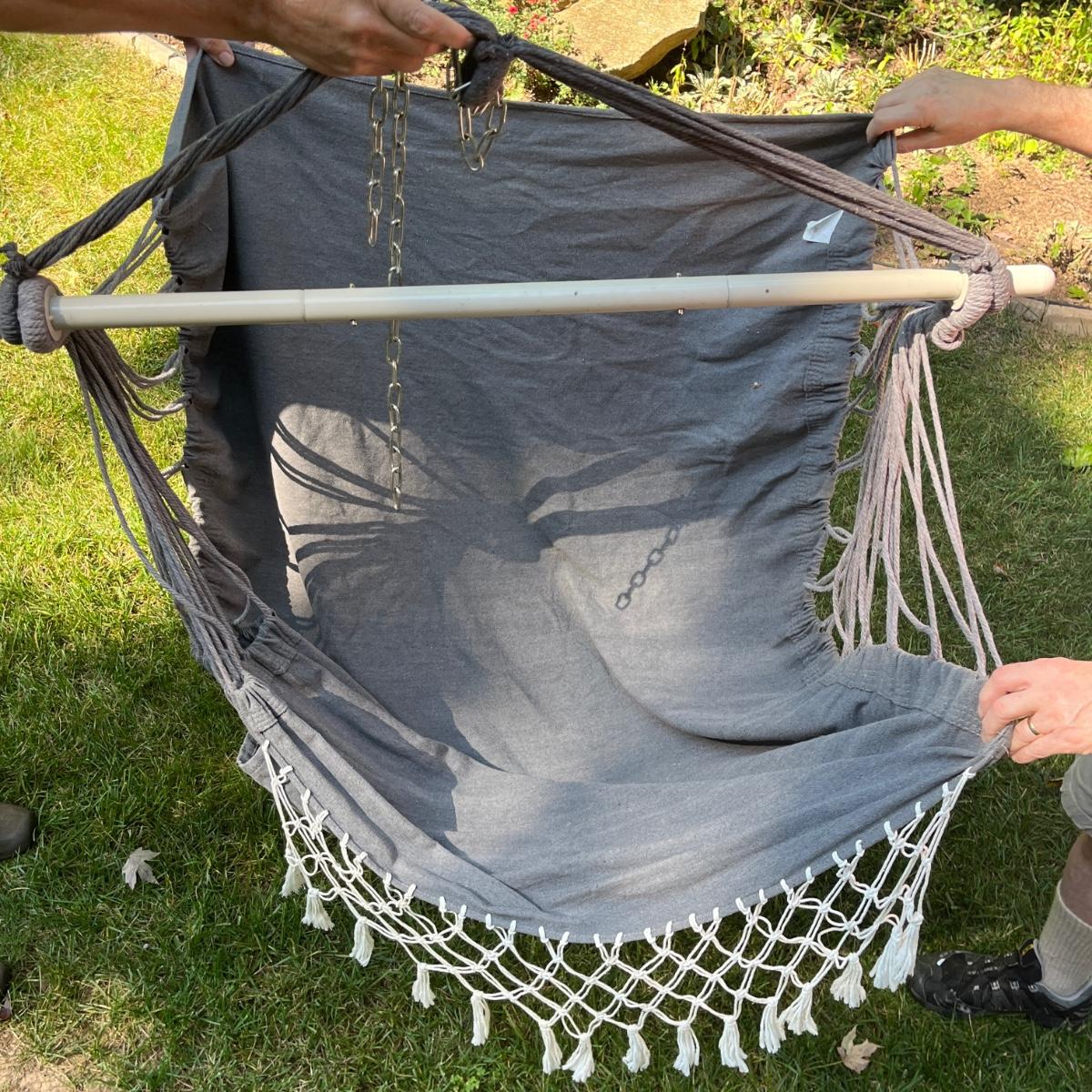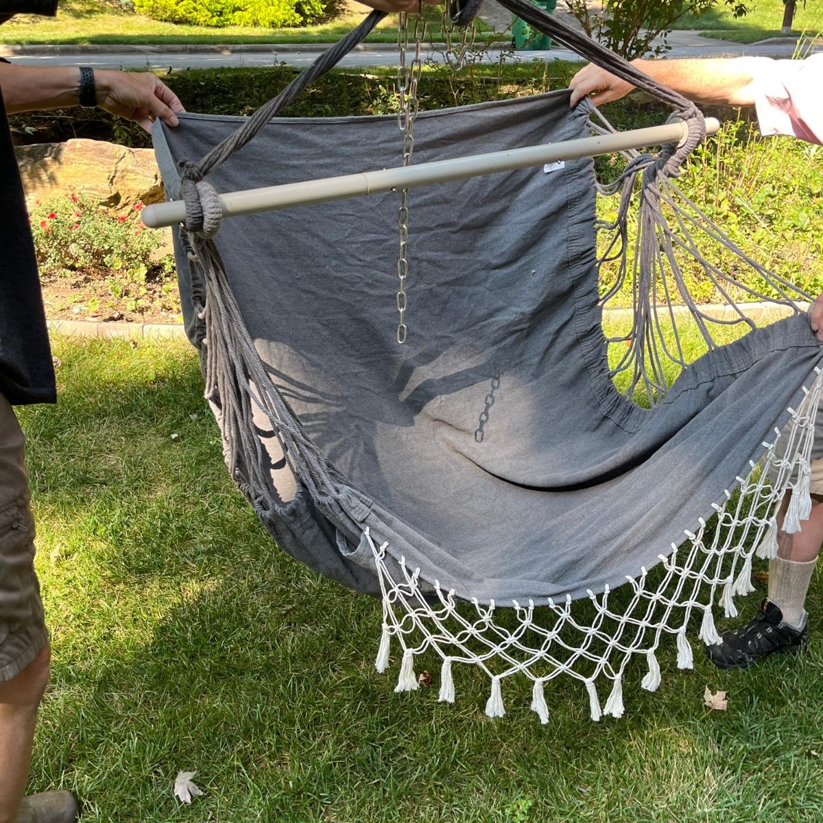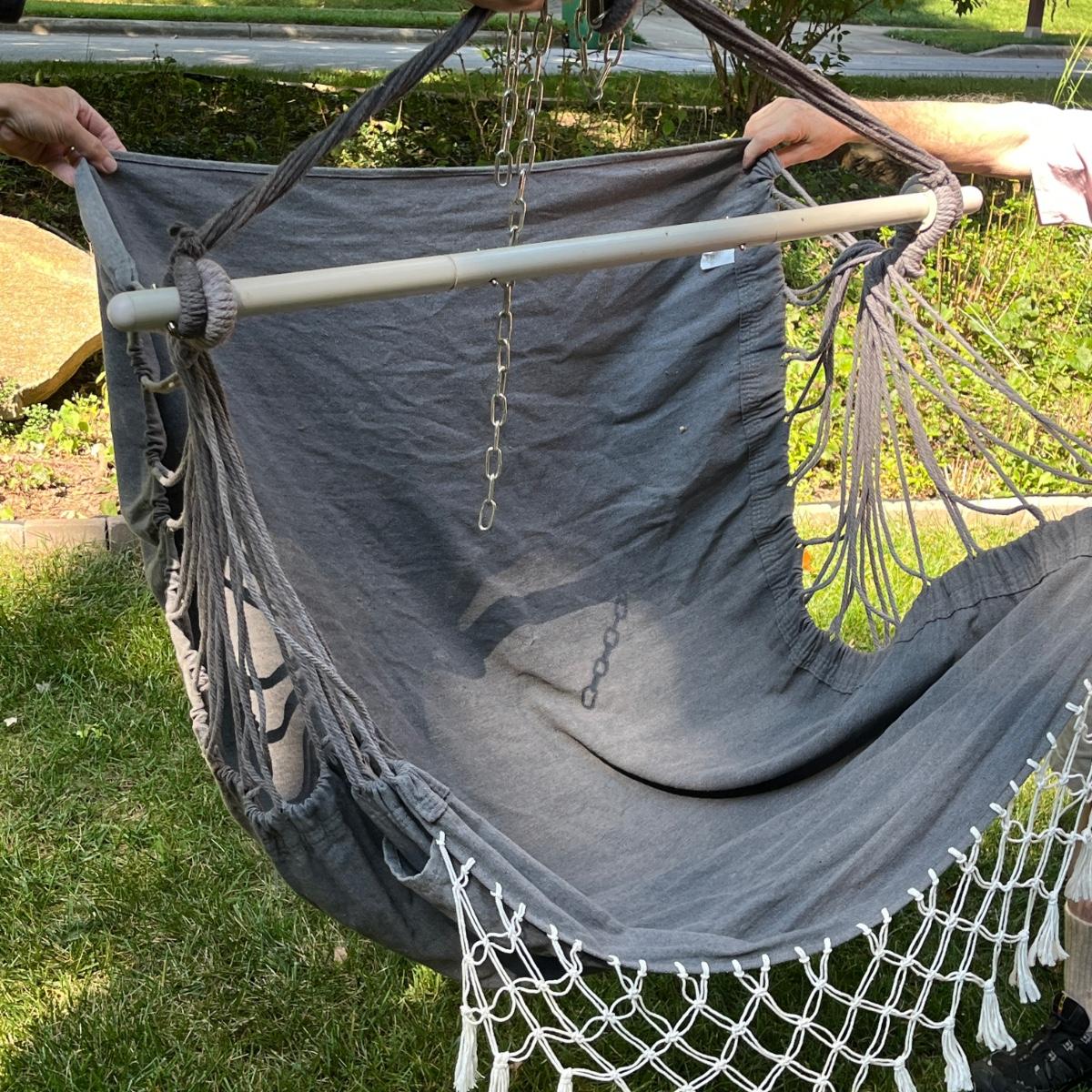 This grey fabric chair hammock has macrame rope accents. It appears to lightly used if at all and measures approximately 44” x 40” x 46”H. It includes mounting hardware.