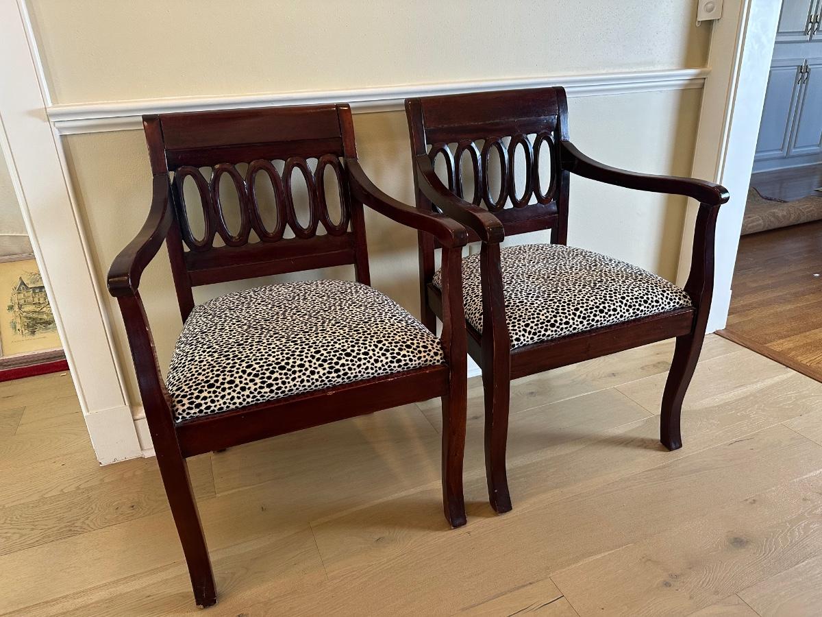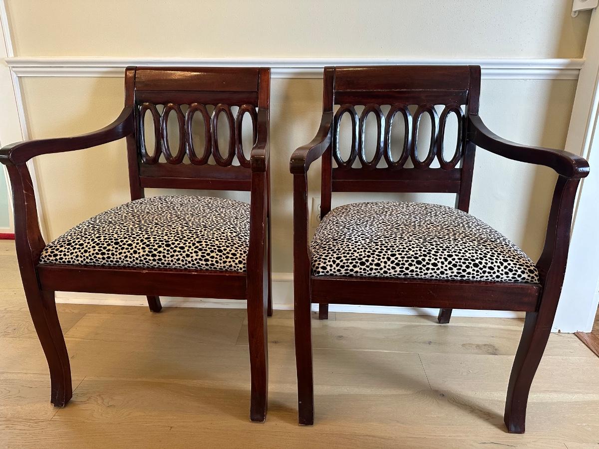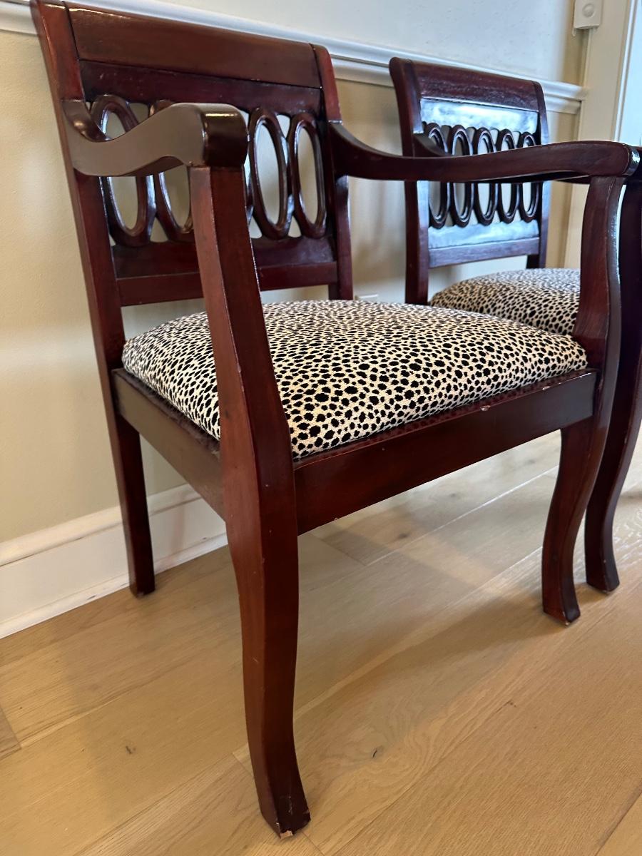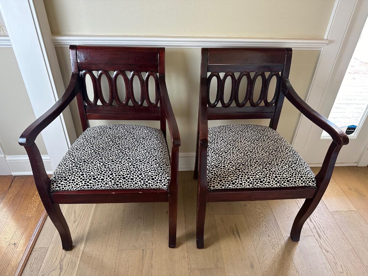 Cushions are in excellent condition! One of the chairs wood is faded on the end of arm rest. Very comfortable chairs!