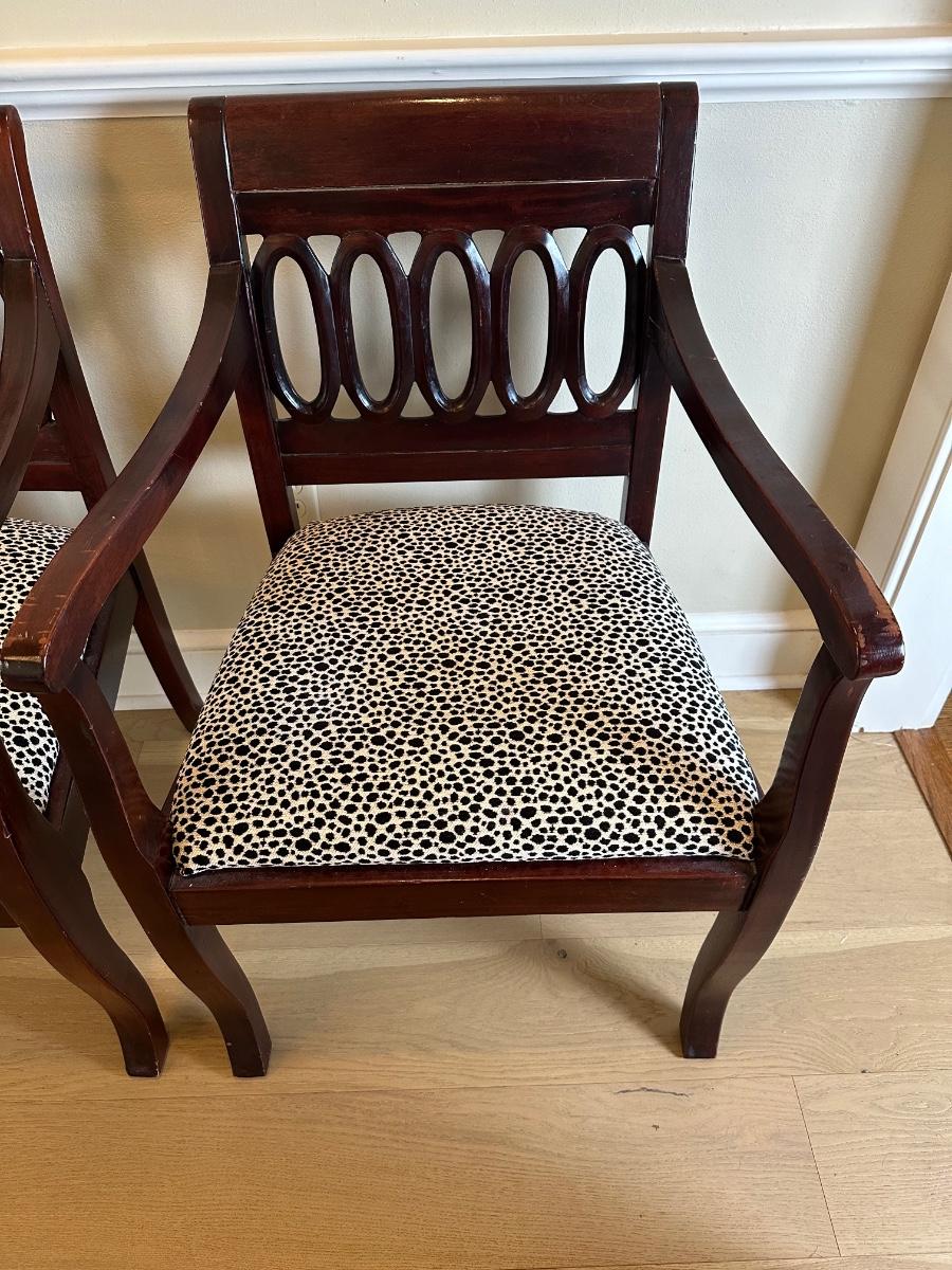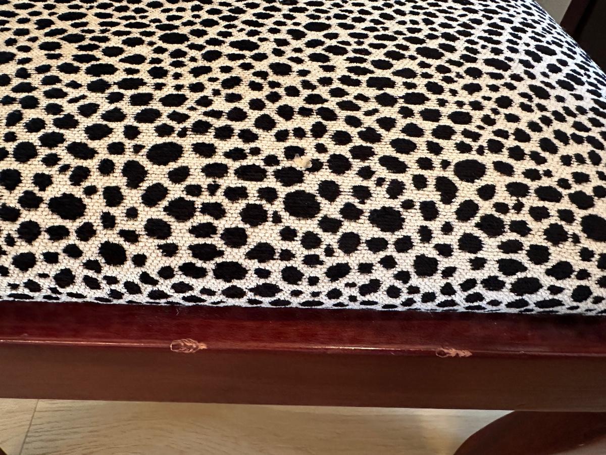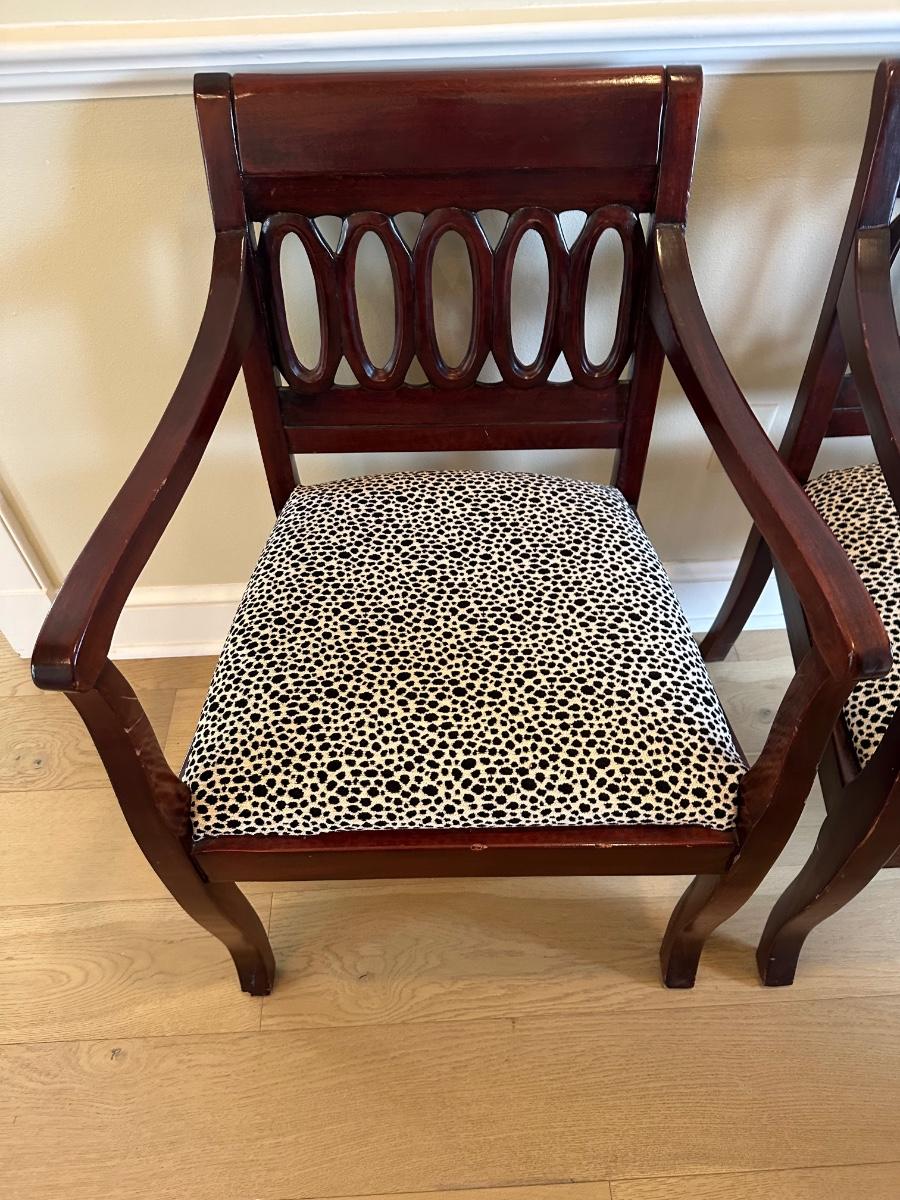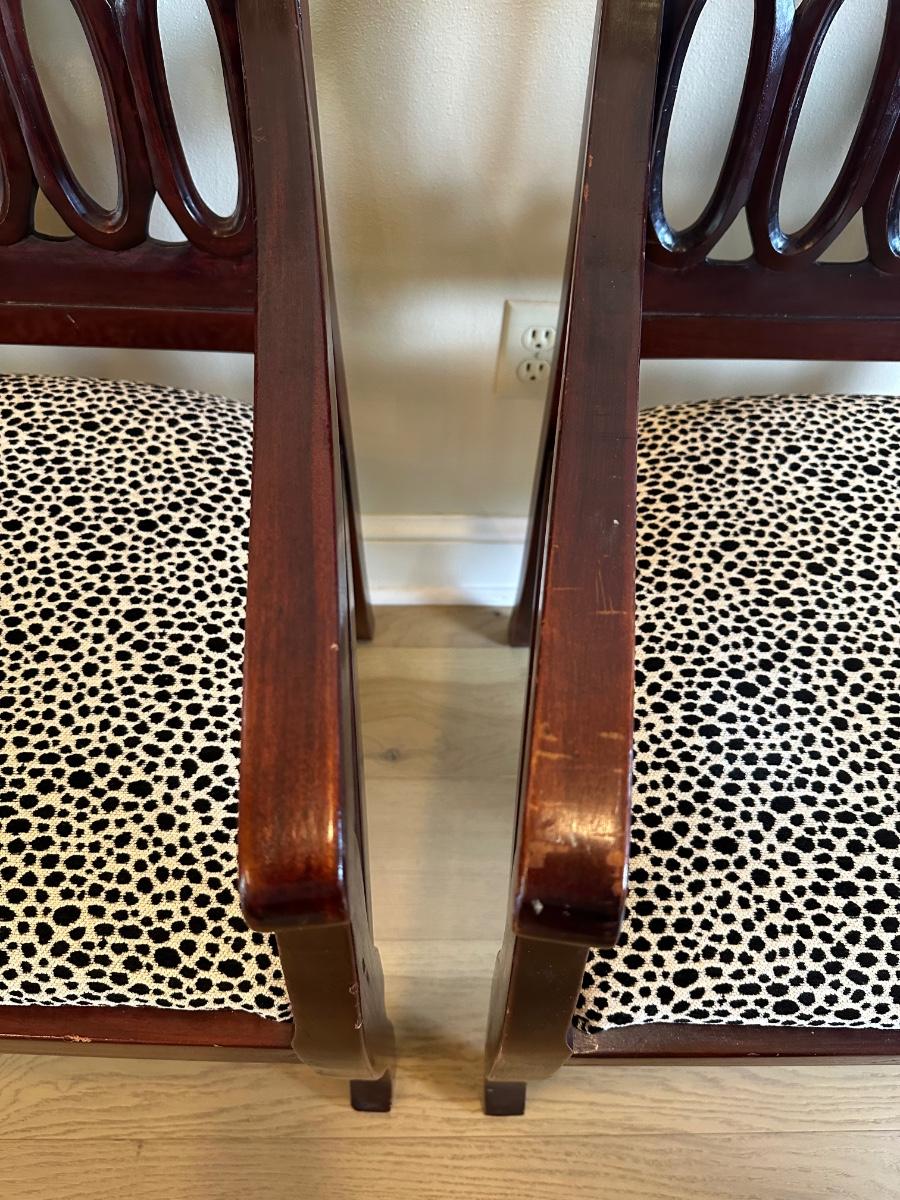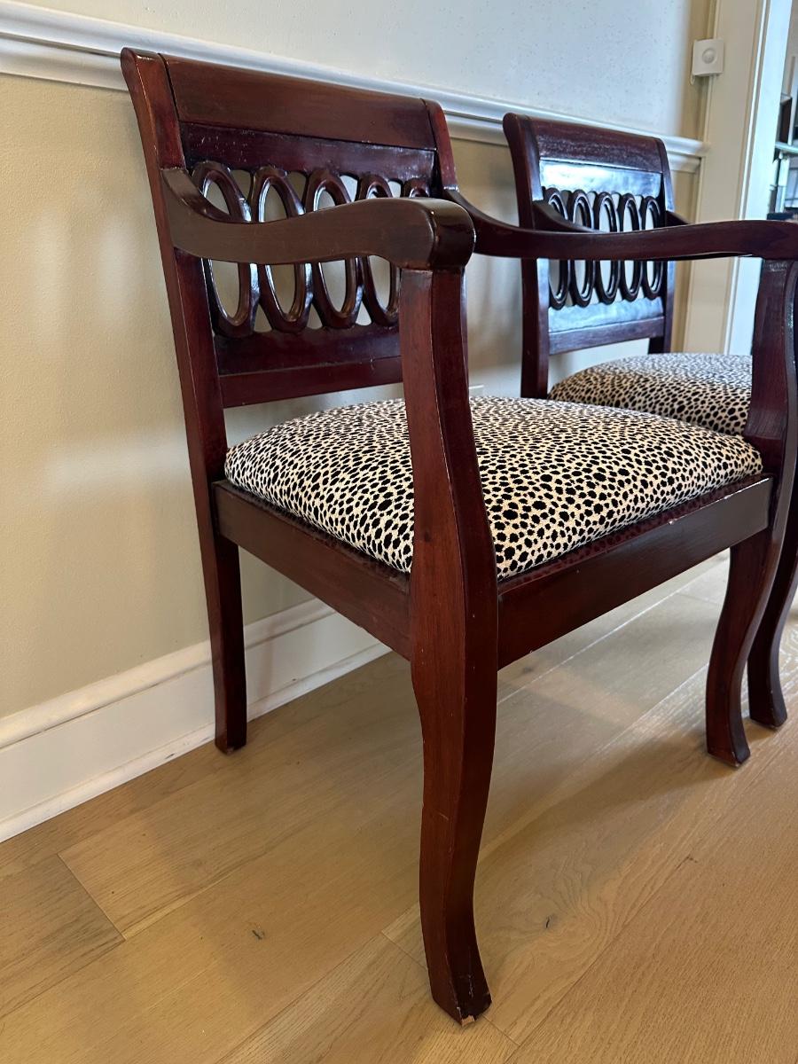 Cushions are in excellent condition! One of the chairs wood is faded on the end of arm rest. Very comfortable chairs!