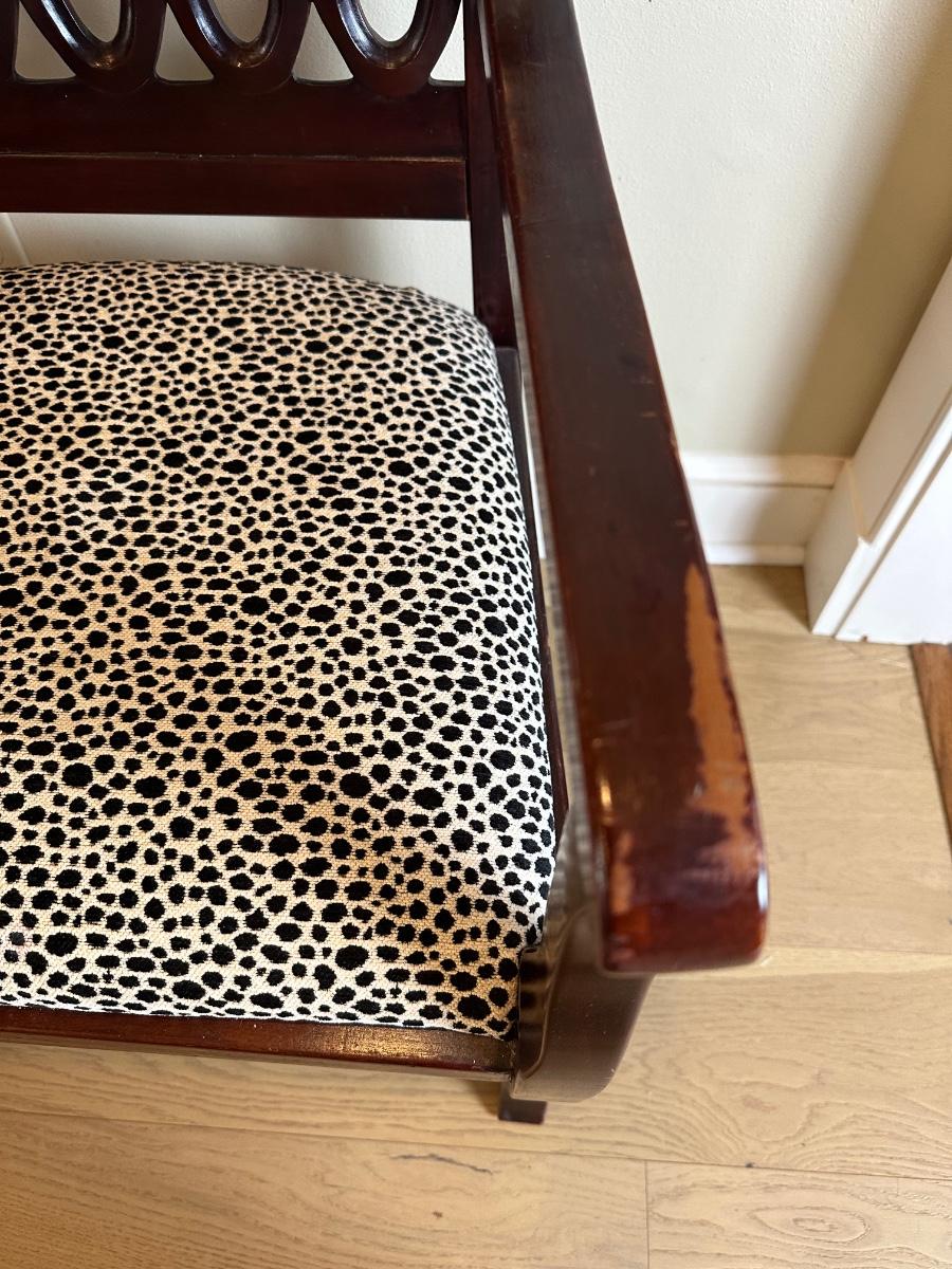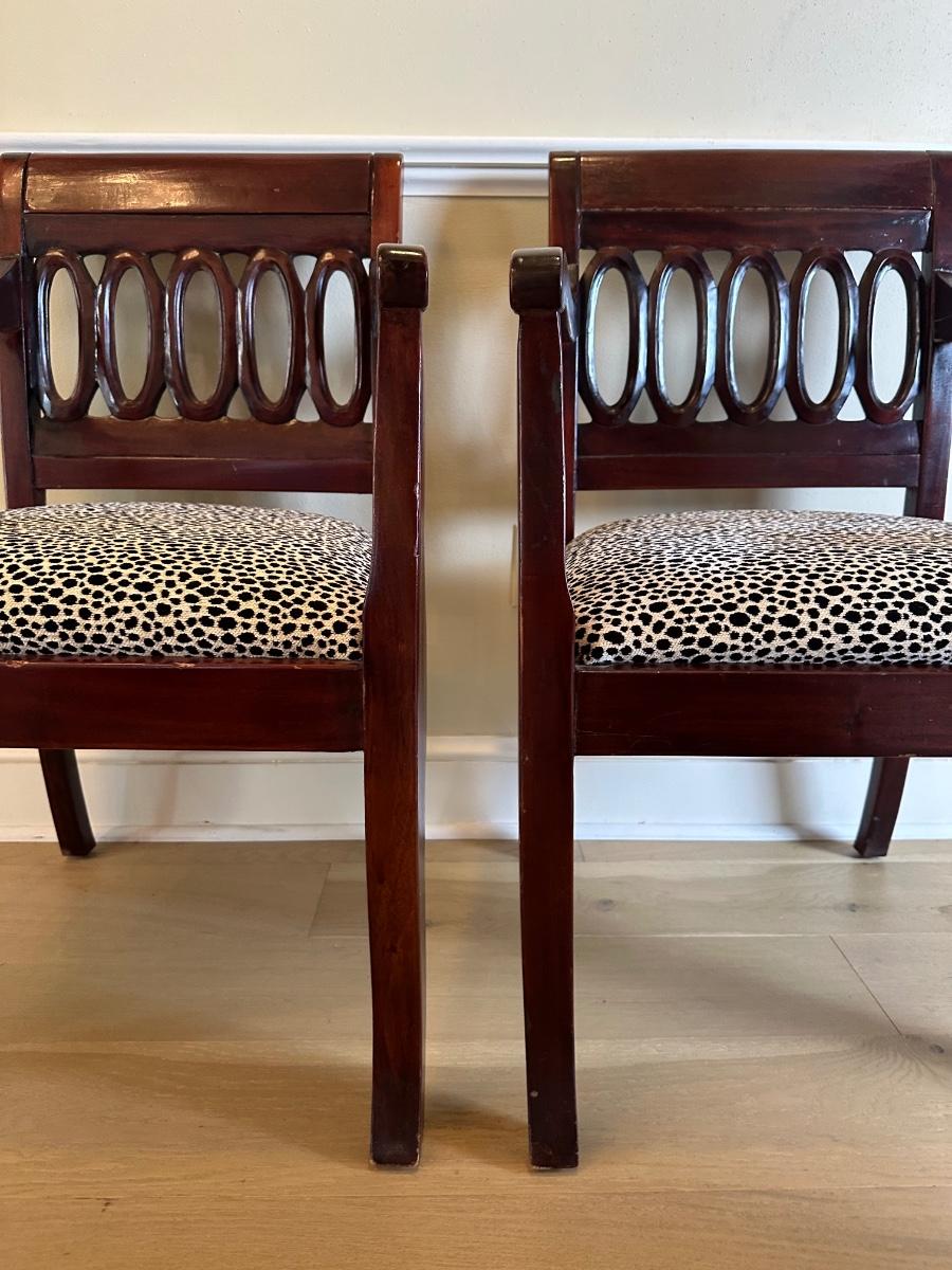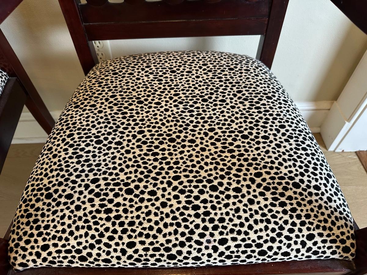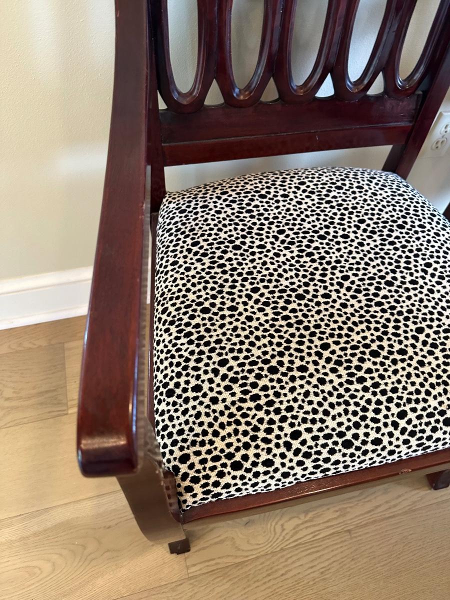 Cushions are in excellent condition! One of the chairs wood is faded on the end of arm rest. Very comfortable chairs!