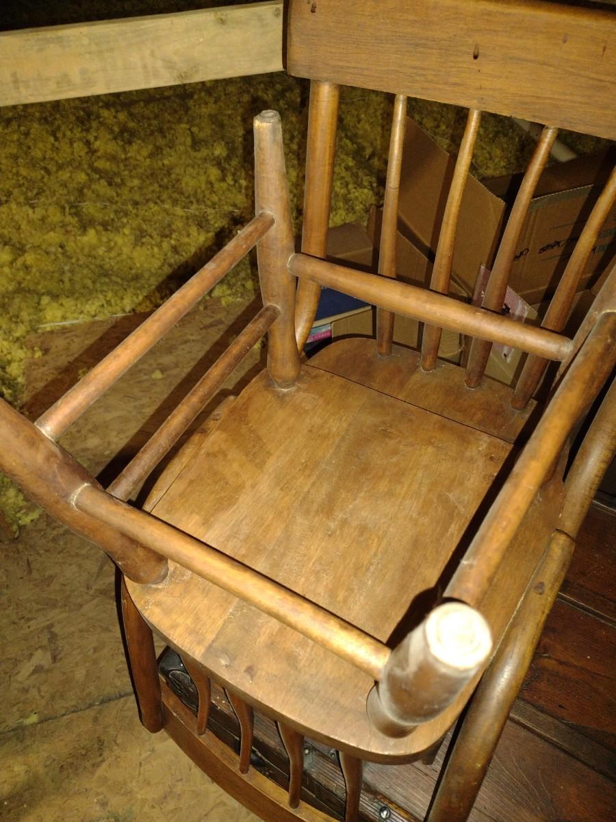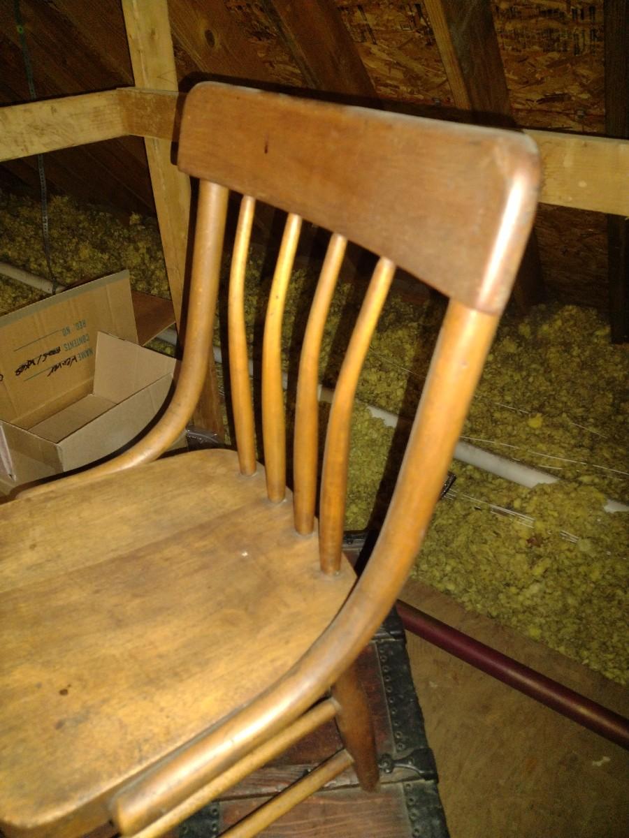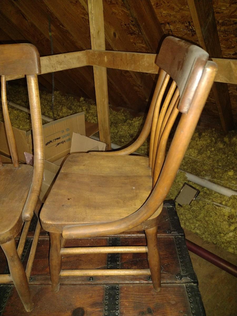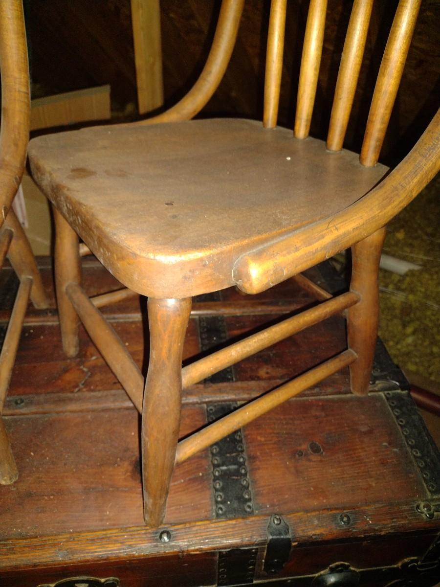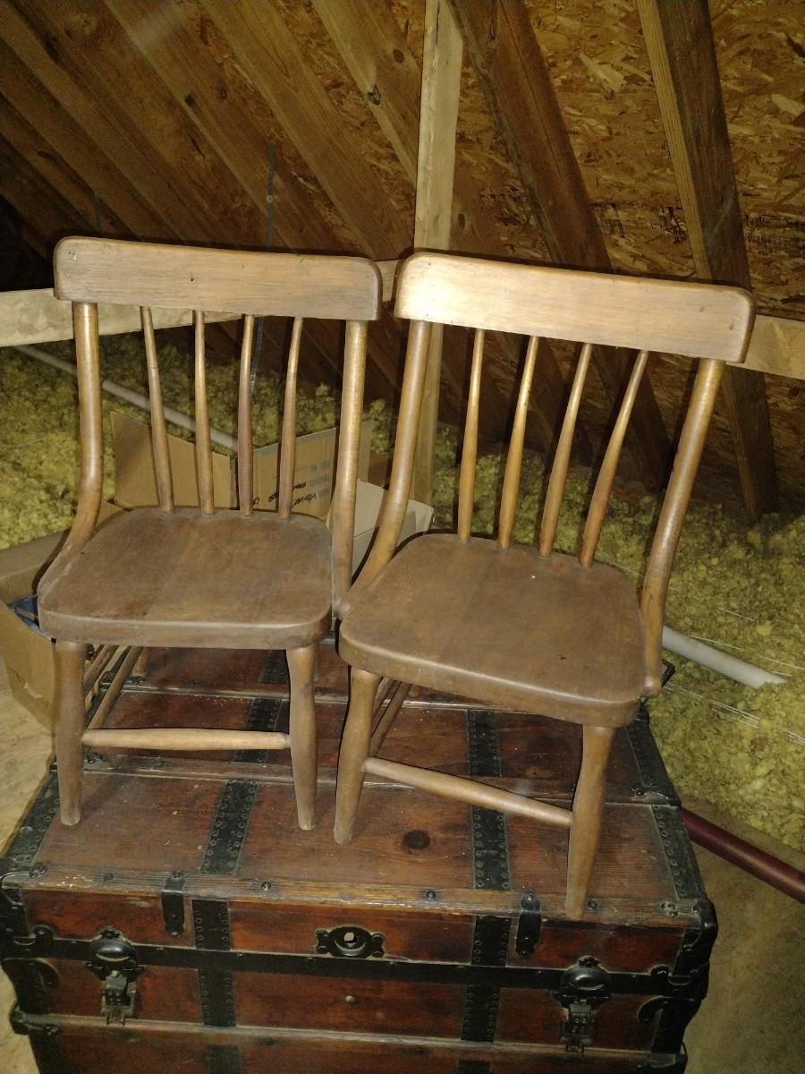 Pair of Antique Solid Wood Curved Spindle Back Chairs upstairs item. Please bring assistance to remove from the home.