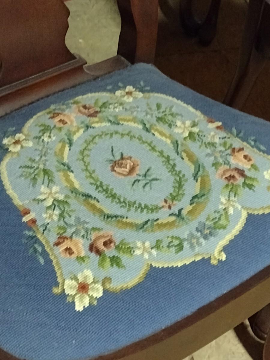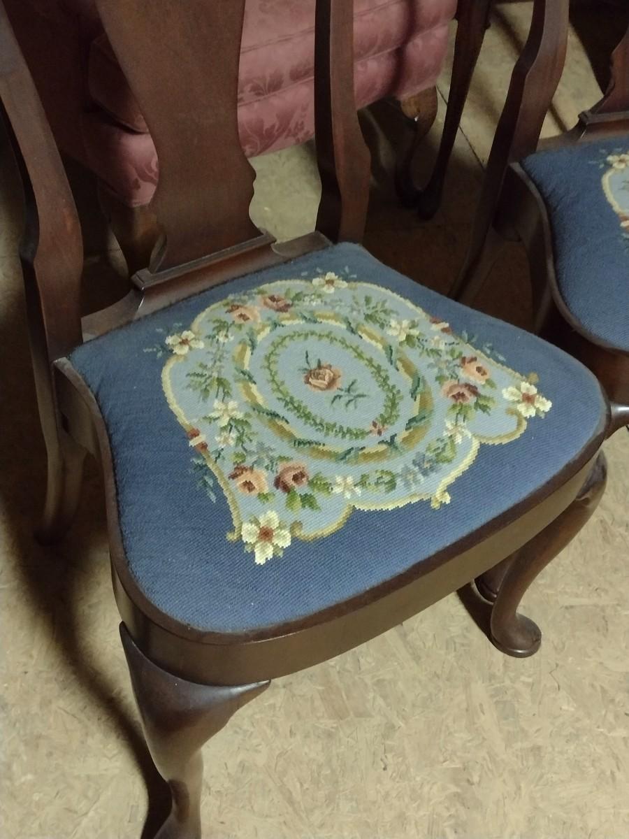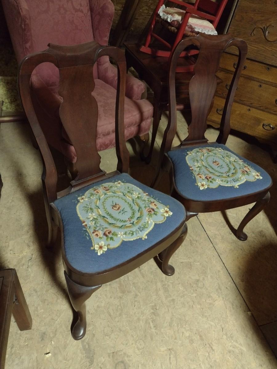 Pair of Urn Back Chairs with Embroidered Seats upstairs item. Please bring assistance to remove from the home.