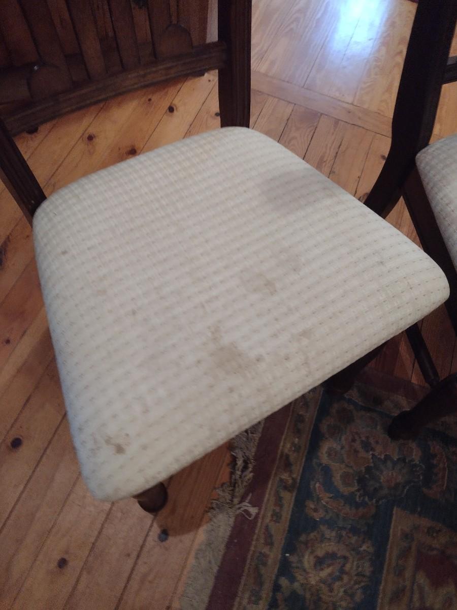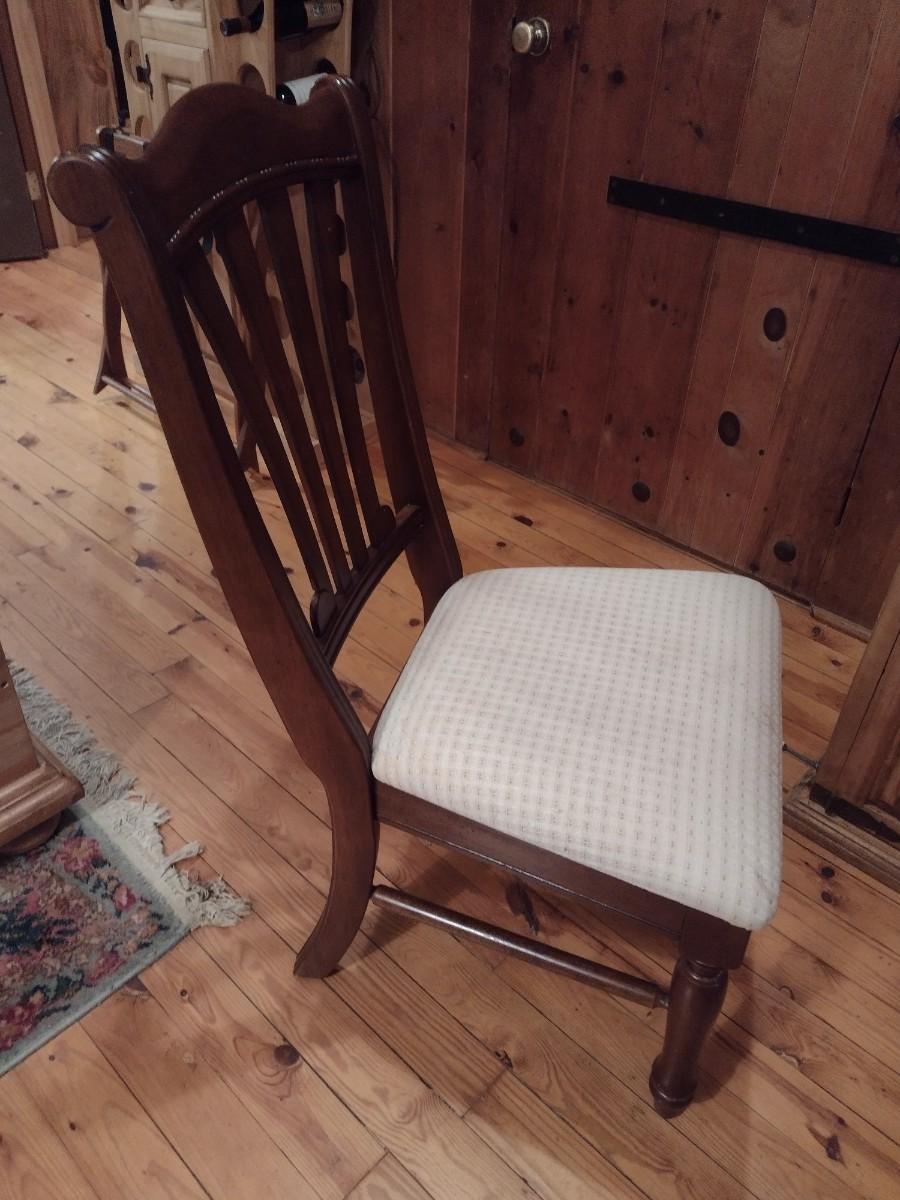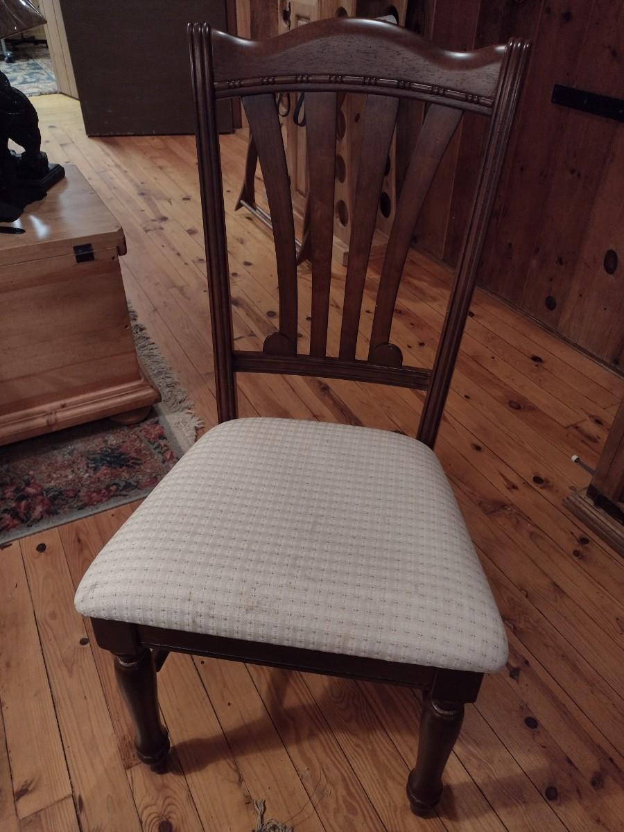 Set of Six Wood Framed Dining Chairs with Upholstered Seats. Seats will need to be cleaned. PLEASE NOTE:. Due to no internet connection or wireless service, all invoices must be prepaid via PayPal, Stripe, or Zelle prior to arrival at pick up. Exact change cash onsite is acceptable but absolutely no debit or credit cards at time of pick up.