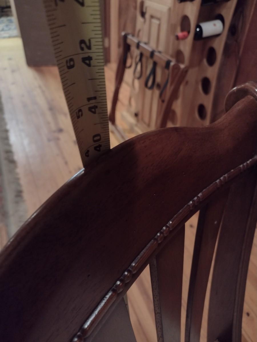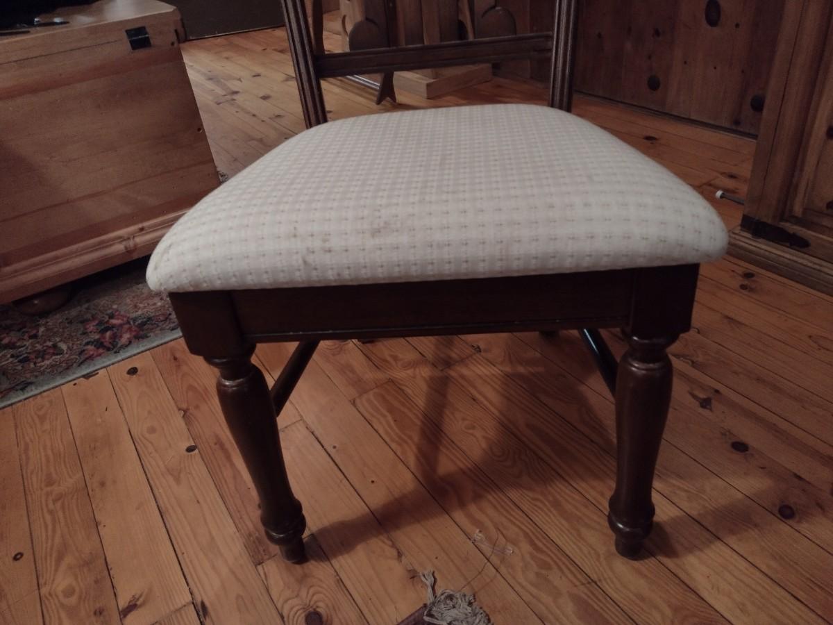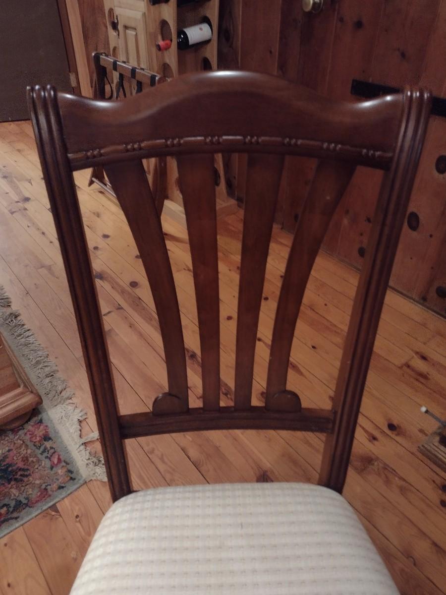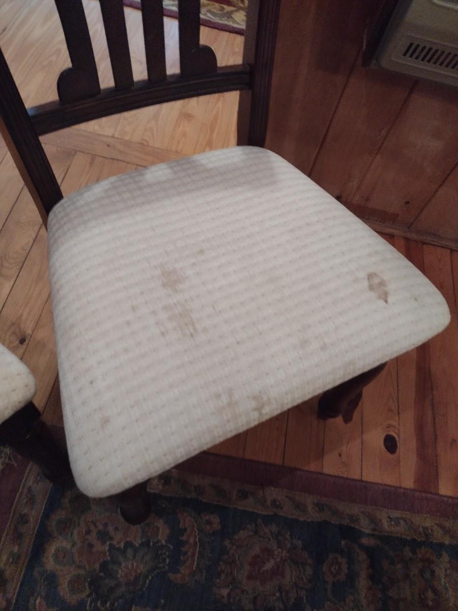Set of Six Wood Framed Dining Chairs with Upholstered Seats. Seats will need to be cleaned. PLEASE NOTE:. Due to no internet connection or wireless service, all invoices must be prepaid via PayPal, Stripe, or Zelle prior to arrival at pick up. Exact change cash onsite is acceptable but absolutely no debit or credit cards at time of pick up.
