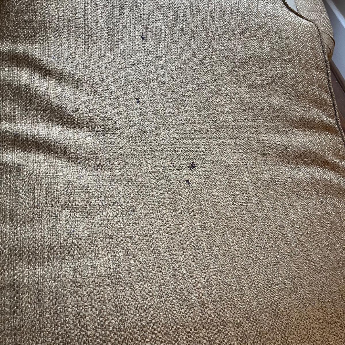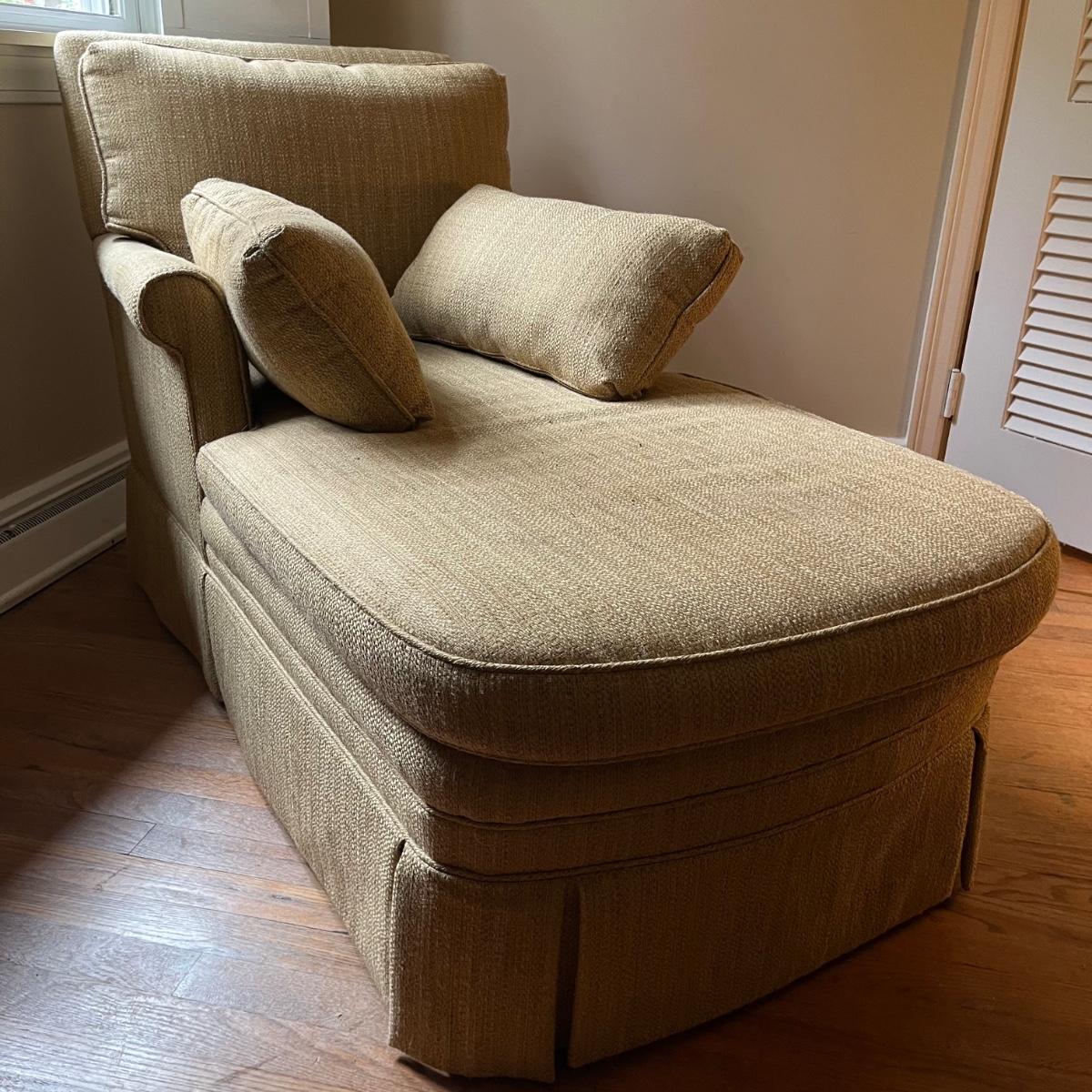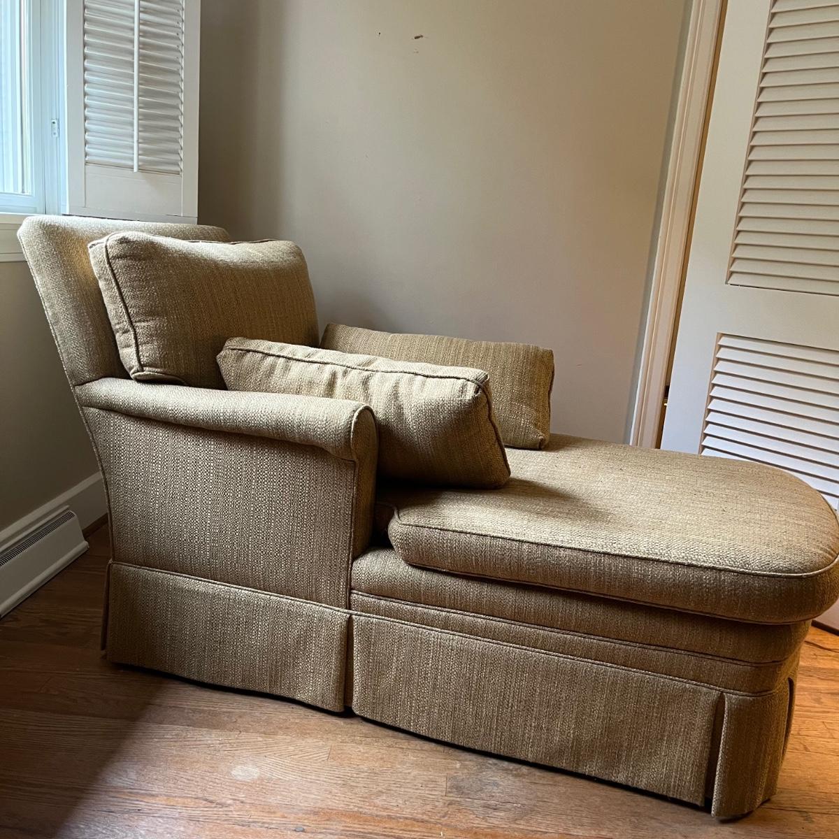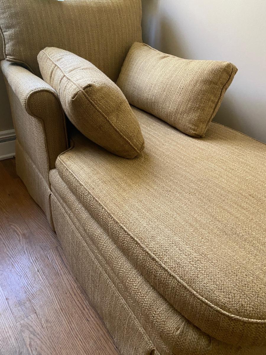 An upholstered Chaise Lounge that measures 30.5” x 55” x 33” with a seat height of 16.5”. Lounge is in good condition but has some spots on the bottom of the cushion, see pictures. The color is a tan color with yellow undertones. The last photo is a good indication of the color.