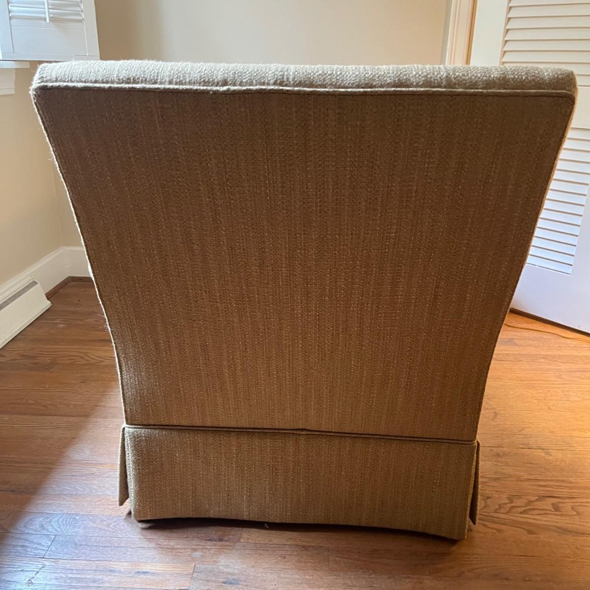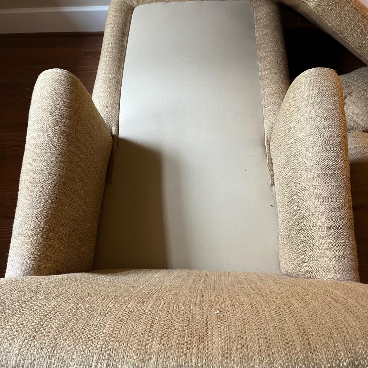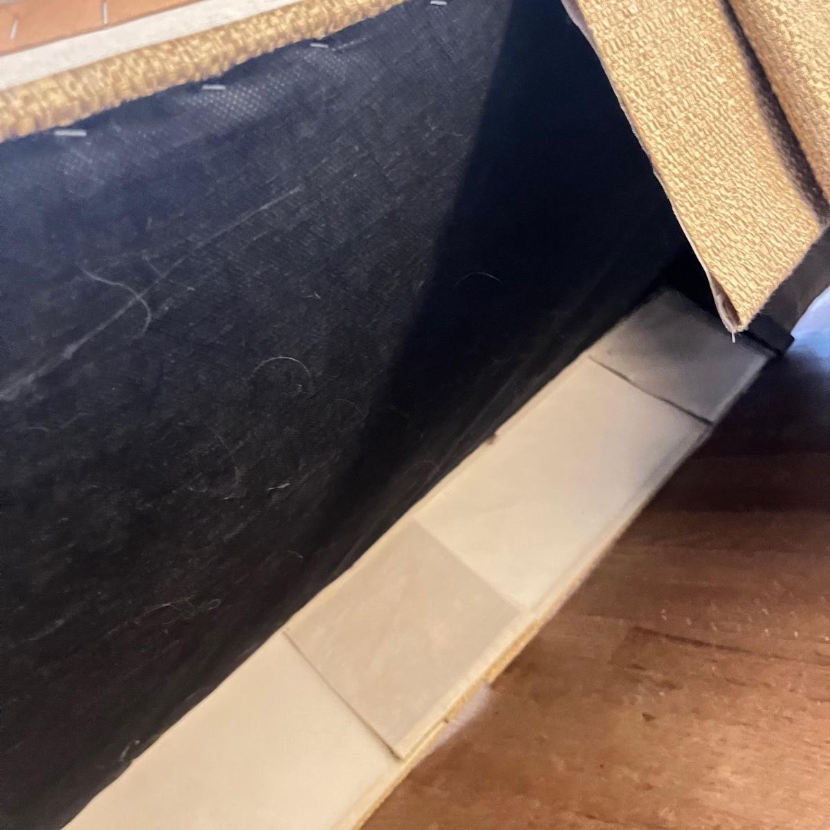 An upholstered Chaise Lounge that measures 30.5” x 55” x 33” with a seat height of 16.5”. Lounge is in good condition but has some spots on the bottom of the cushion, see pictures. The color is a tan color with yellow undertones. The last photo is a good indication of the color.