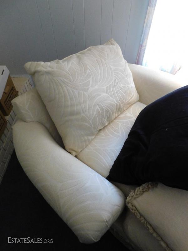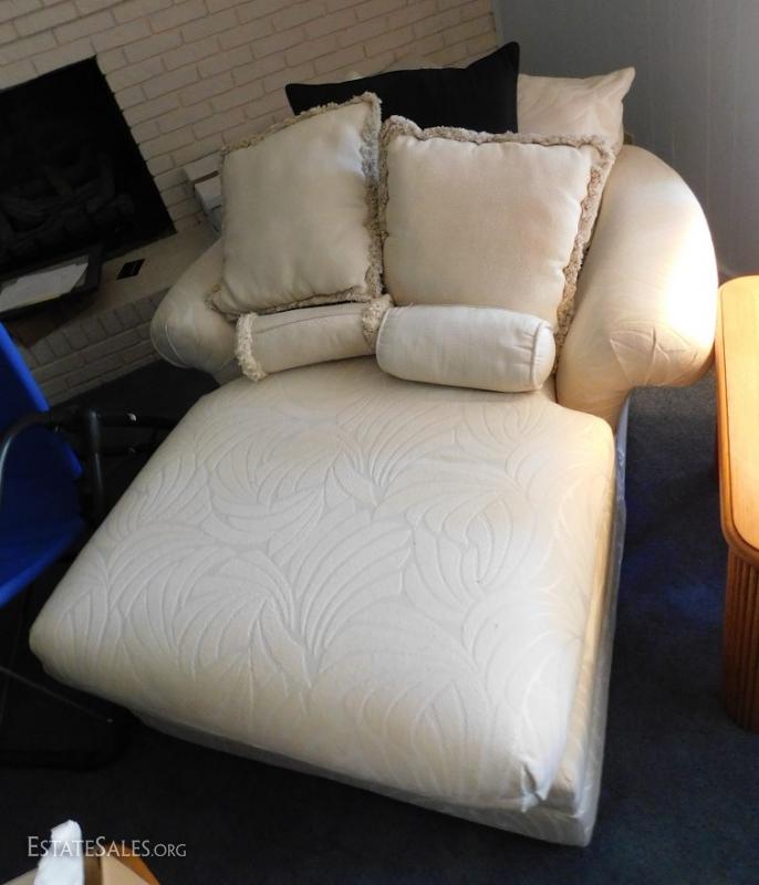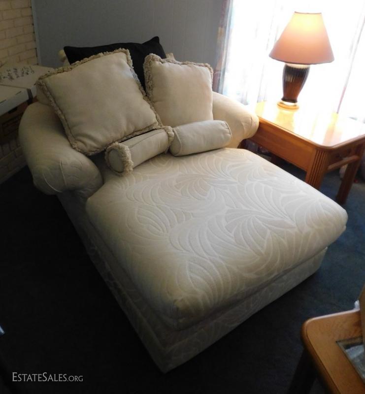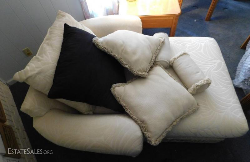 Clean white upholstered chaise lounge chair. Very good condition. Pillows will be part of bid.