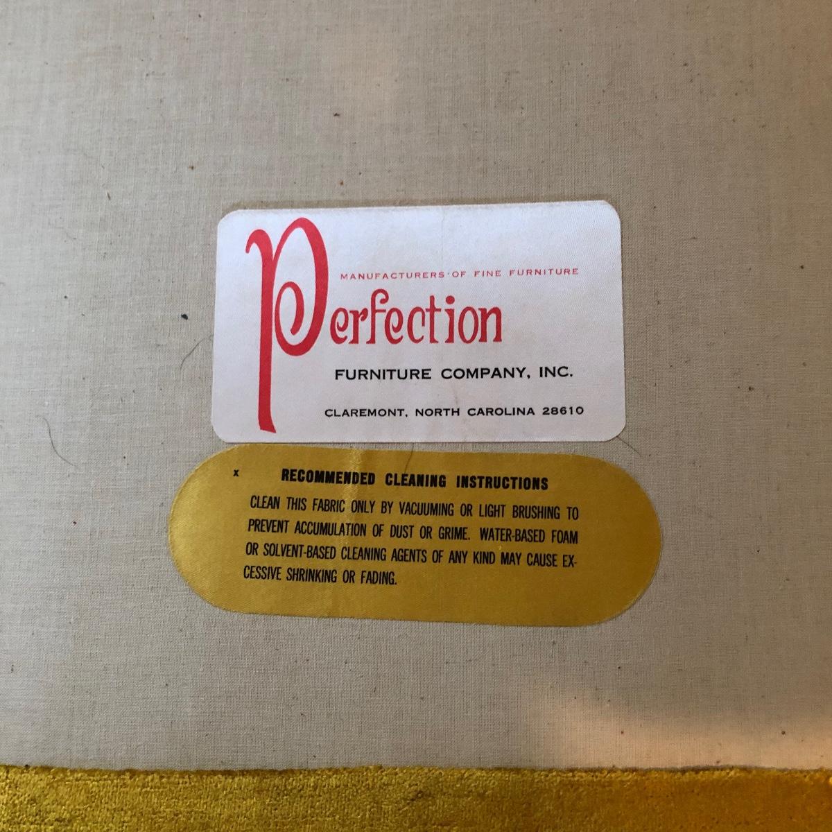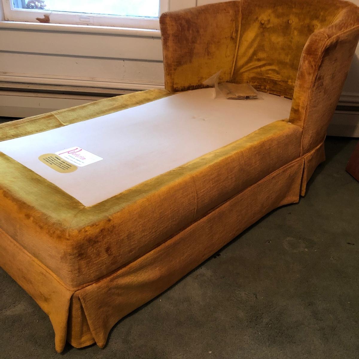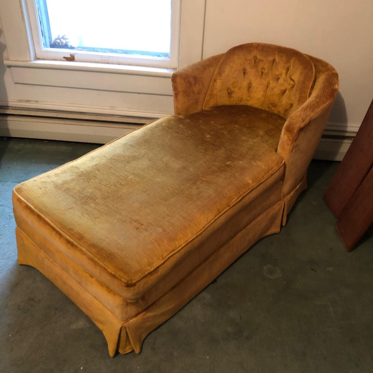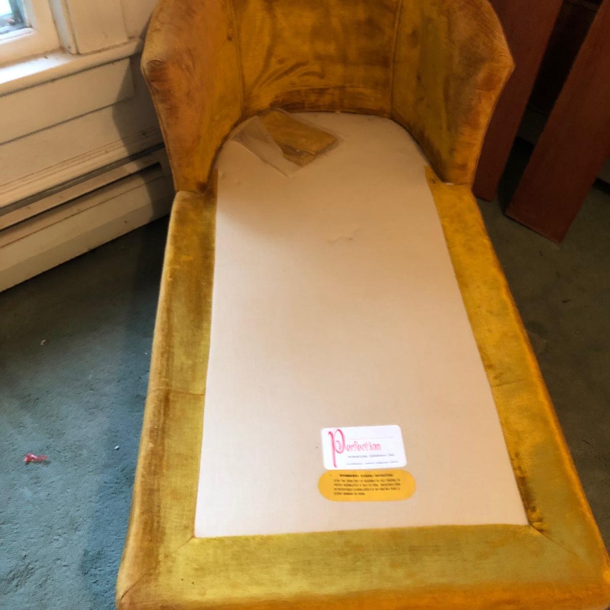 Lot includes Chaise Lounge made by Perfection Furniture Co. with removable back and bottom cushions. Lounge is in a deep gold color and is in good shape with a few wear spots on cushion, but is in overall good shape, see pictures. Lounge measures 26” x 65” x 27” with a seat height of 17”. Bring help item is substantial and up one flight of stairs.