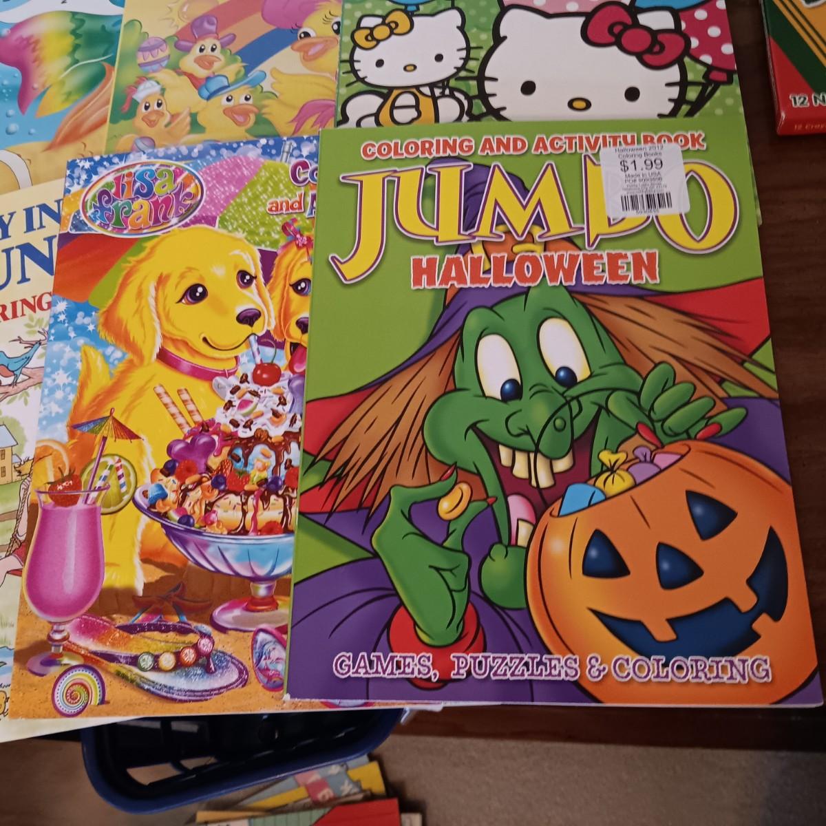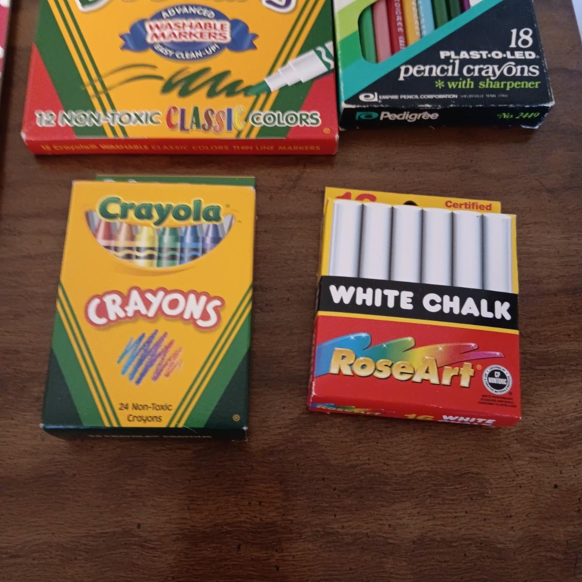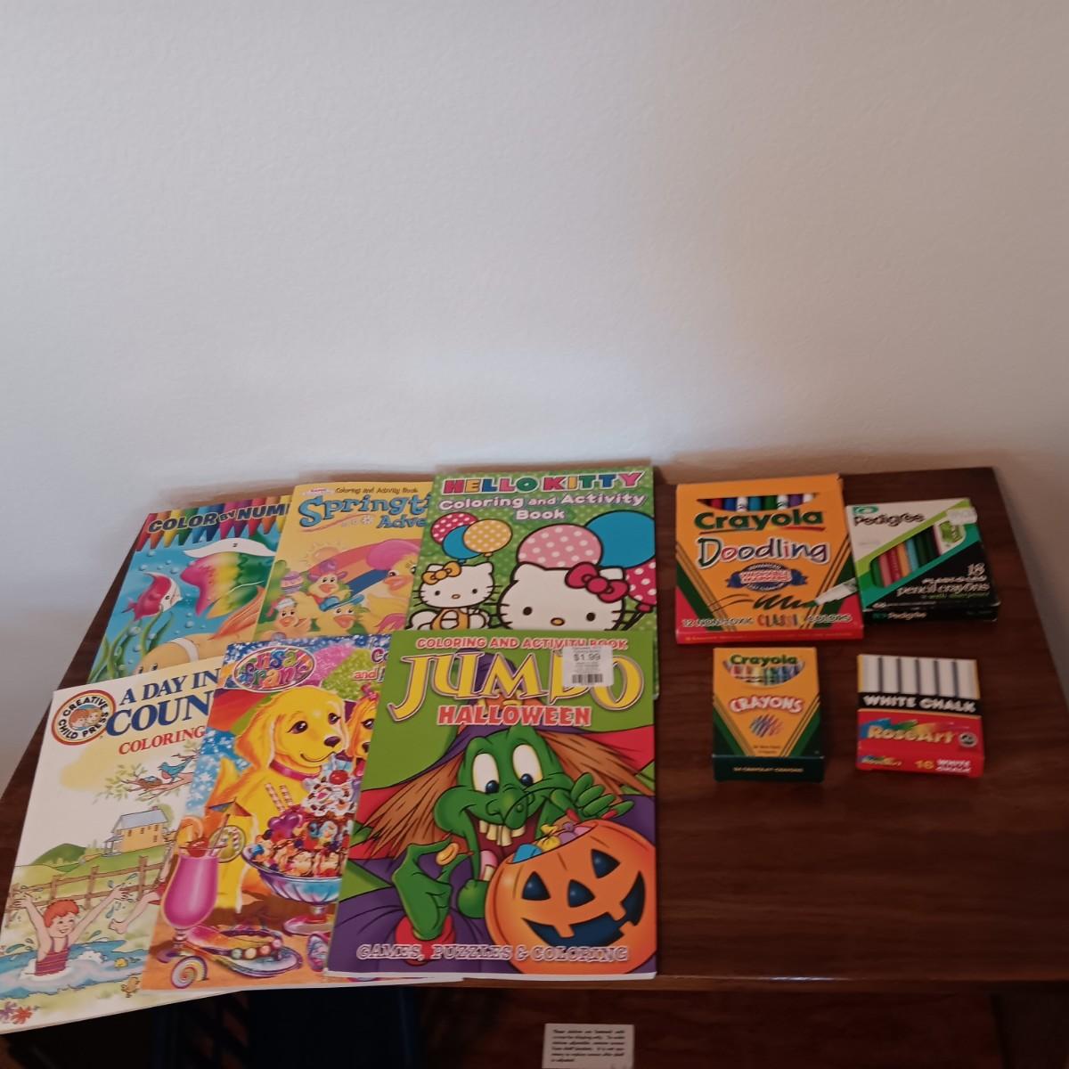 CHALK, COLORED PENCILS, MARKERS AND COLORING BOOKS