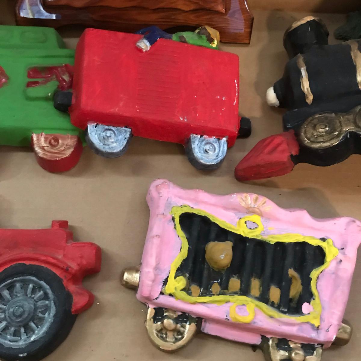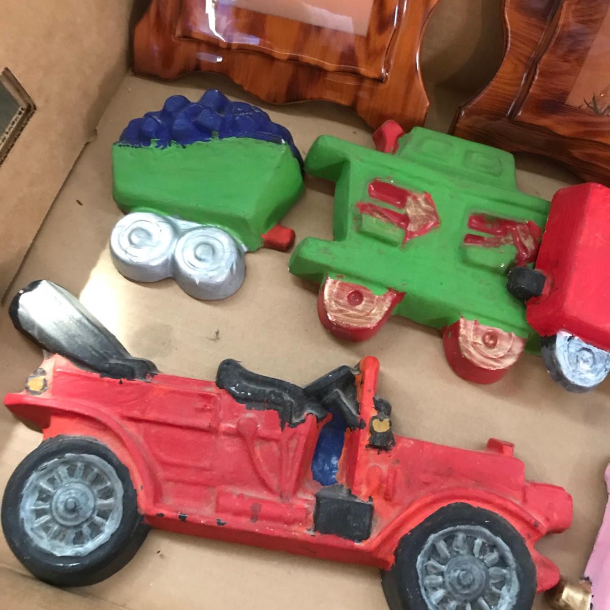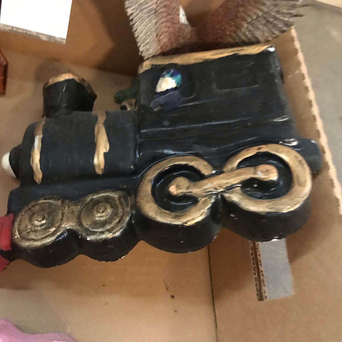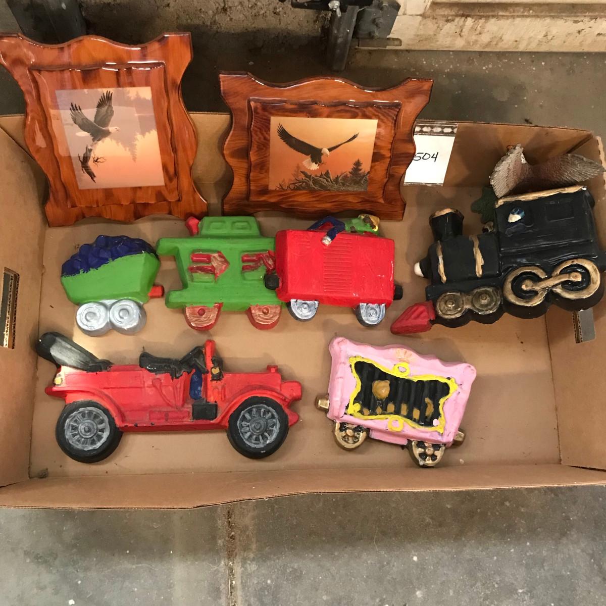 Home made chalkware train & car. With eagle prints