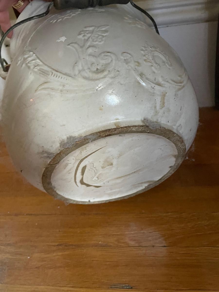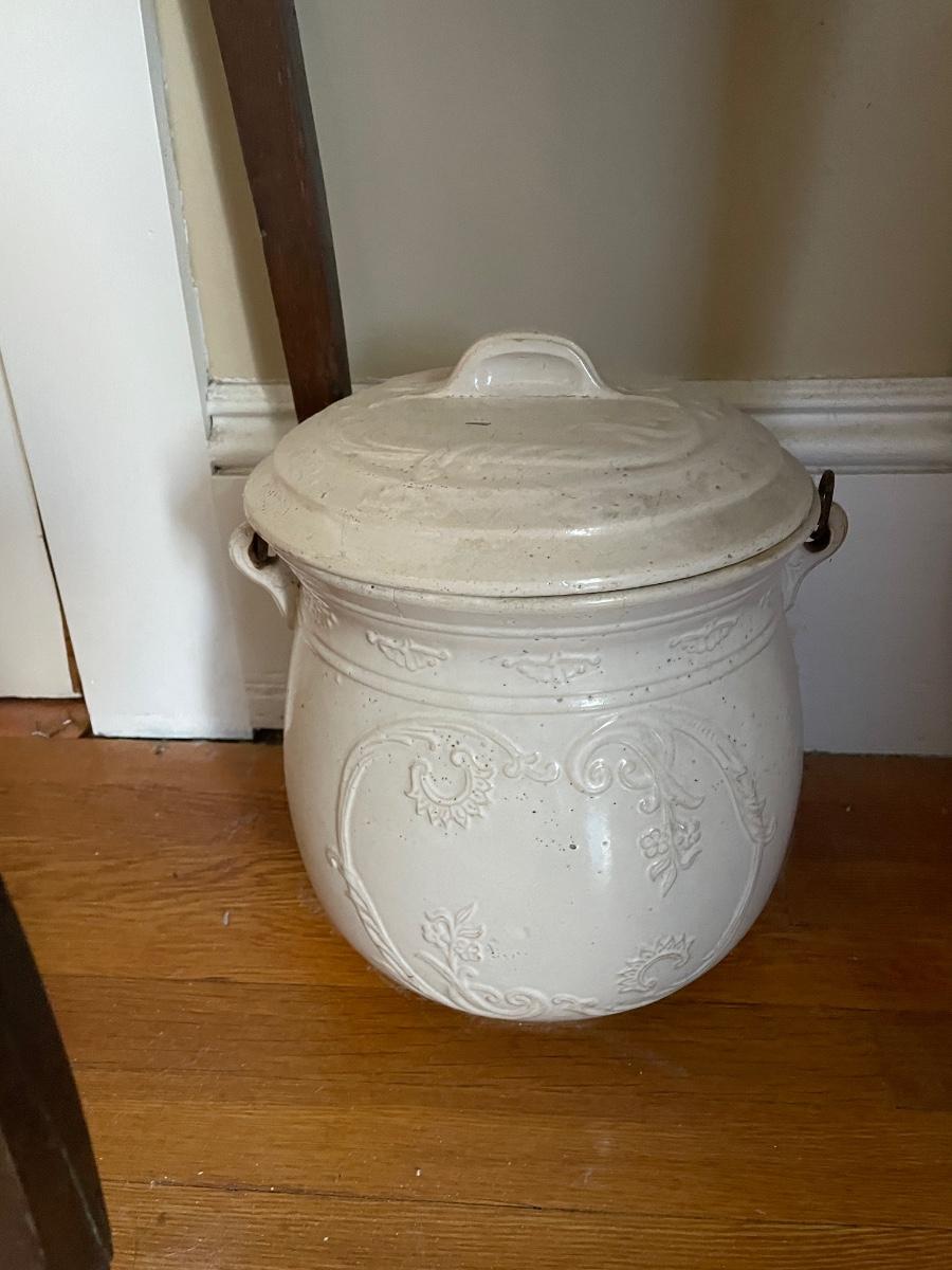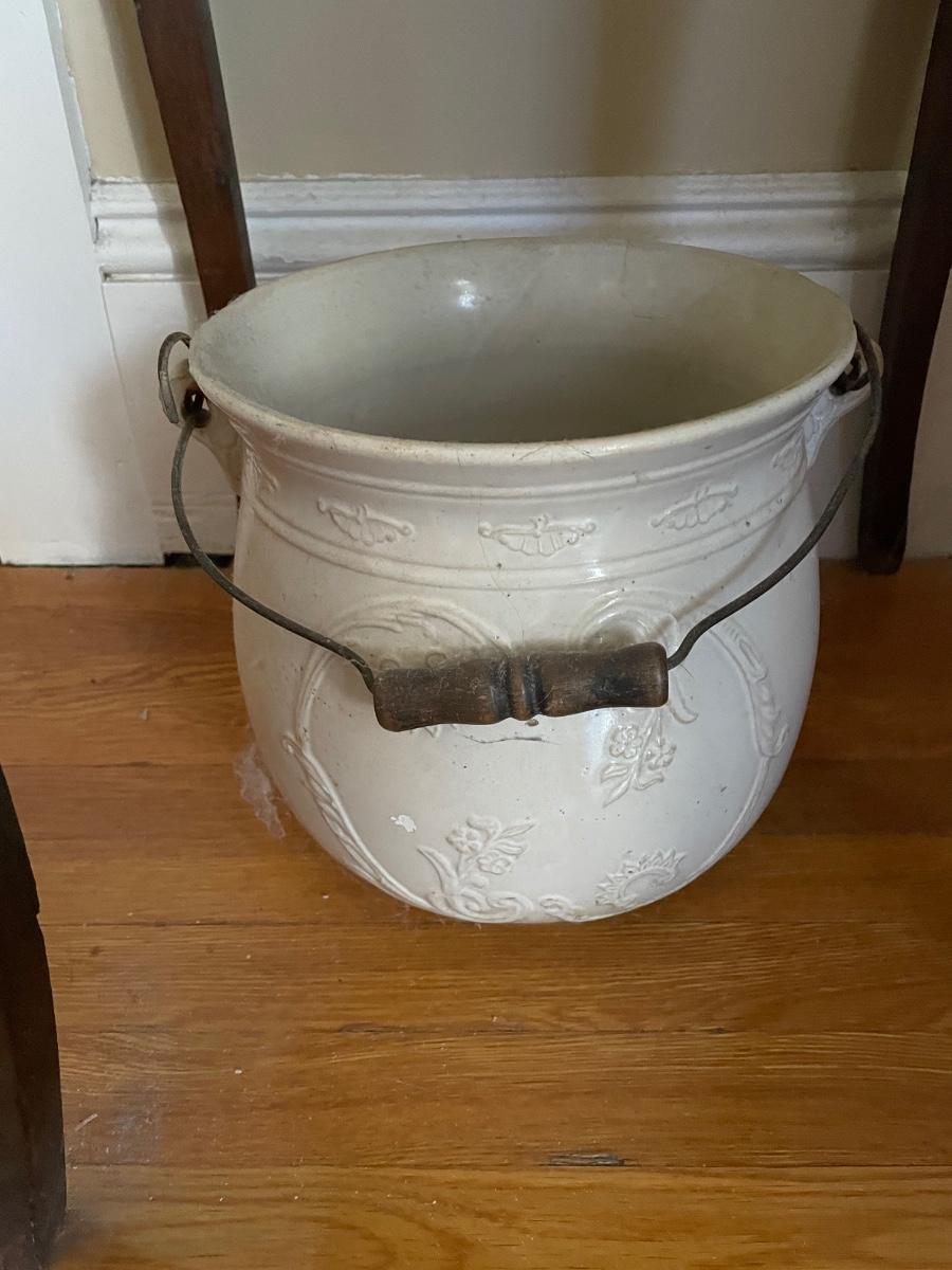Antique chamber pot with lid. Looks like it has a repair on the lid. Has wear.